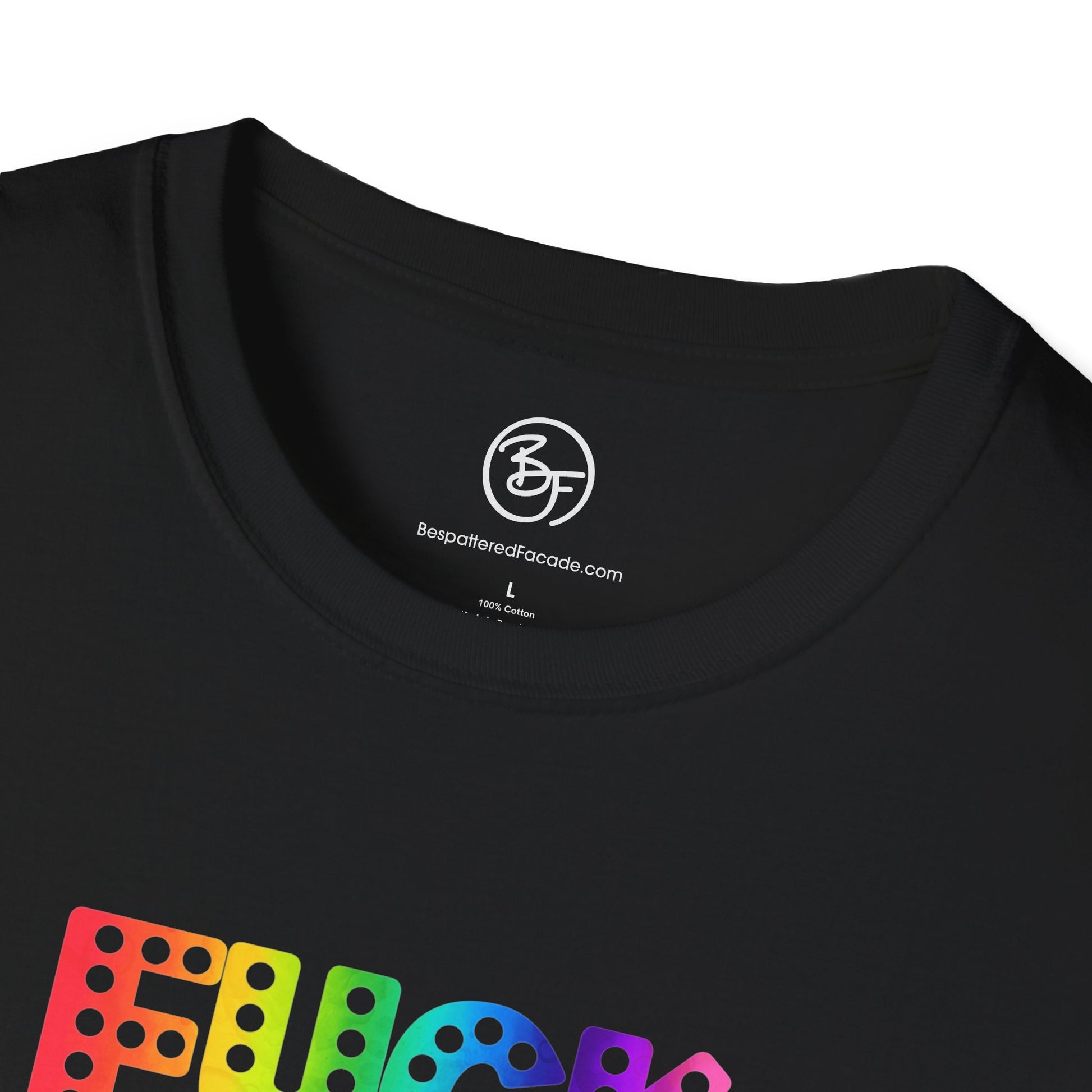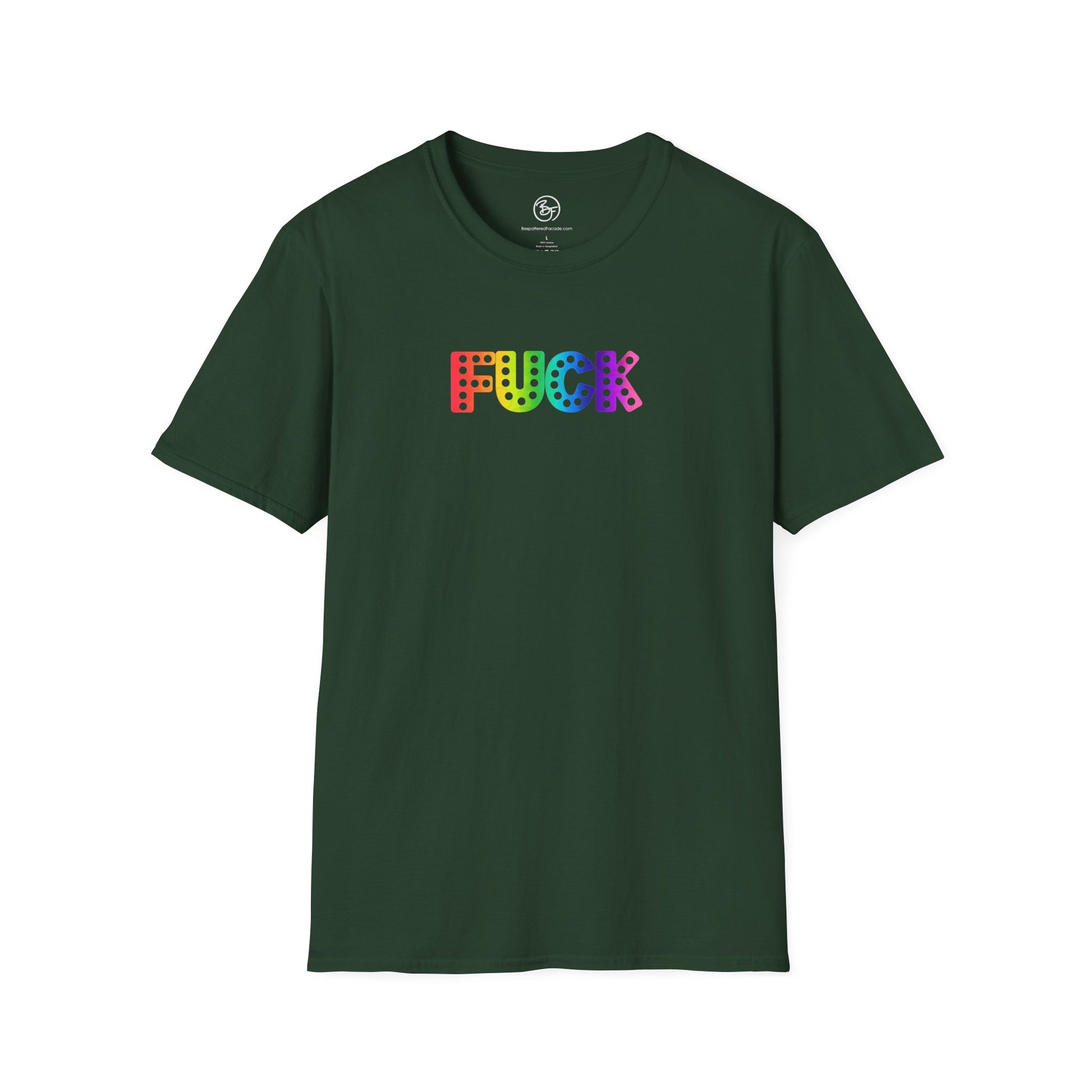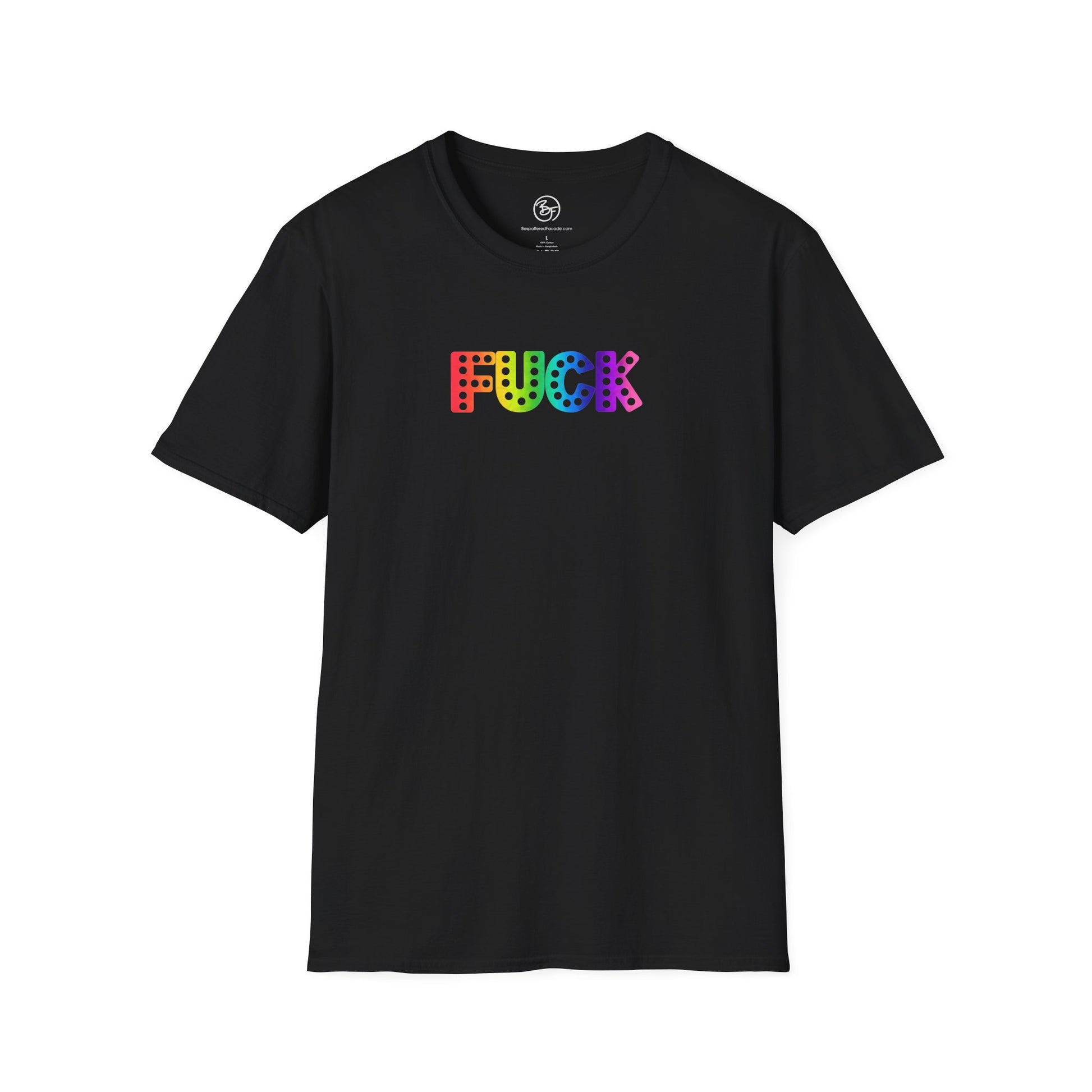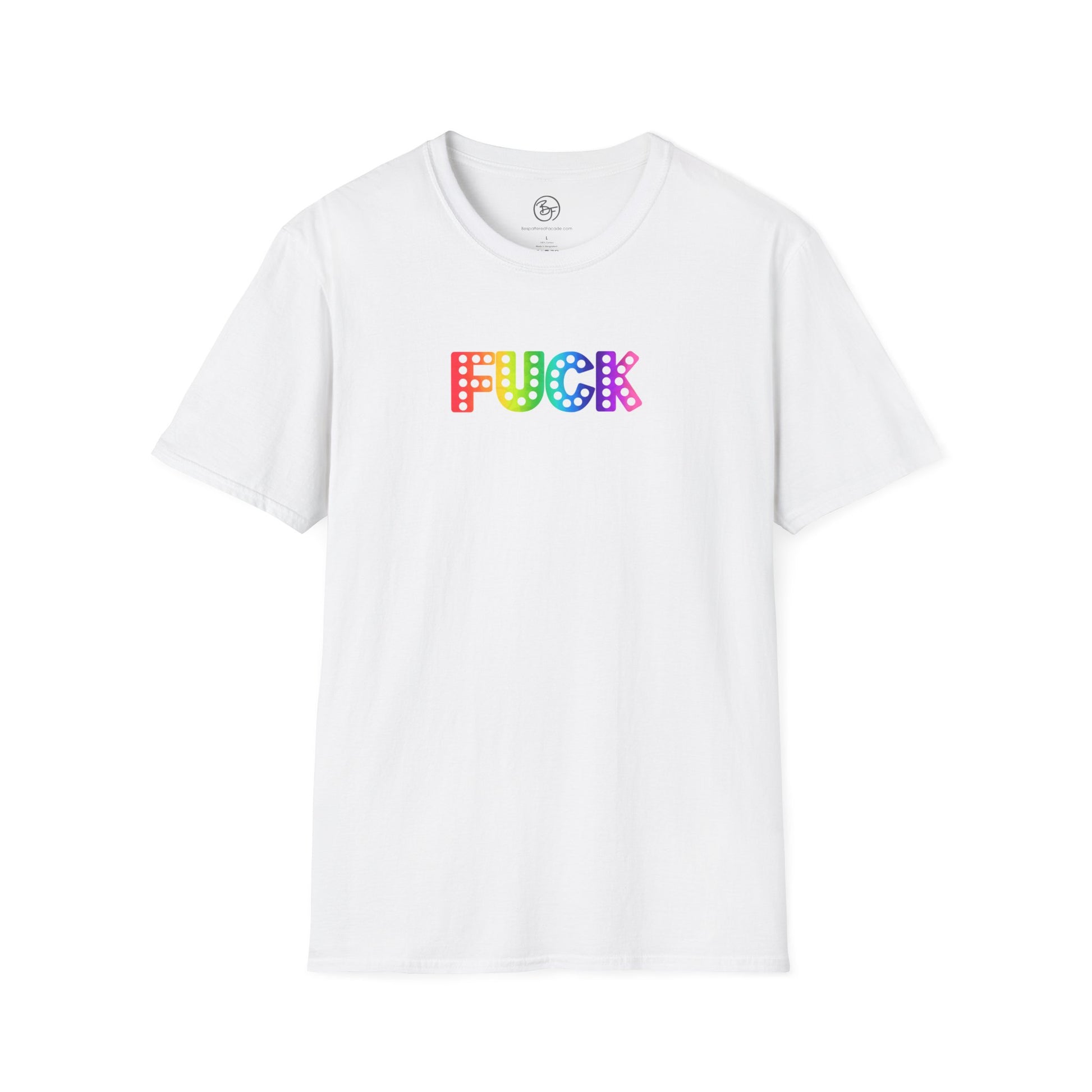This unisex soft-style t-shirt features a rainbow gradient version of Everyone's Favorite Word. Made from very soft materials, this tee is 100% cotton for solid colors. Heather colors and sports grey include polyester. The shoulders have twill tape for improved durability. There are no side seams. The collar is made with ribbed knitting to prevent curling damage.