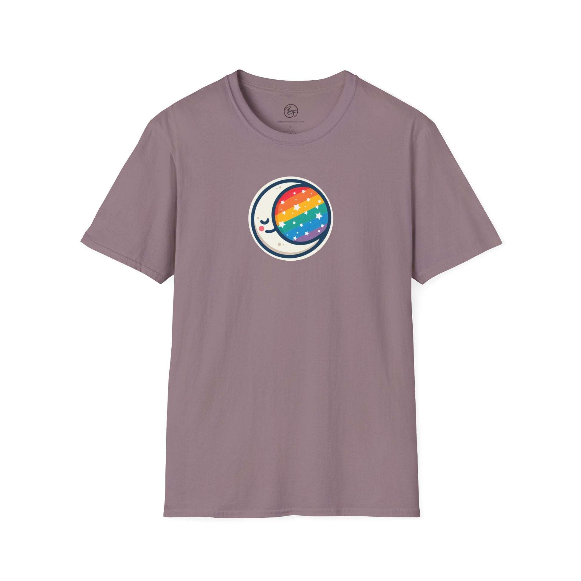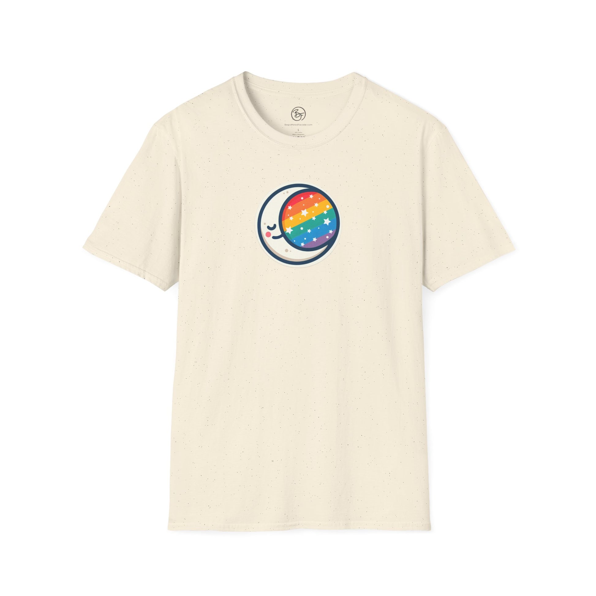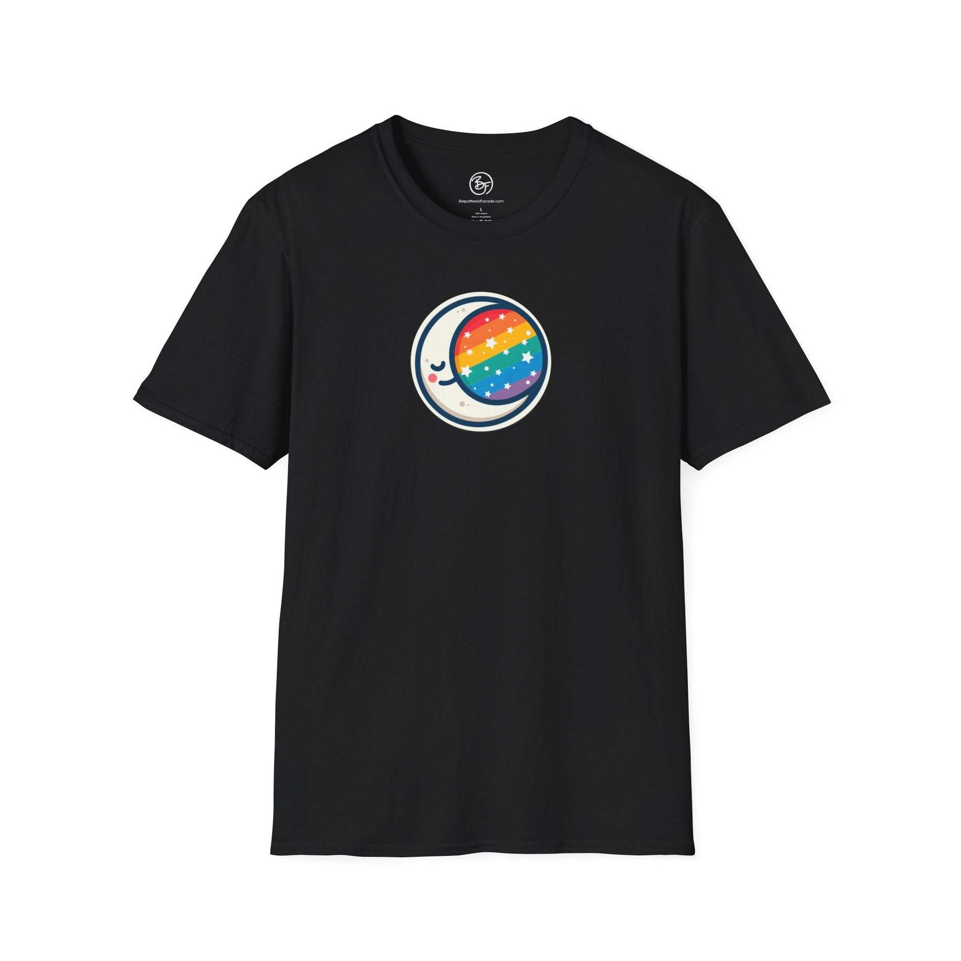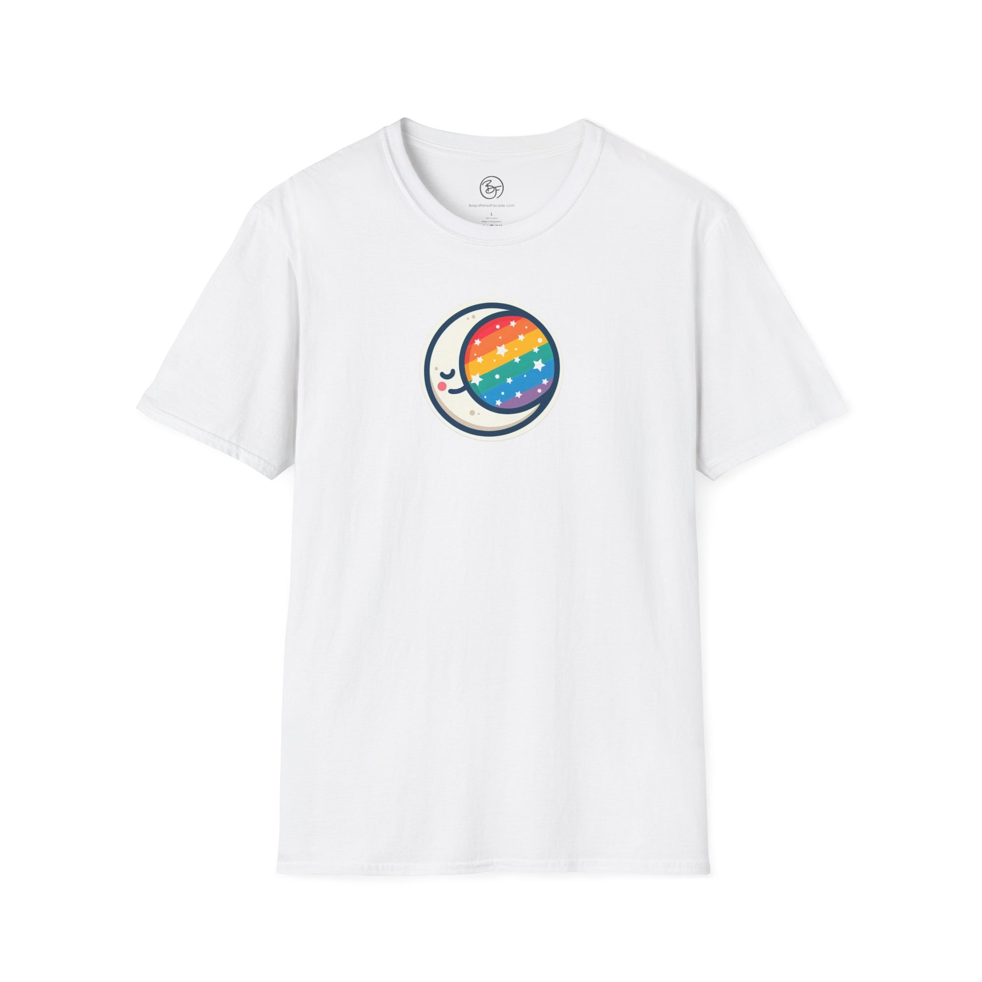 This unisex soft-style t-shirt features a sleepy moon with a rainbow sky scattered with stars. Made from very soft materials, this tee is 100% cotton for solid colors. Heather colors and sports grey include polyester. The shoulders have twill tape for improved durability. There are no side seams. The collar is made with ribbed knitting to prevent curling damage.