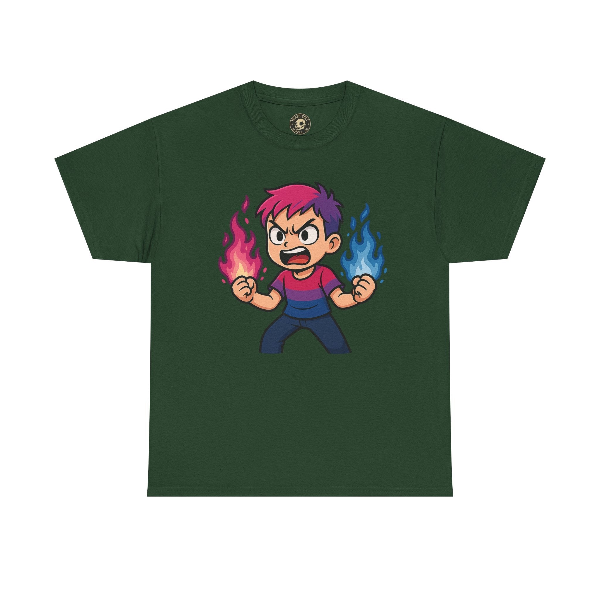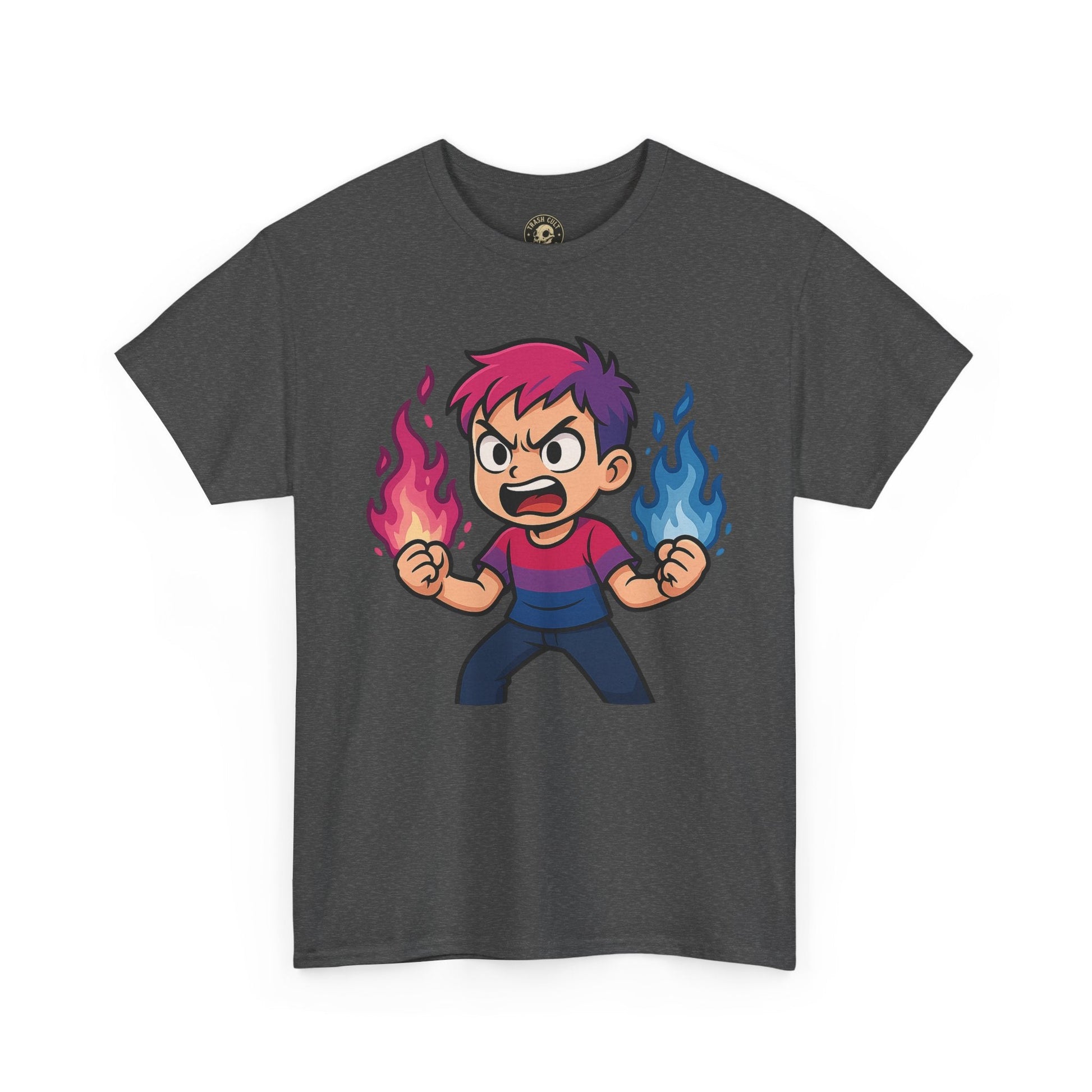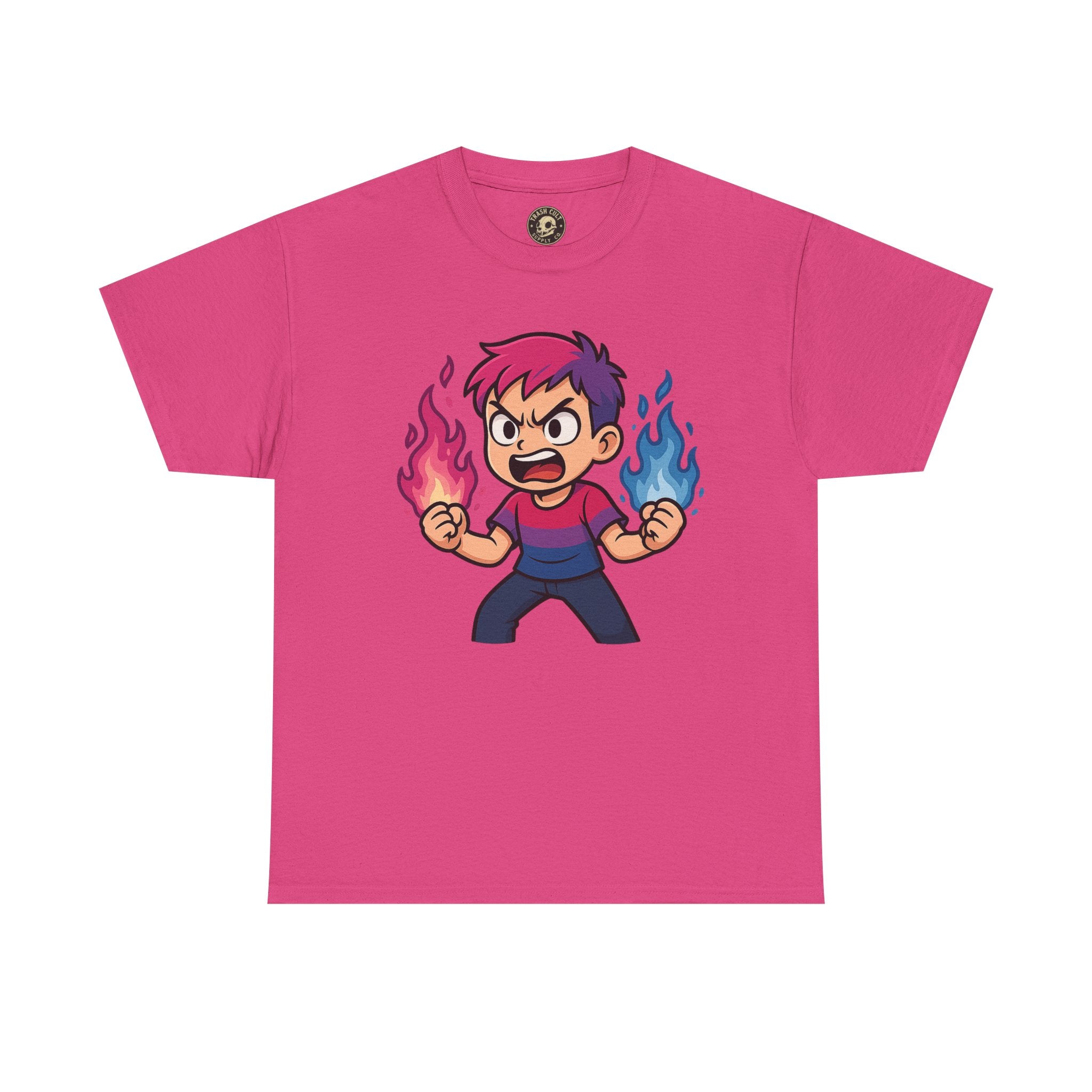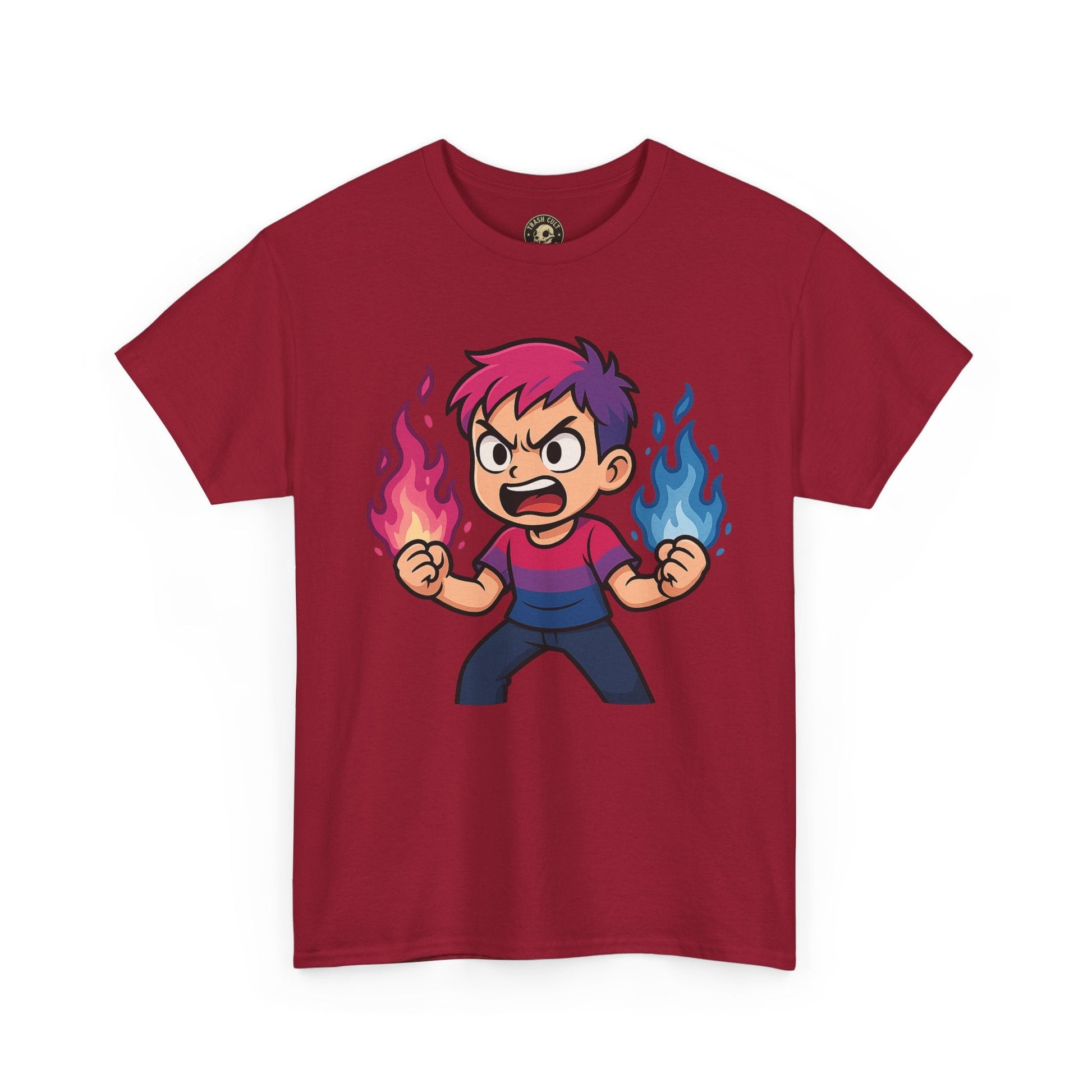Unleash unapologetic energy with the Bi-Furious Tee, a high-impact design that celebrates identity with bold style and fiery attitude. This shirt isn’t just clothing—it’s a statement. Featuring an exclusive anime-inspired character radiating chaotic bi pride power, this graphic pops with color and personality. With blue and magenta flames in each hand and a battle-ready pose, this design is built for those who live out loud and aren't afraid to take up space.