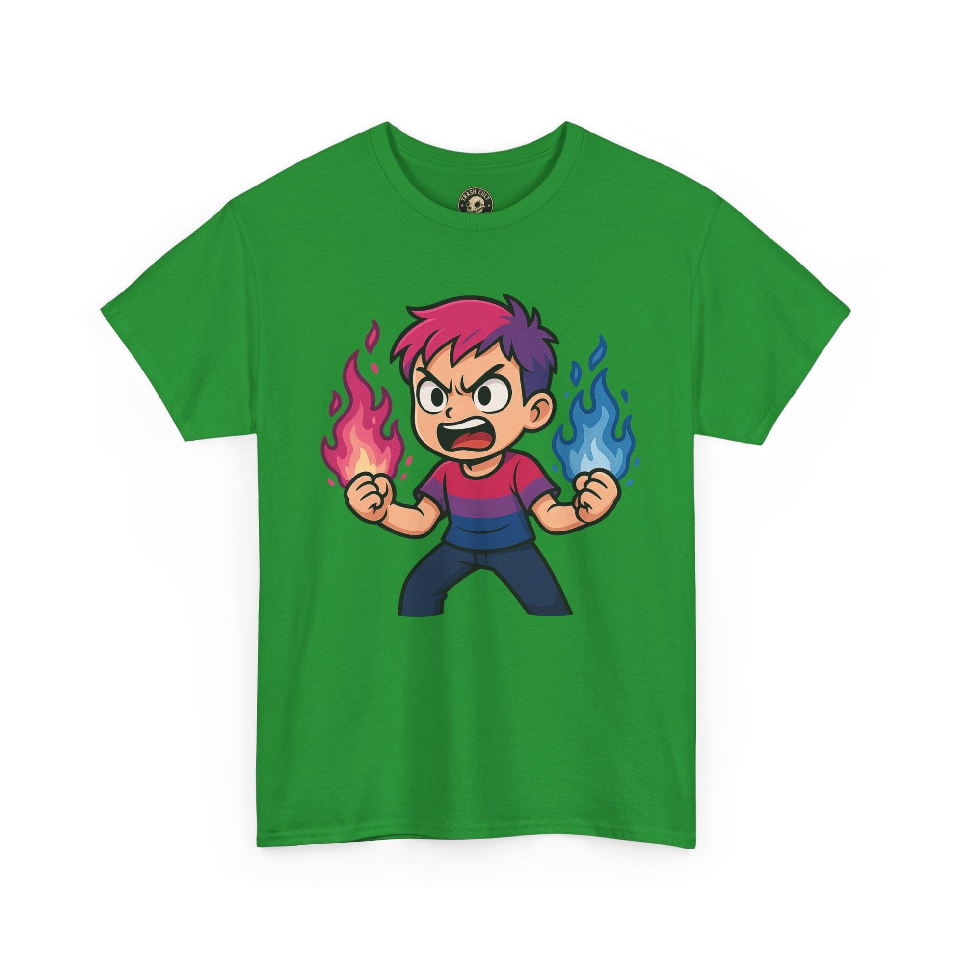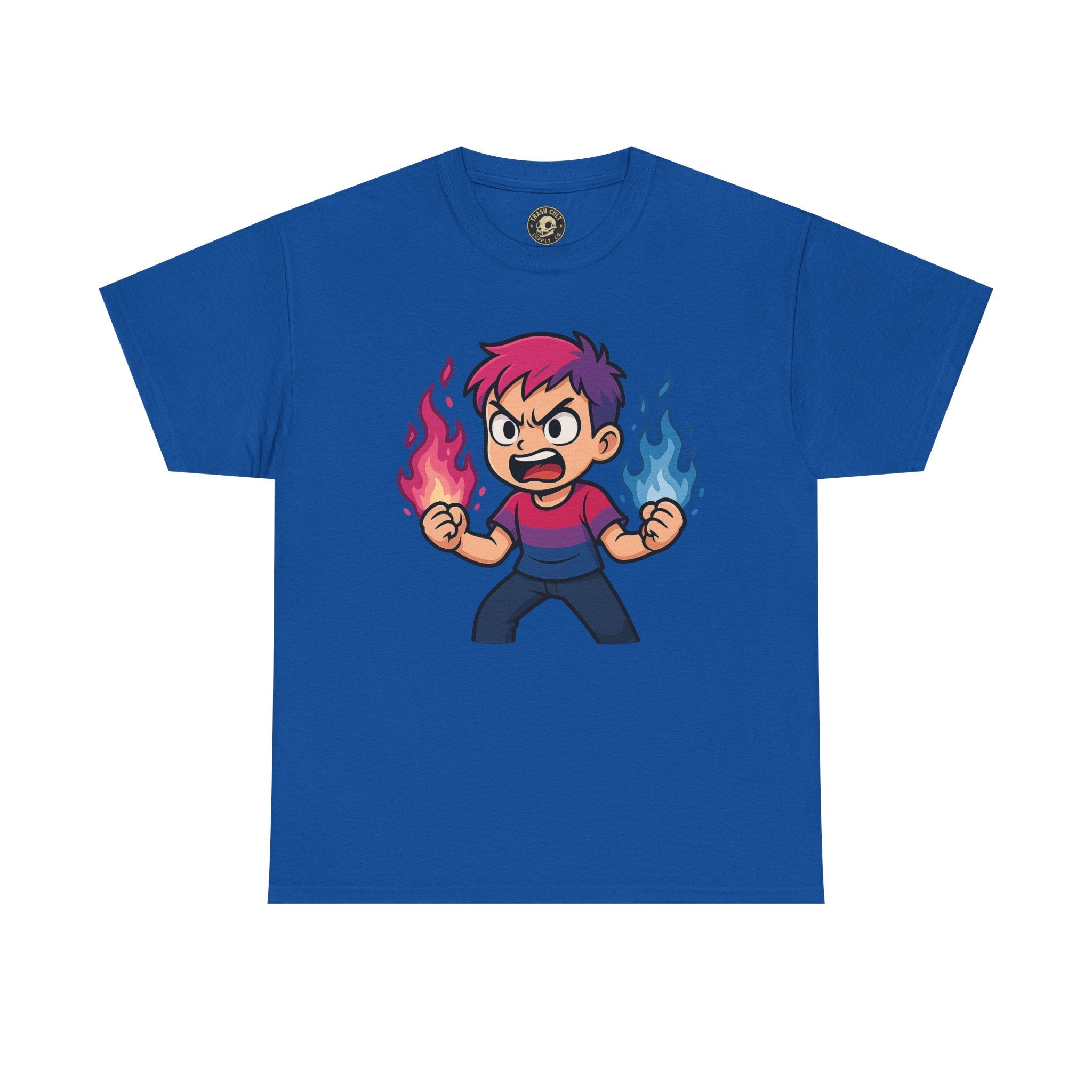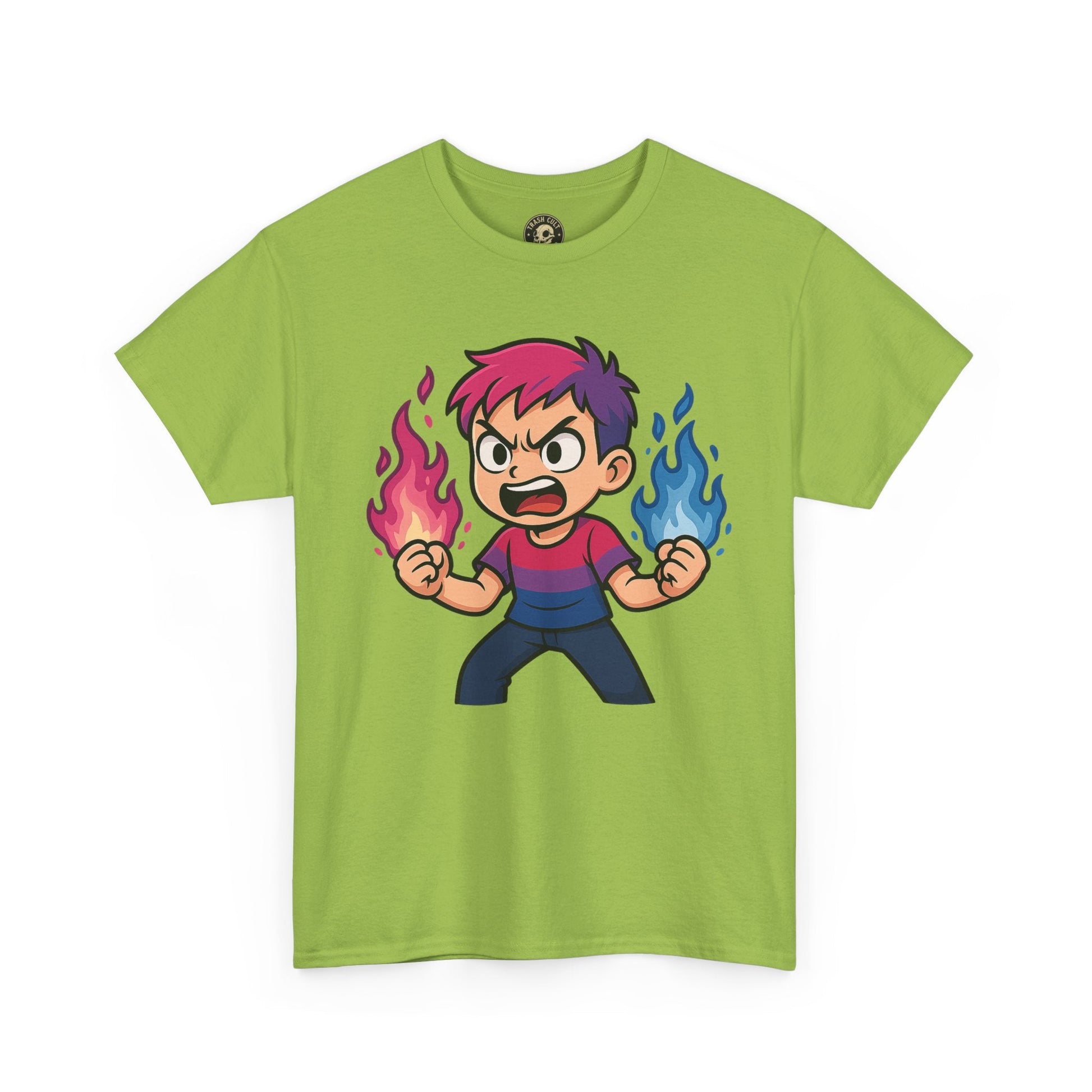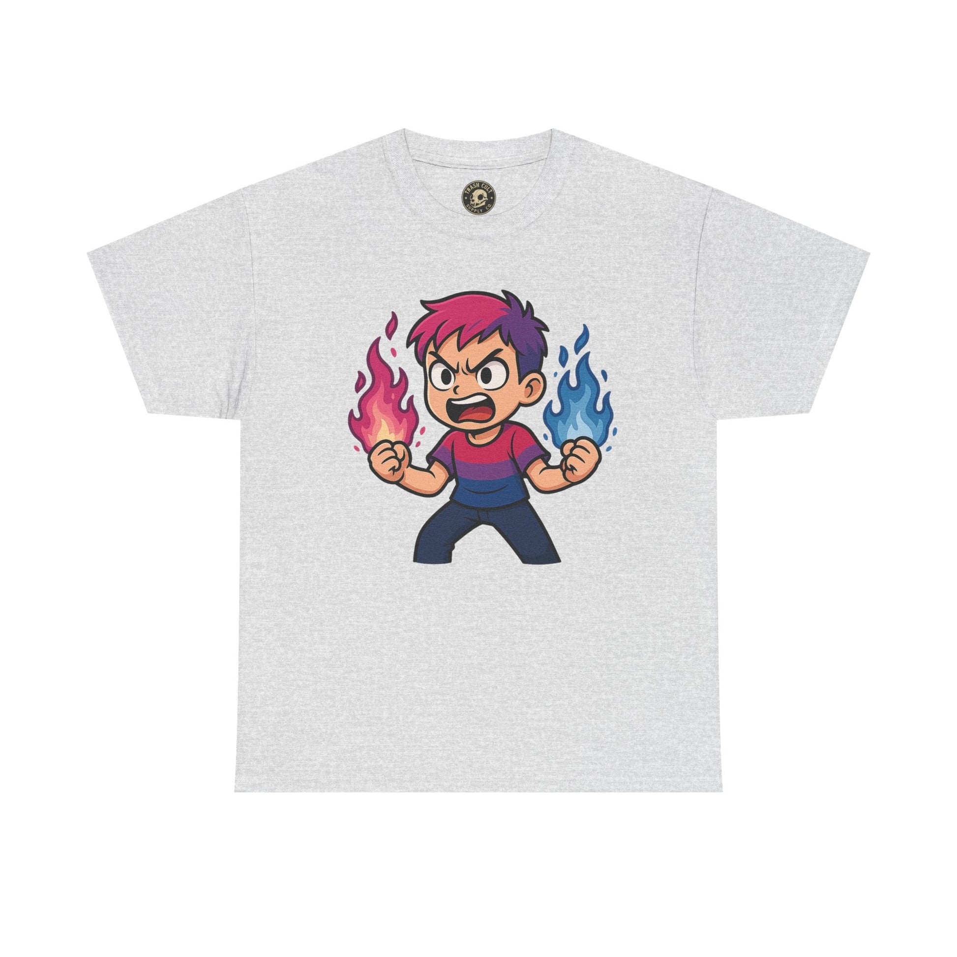 Unleash unapologetic energy with the Bi-Furious Tee, a high-impact design that celebrates identity with bold style and fiery attitude. This shirt isn’t just clothing—it’s a statement. Featuring an exclusive anime-inspired character radiating chaotic bi pride power, this graphic pops with color and personality. With blue and magenta flames in each hand and a battle-ready pose, this design is built for those who live out loud and aren't afraid to take up space.