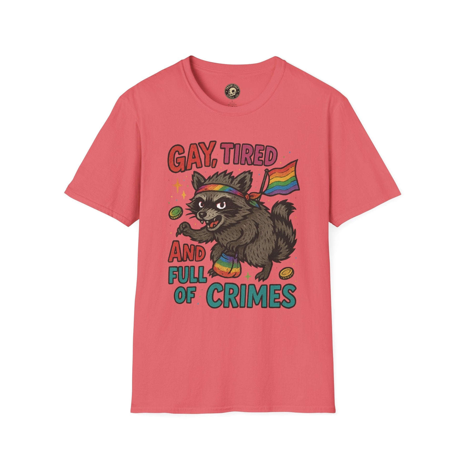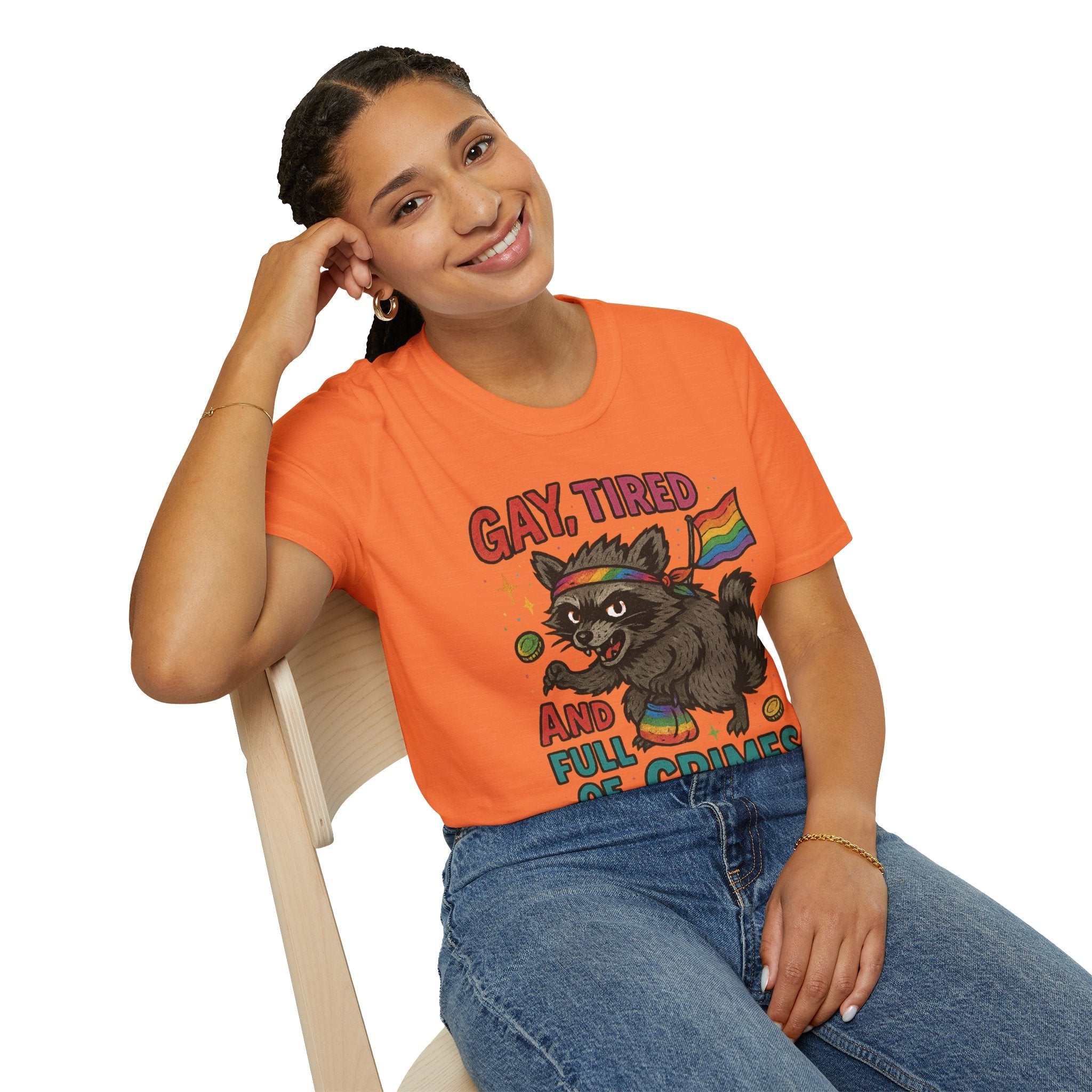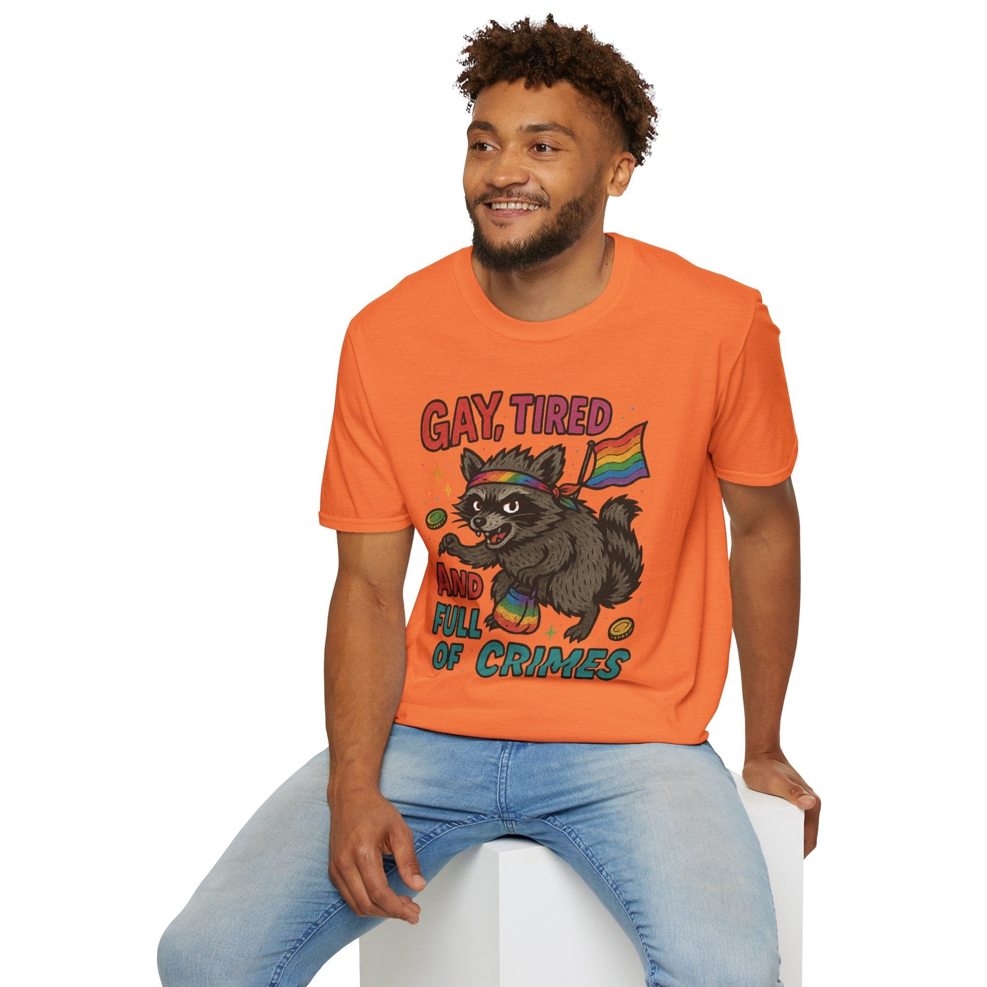 Unleash your inner chaotic queer with this “Gay, Tired, and Full of Crimes” graphic tee. Featuring a mischievous raccoon decked out in Pride gear, this hilarious design is printed on a premium Gildan Softstyle unisex T-shirt—soft, lightweight, and ready for rebellion. Perfect for Pride Month, queer events, or just loudly existing in your fabulous truth. Flaunt your feral energy with comfort and color.