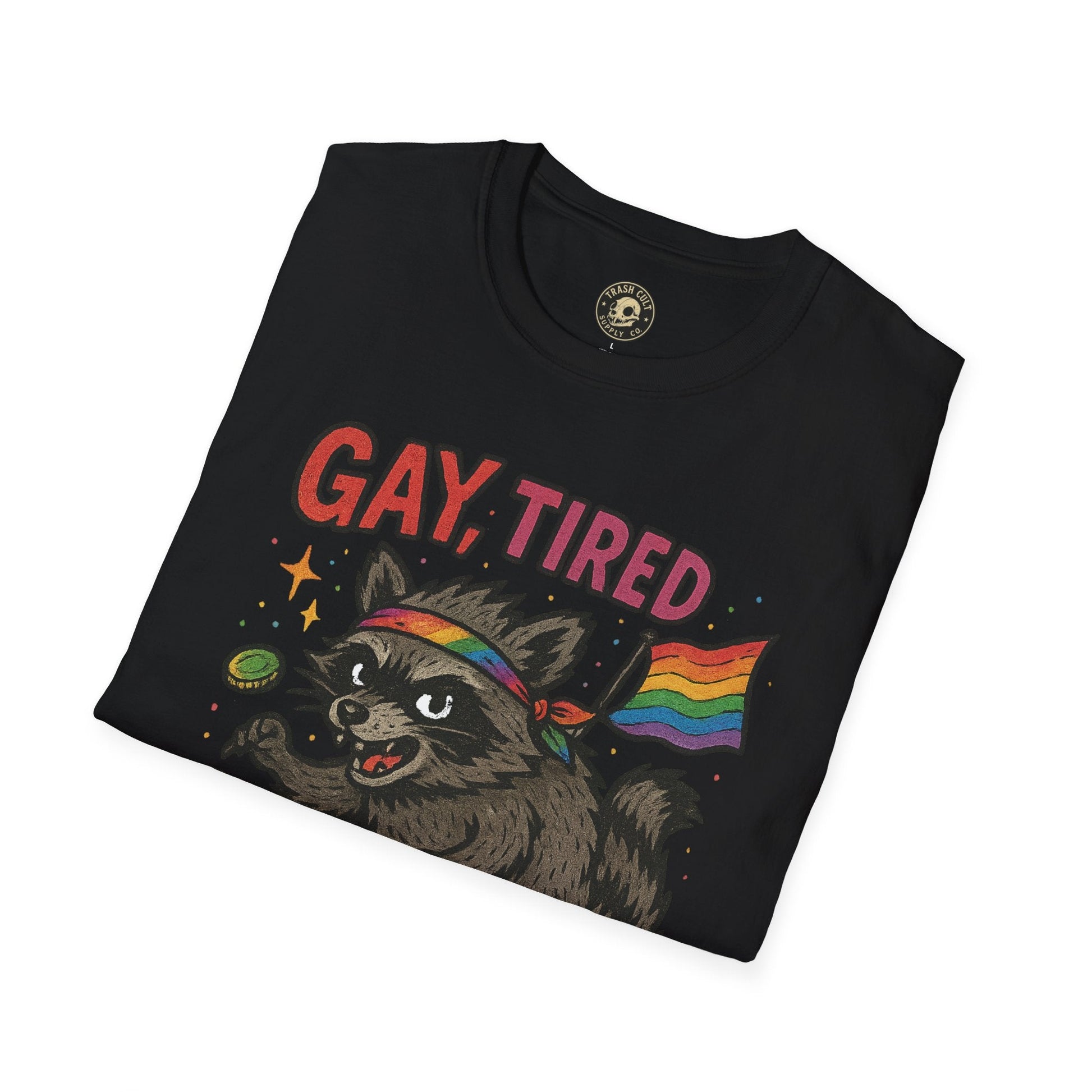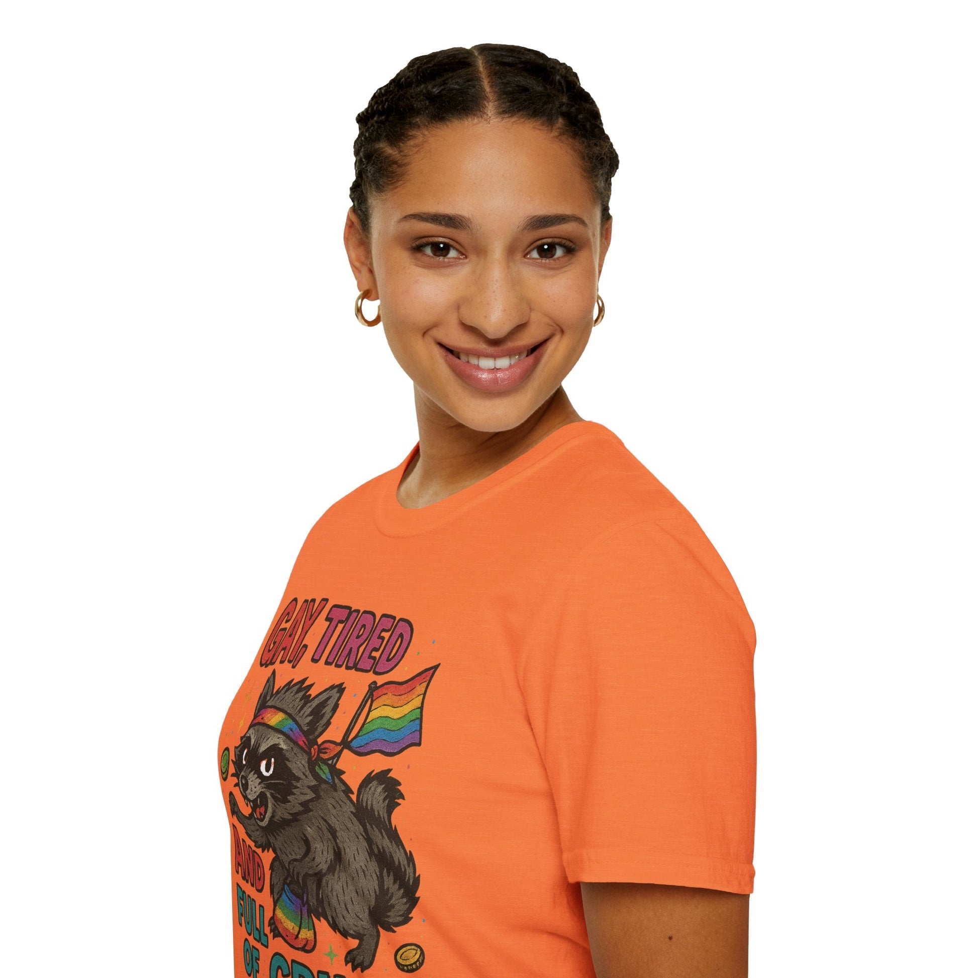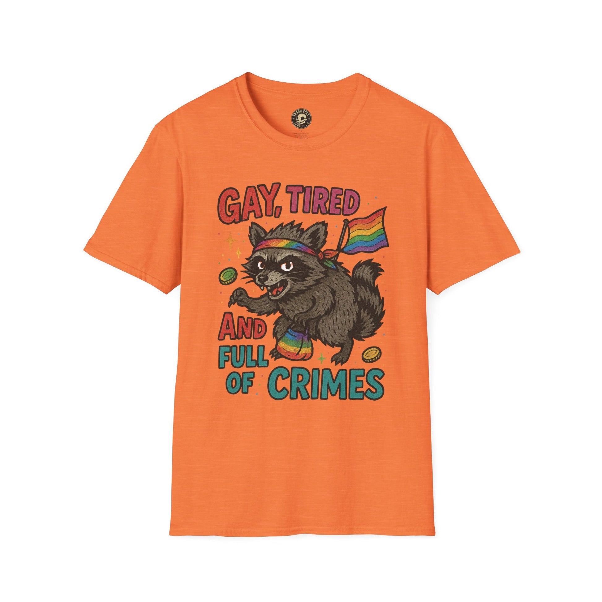 Unleash your inner chaotic queer with this “Gay, Tired, and Full of Crimes” graphic tee. Featuring a mischievous raccoon decked out in Pride gear, this hilarious design is printed on a premium Gildan Softstyle unisex T-shirt—soft, lightweight, and ready for rebellion. Perfect for Pride Month, queer events, or just loudly existing in your fabulous truth. Flaunt your feral energy with comfort and color.