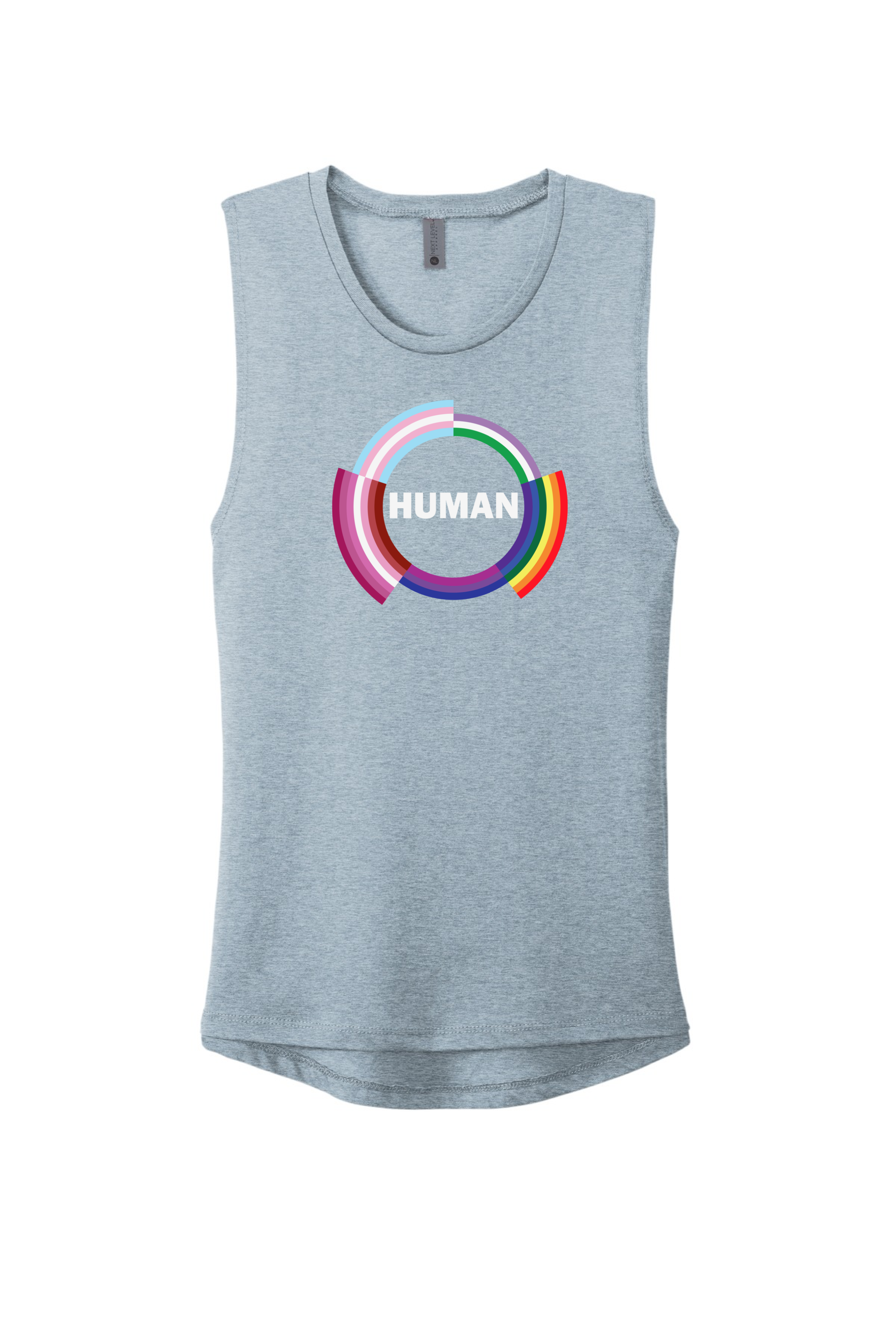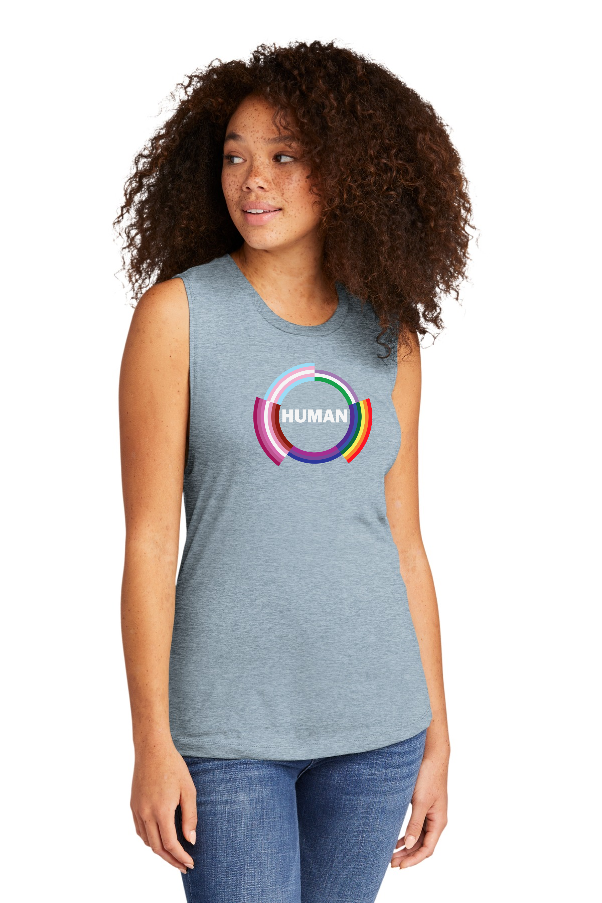 Finally our women's cut muscle tank is from Next Level (Stonewash denim) is a 65/35 blend of polyester and cotton.