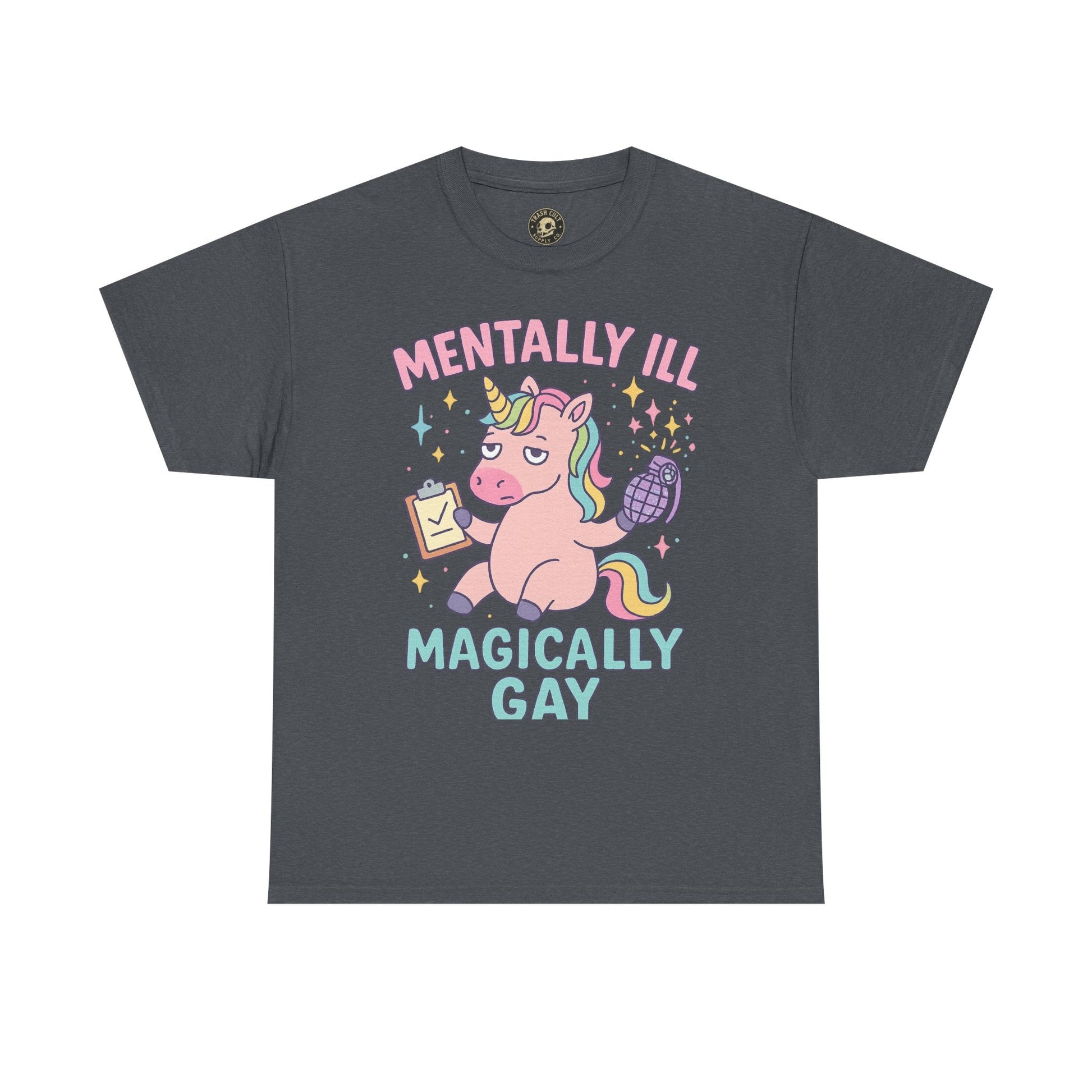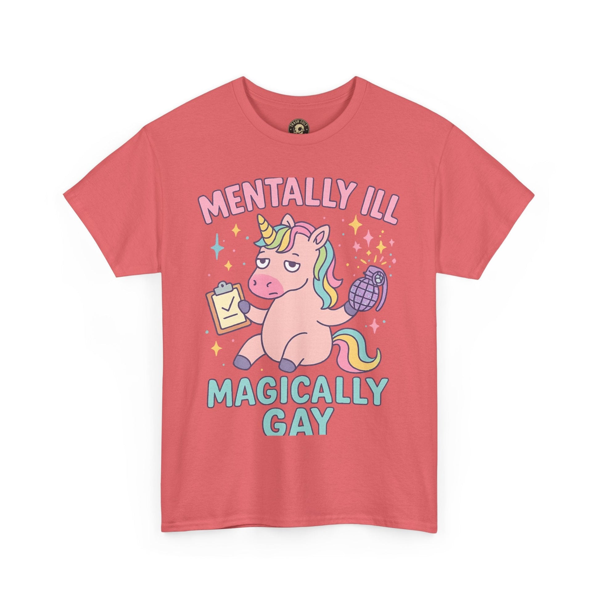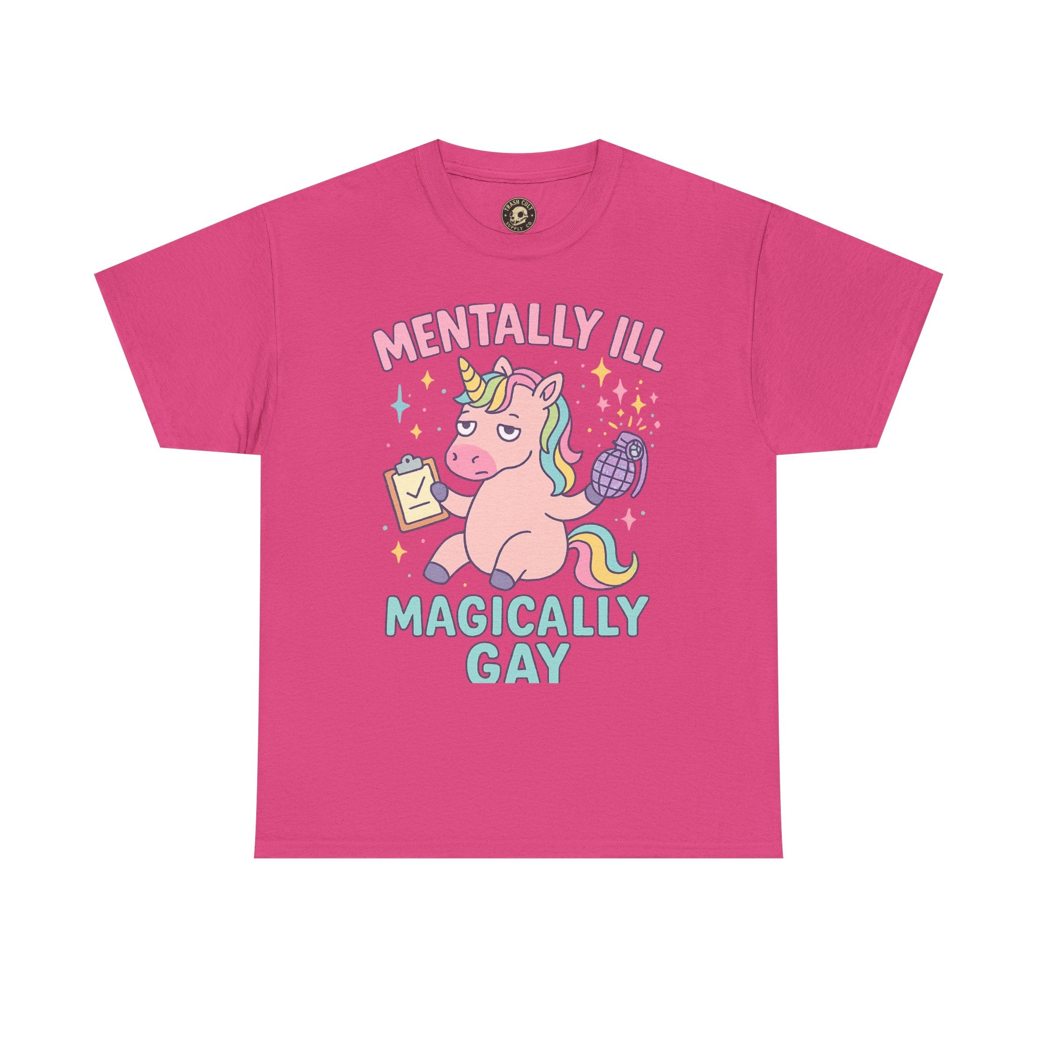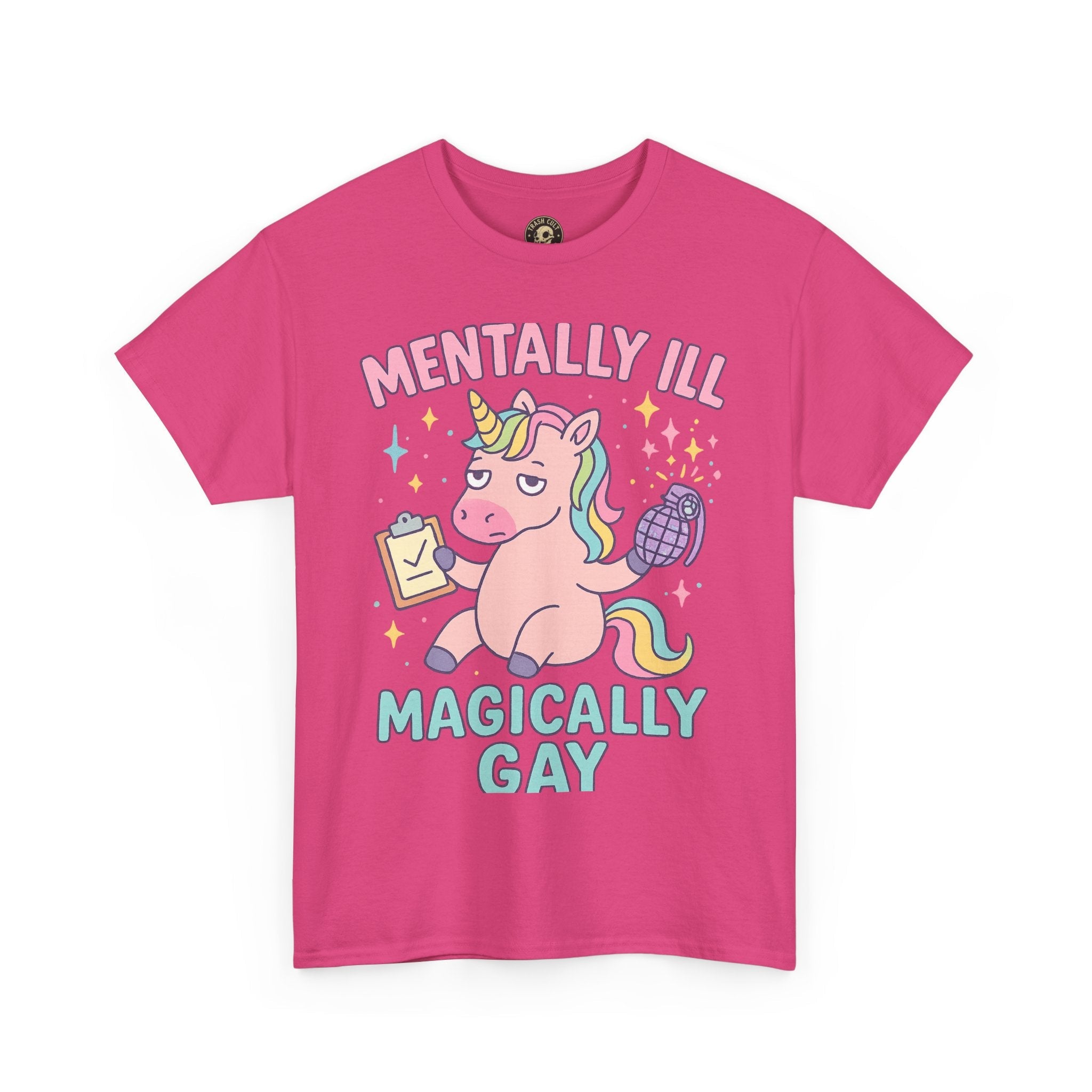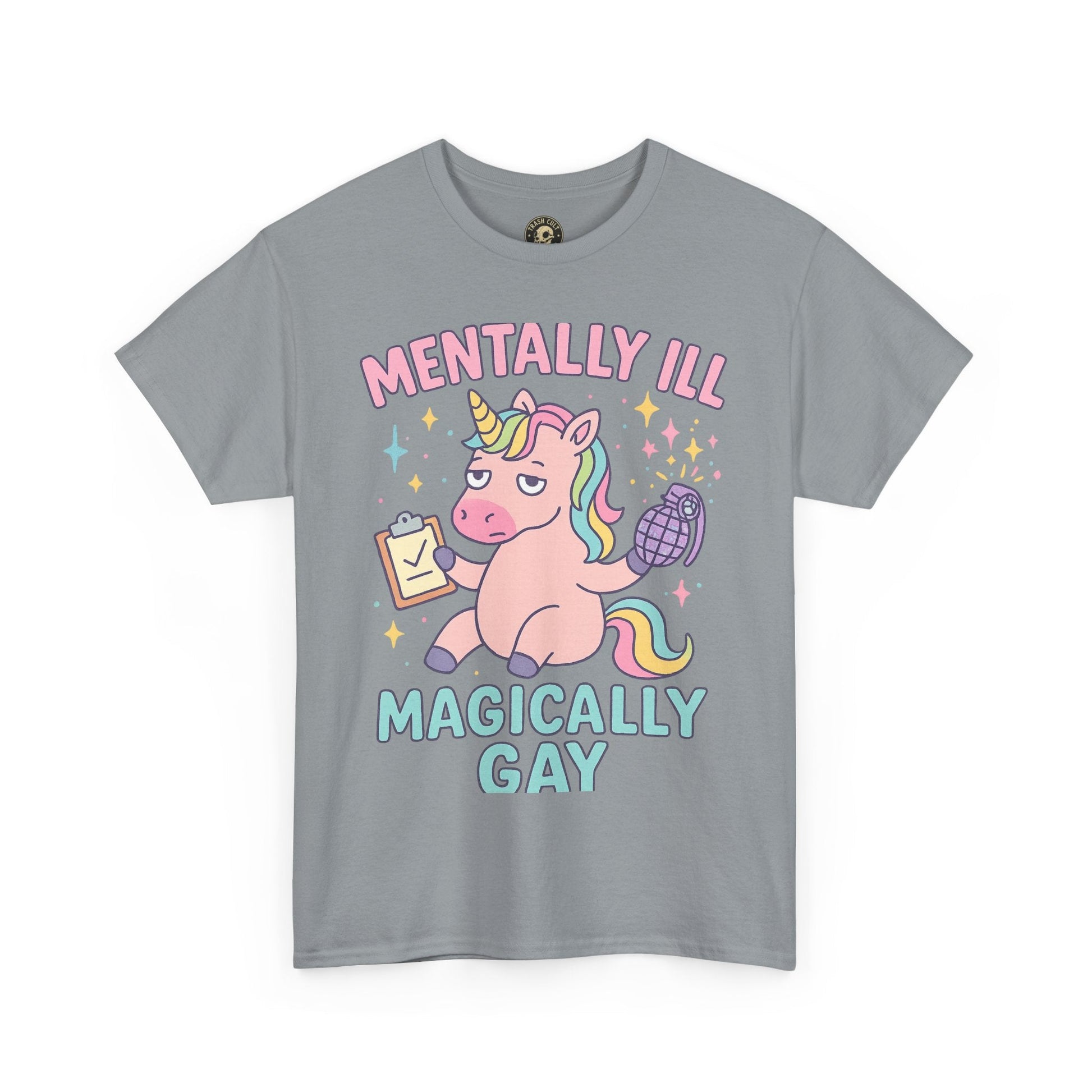 The Mentally Ill, Magically Gay tee is unapologetically queer, pastel, and just the right amount of unhinged. Featuring a dead-eyed unicorn holding a clipboard and a glitter grenade (because therapy and chaos can coexist), this bold design is printed on the Gildan Unisex Heavy Cotton Tee—a wardrobe staple built for comfort and color.