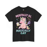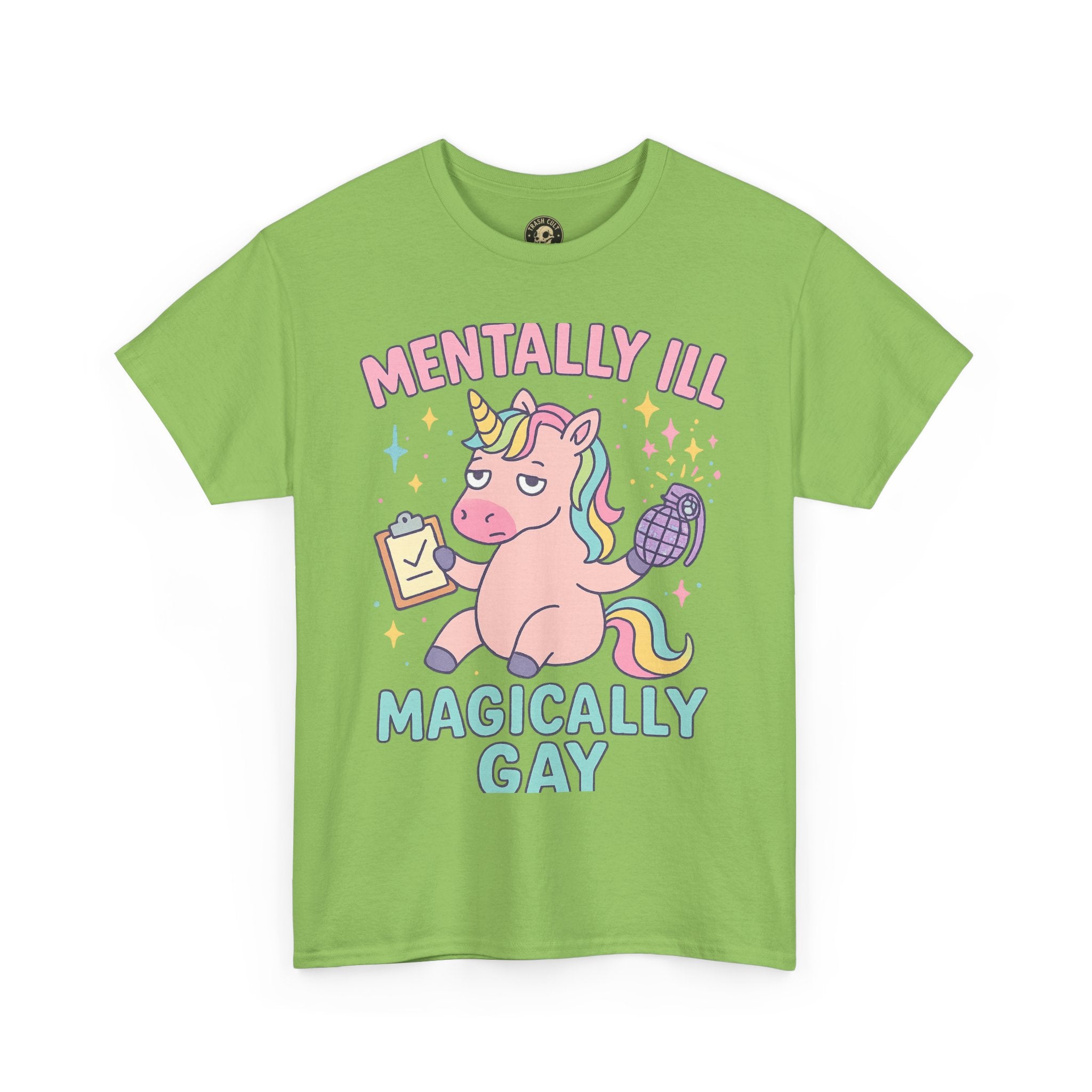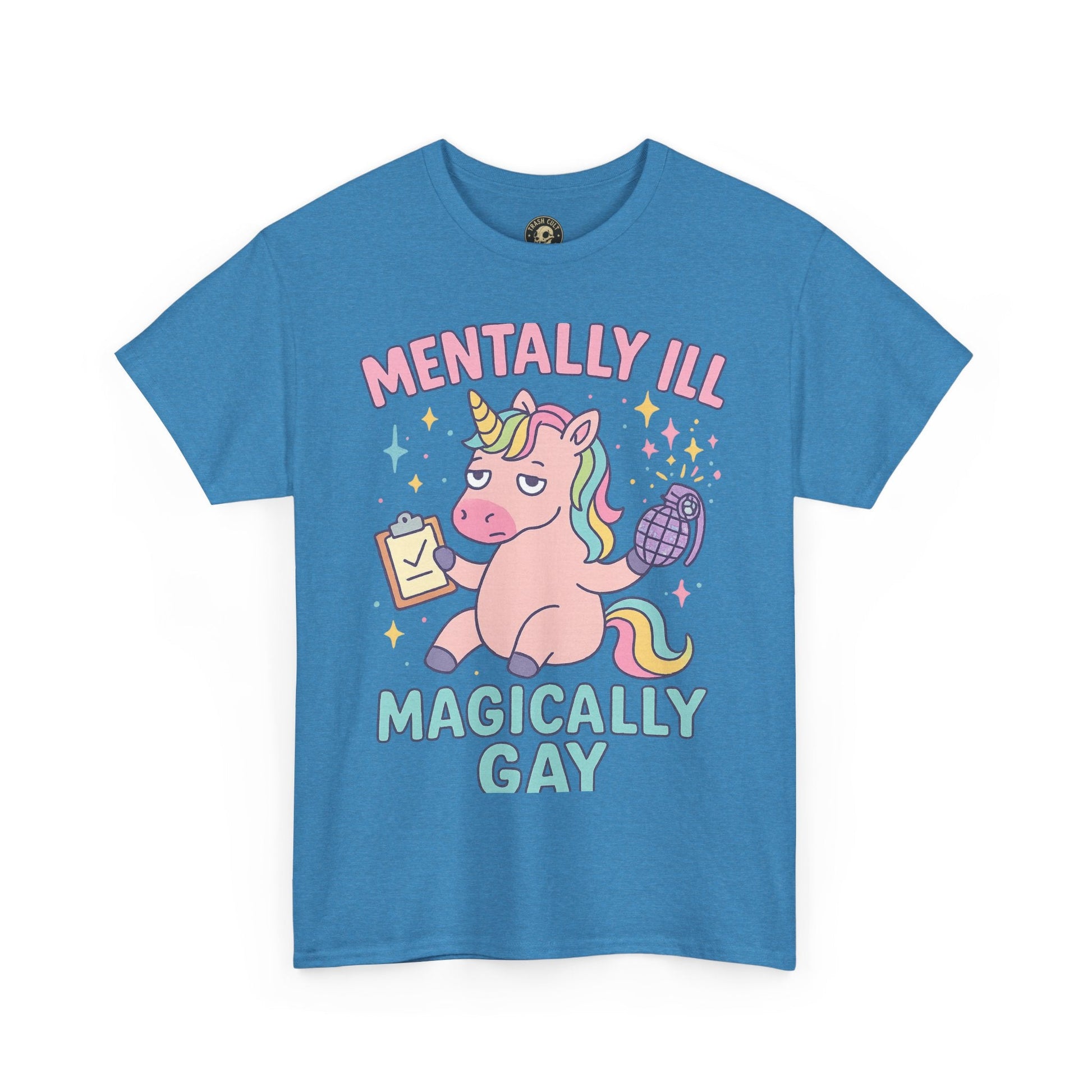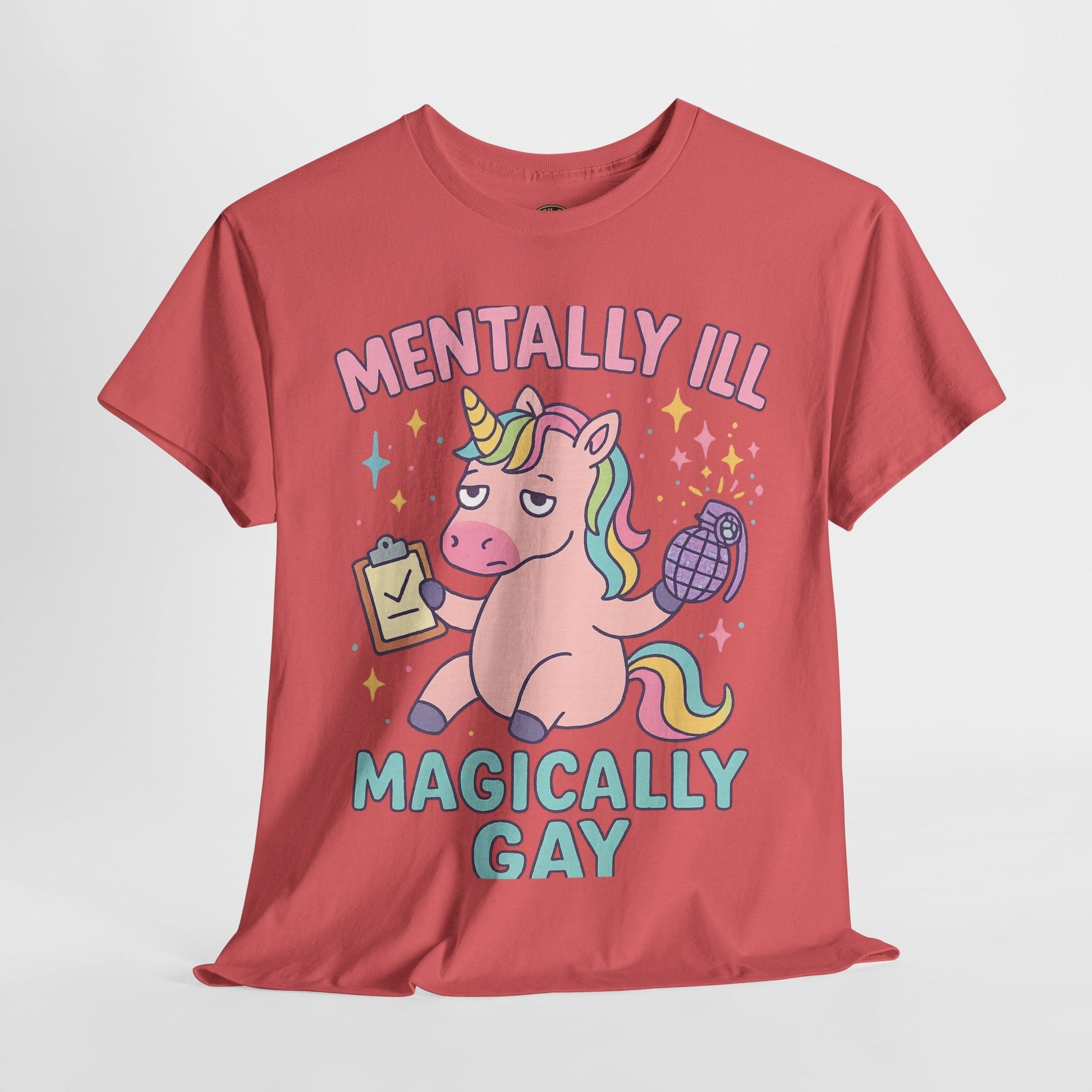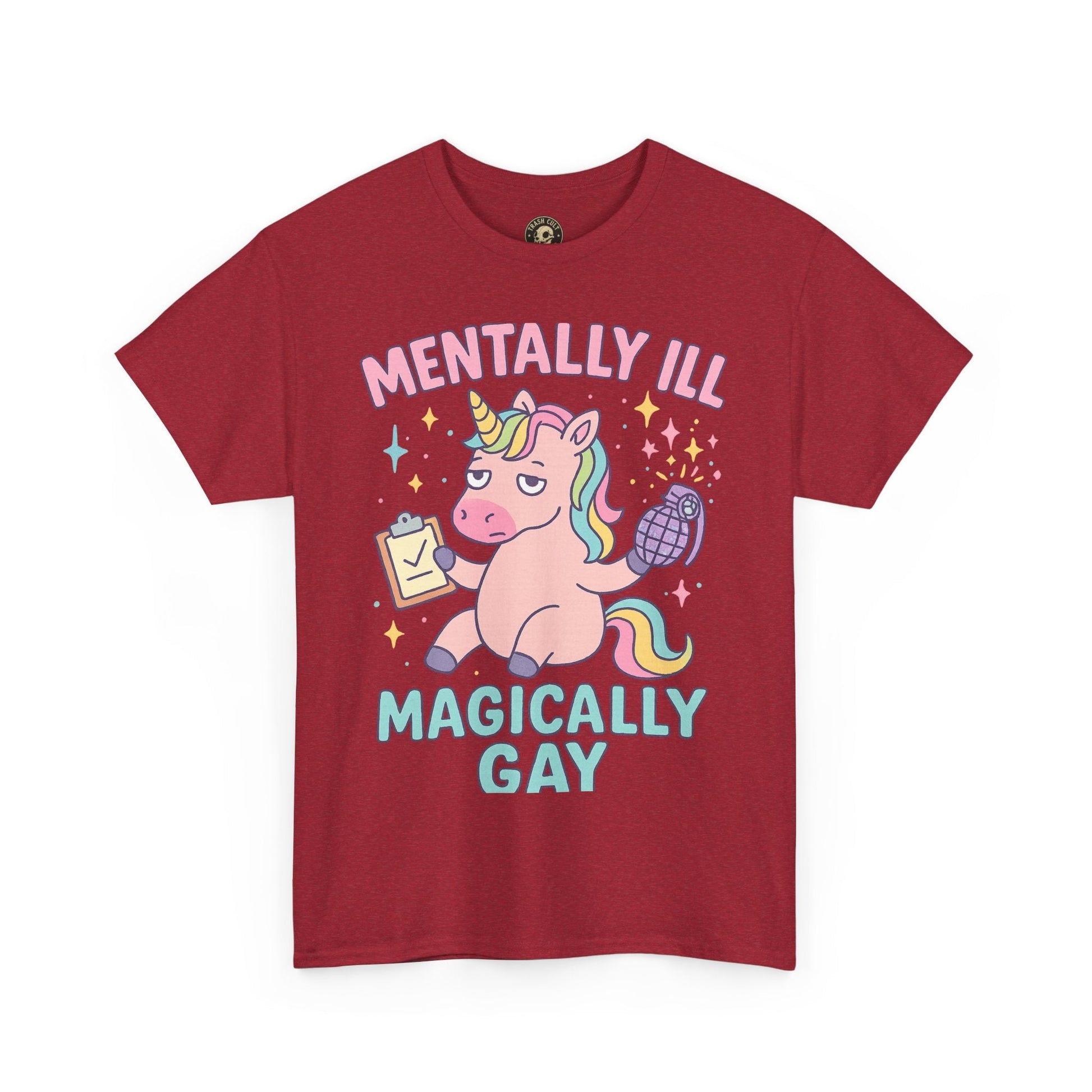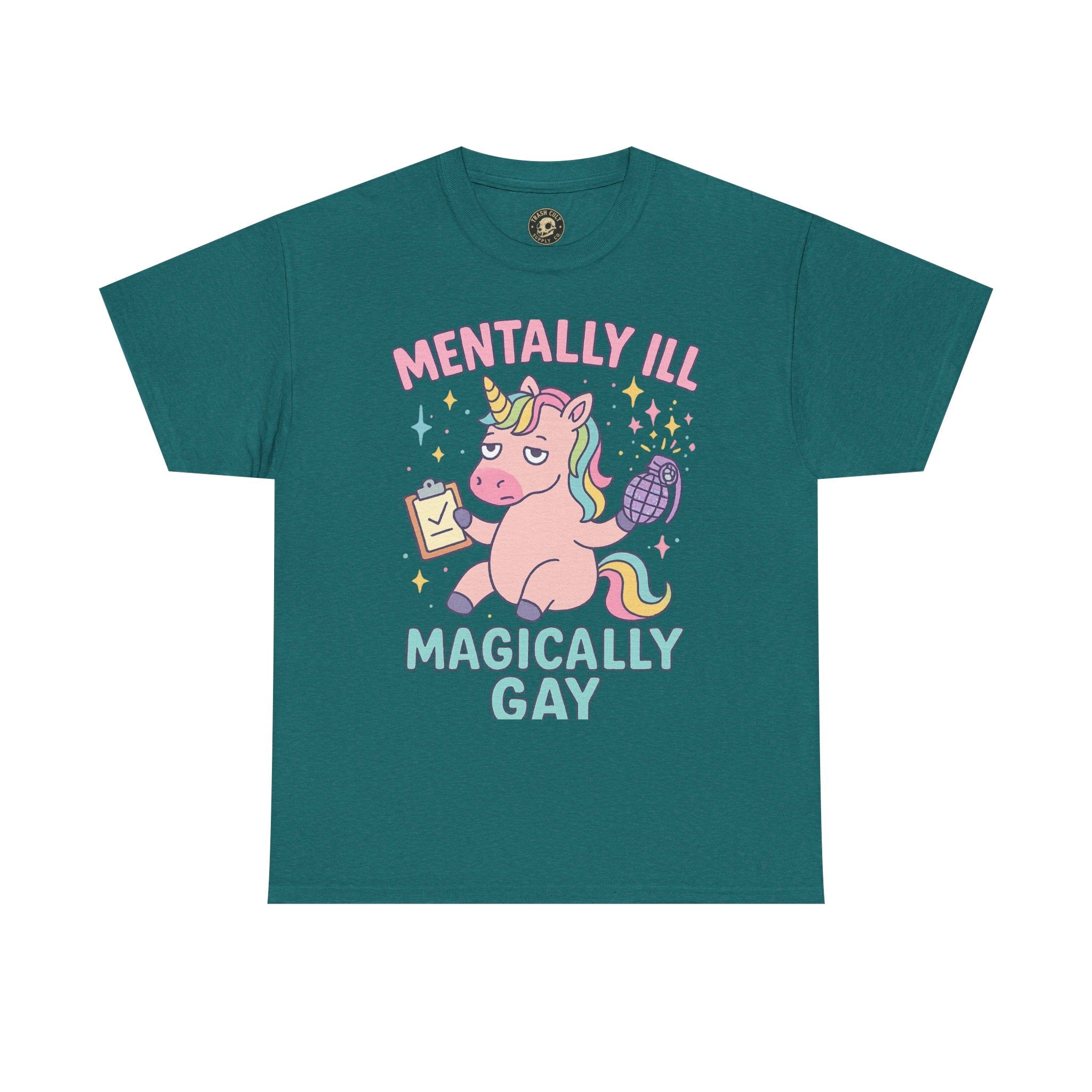 The Mentally Ill, Magically Gay tee is unapologetically queer, pastel, and just the right amount of unhinged. Featuring a dead-eyed unicorn holding a clipboard and a glitter grenade (because therapy and chaos can coexist), this bold design is printed on the Gildan Unisex Heavy Cotton Tee—a wardrobe staple built for comfort and color.