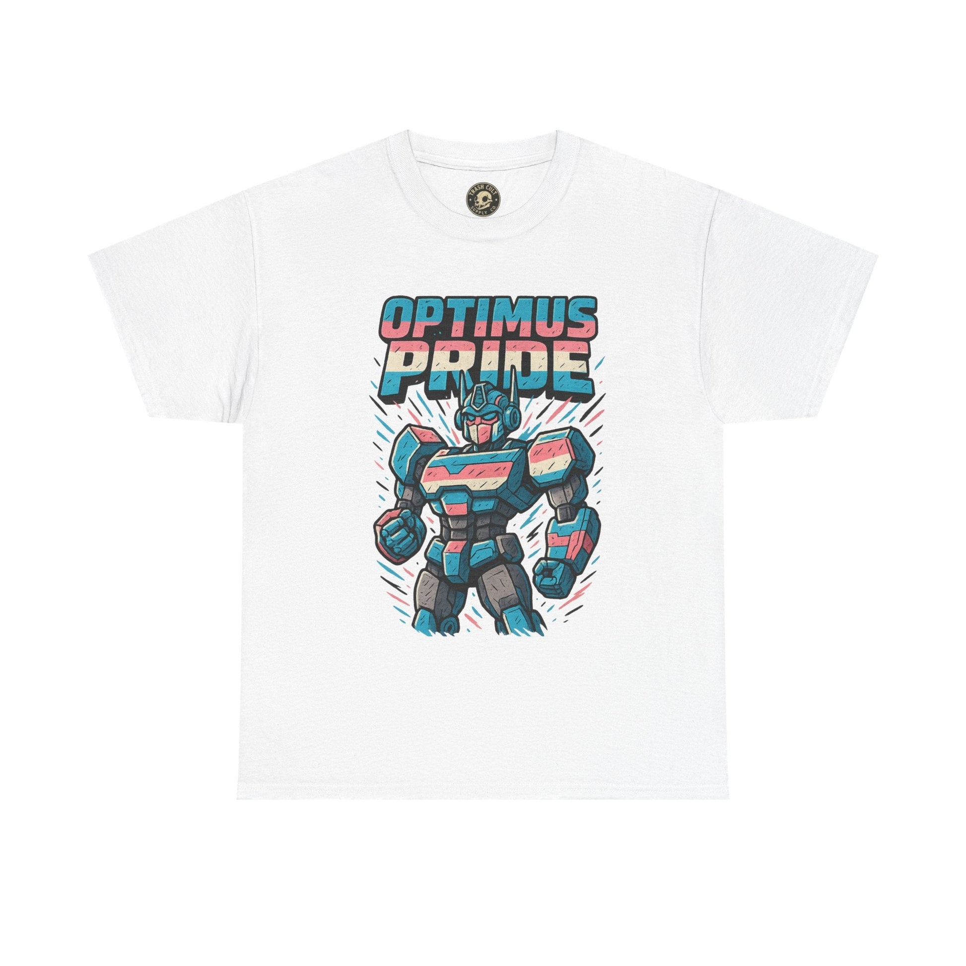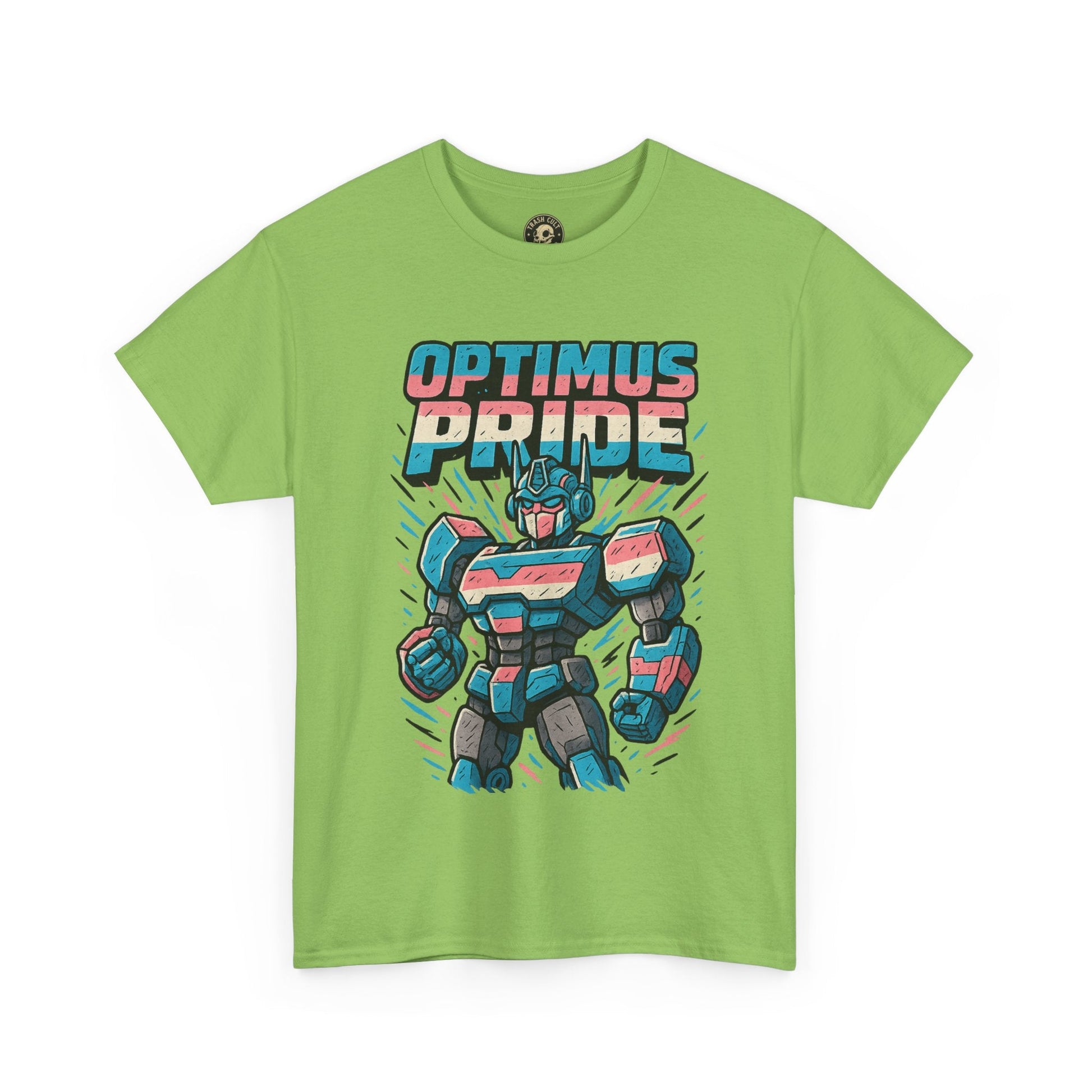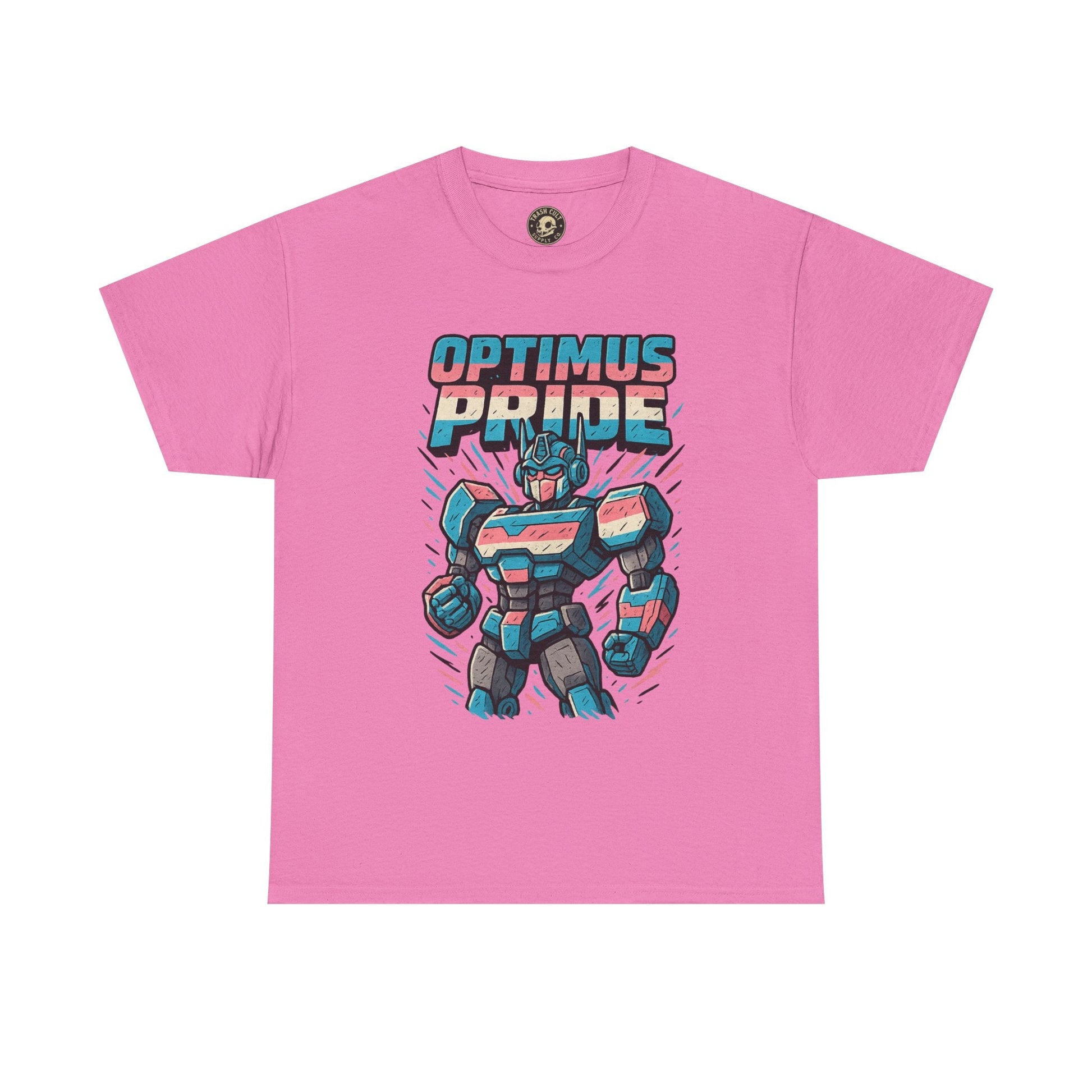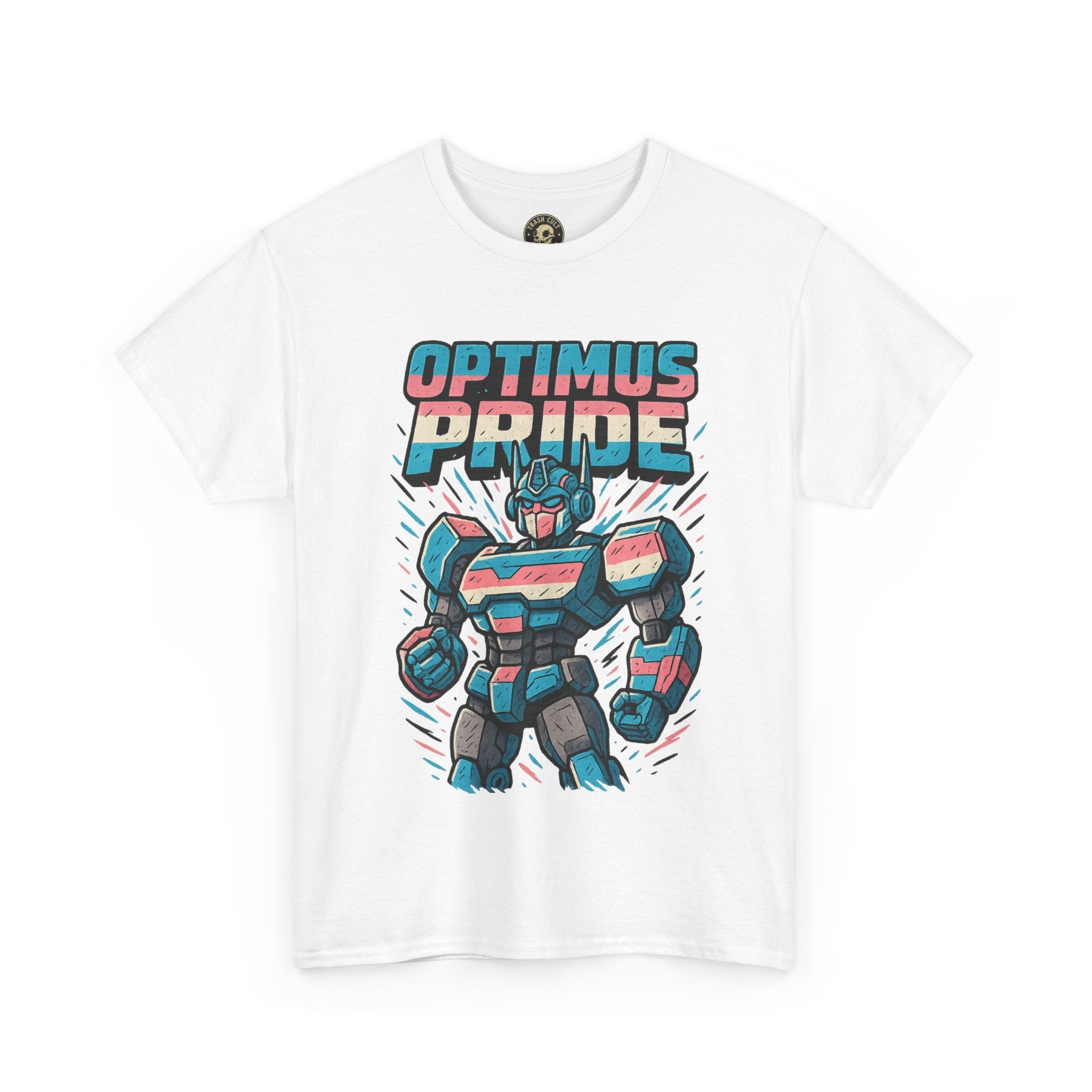 Roll out and stand proud. This Optimus Pride tee fuses mech power with trans pride in a bold, funny design perfect for LGBTQ+ geeks and queer comic lovers. Great for festivals, game nights, or just flexing your transformer energy with pride.