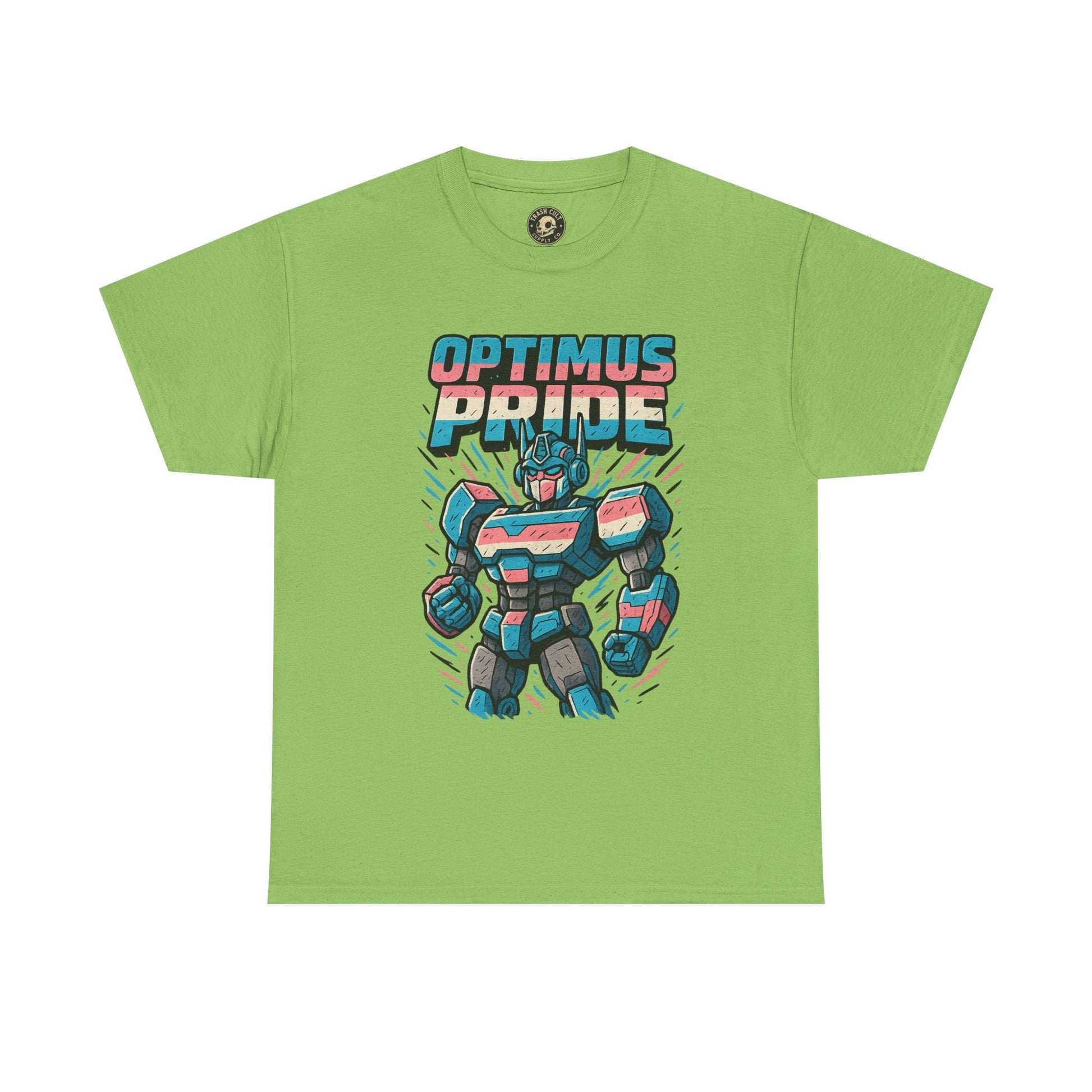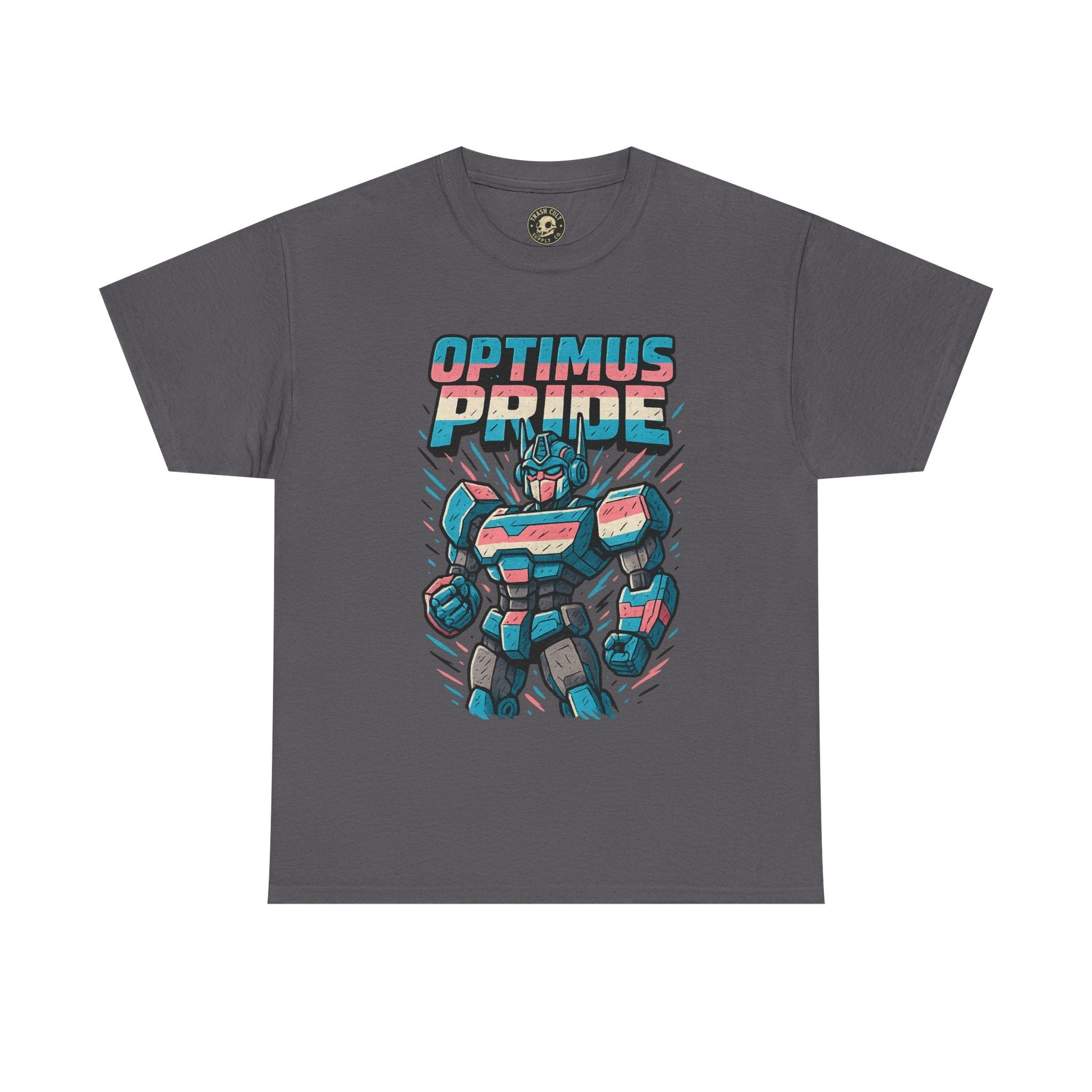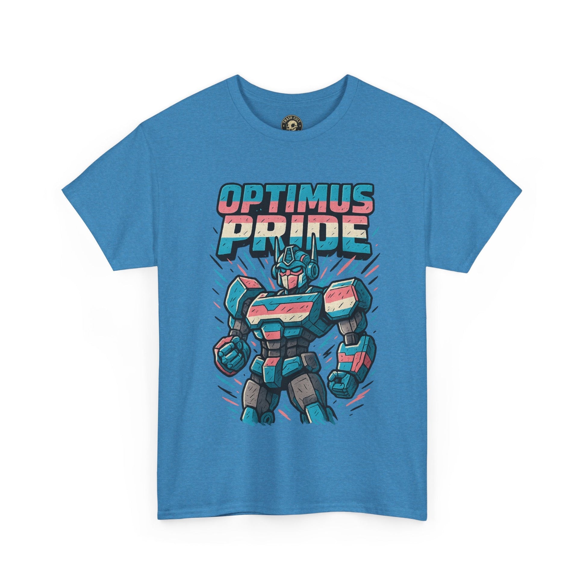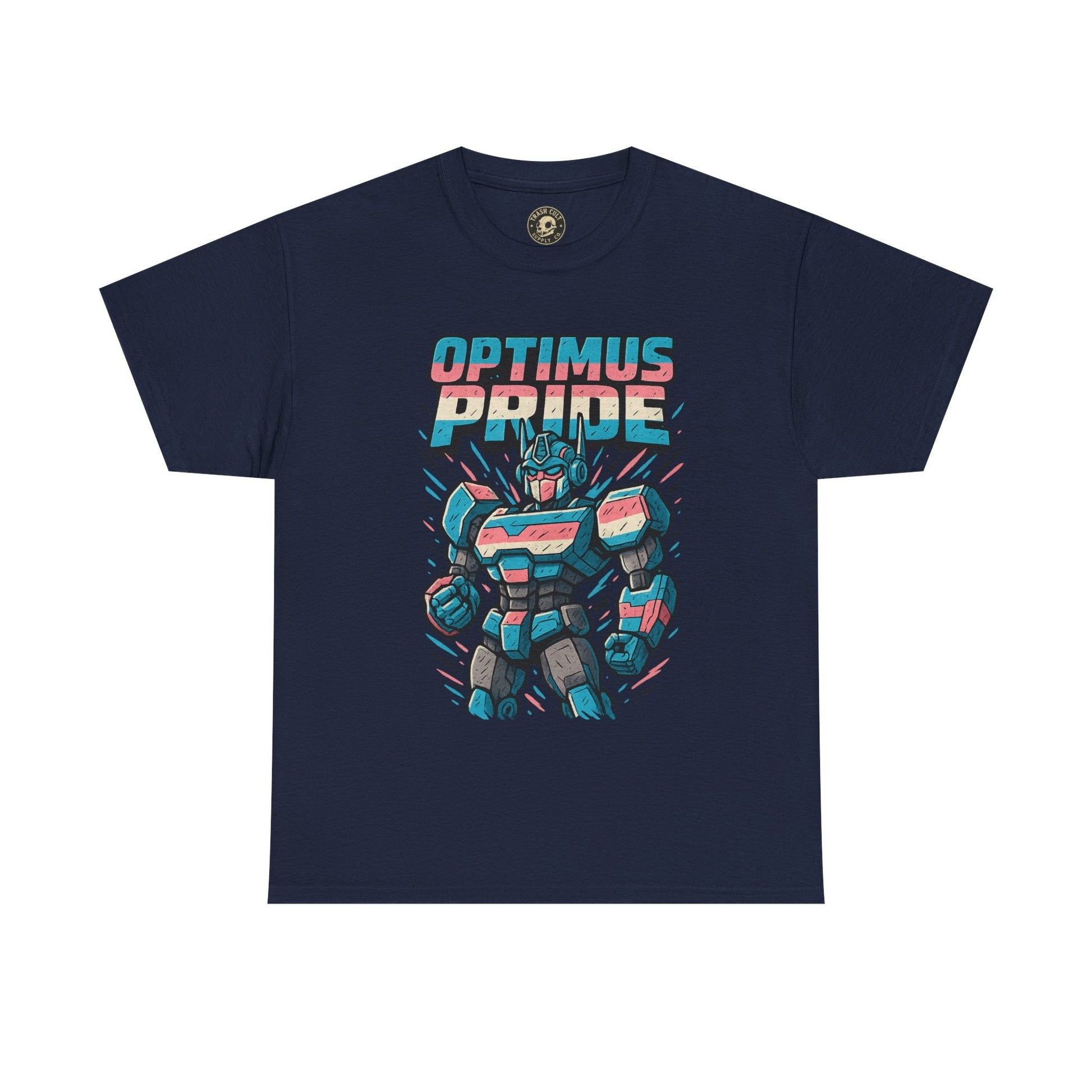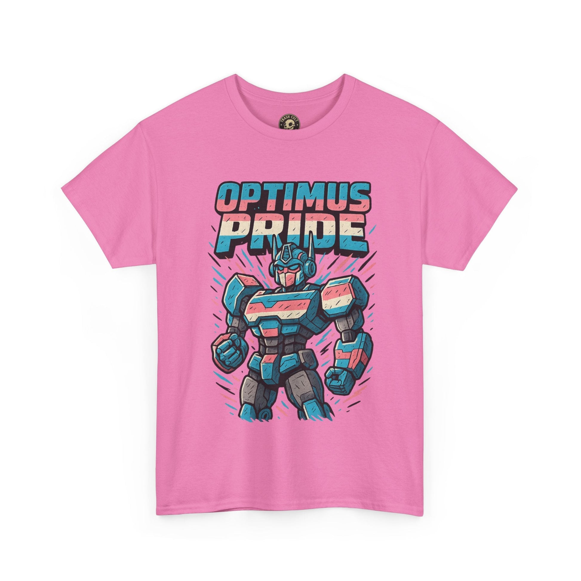 Roll out and stand proud. This Optimus Pride tee fuses mech power with trans pride in a bold, funny design perfect for LGBTQ+ geeks and queer comic lovers. Great for festivals, game nights, or just flexing your transformer energy with pride.
