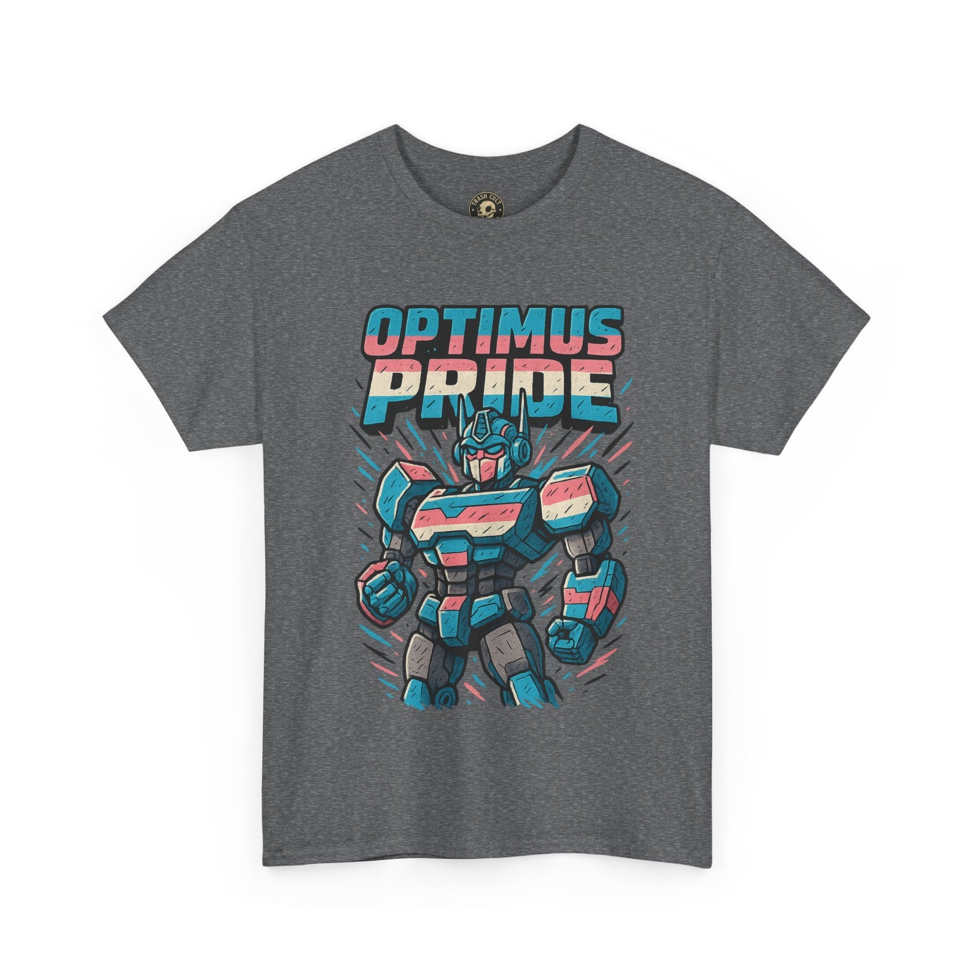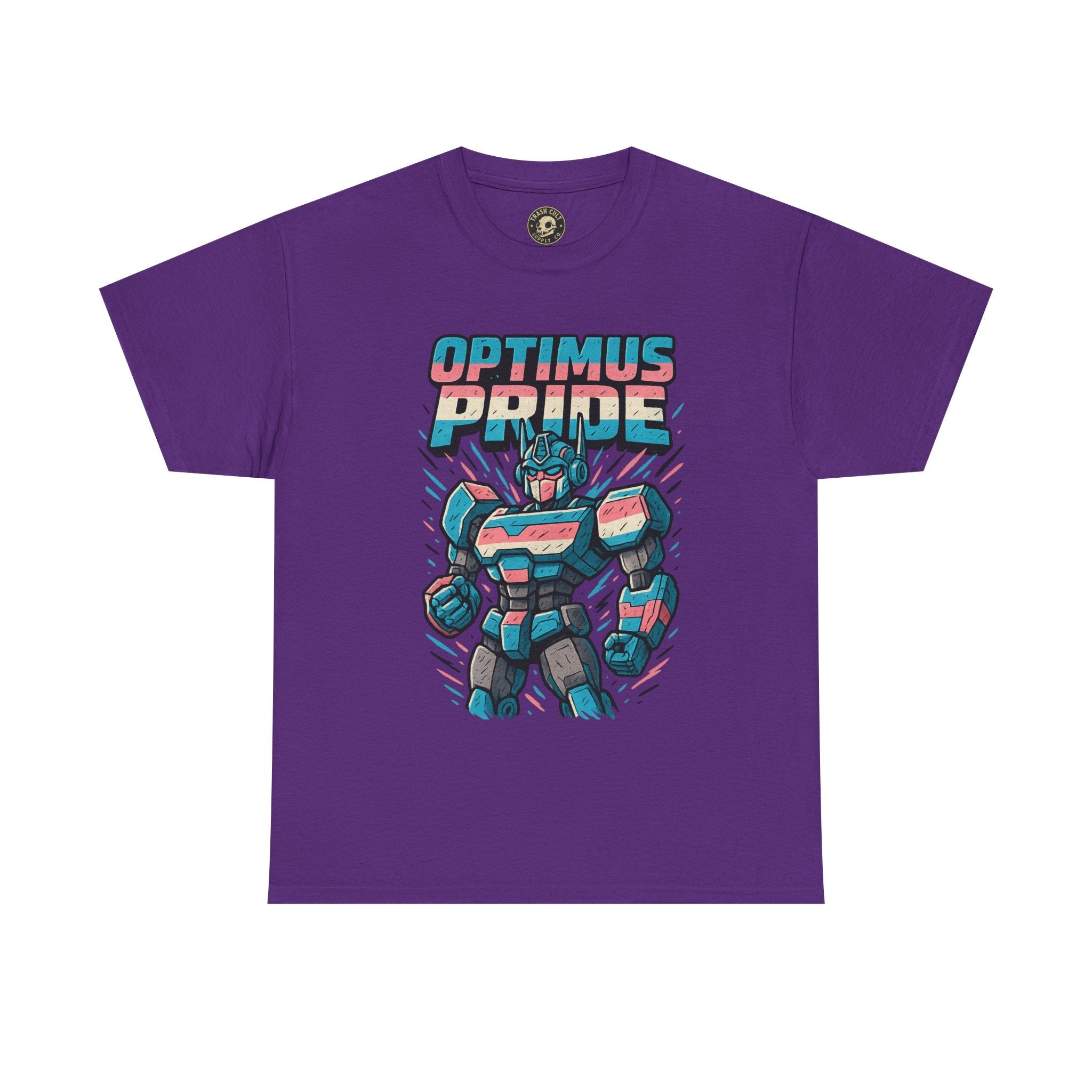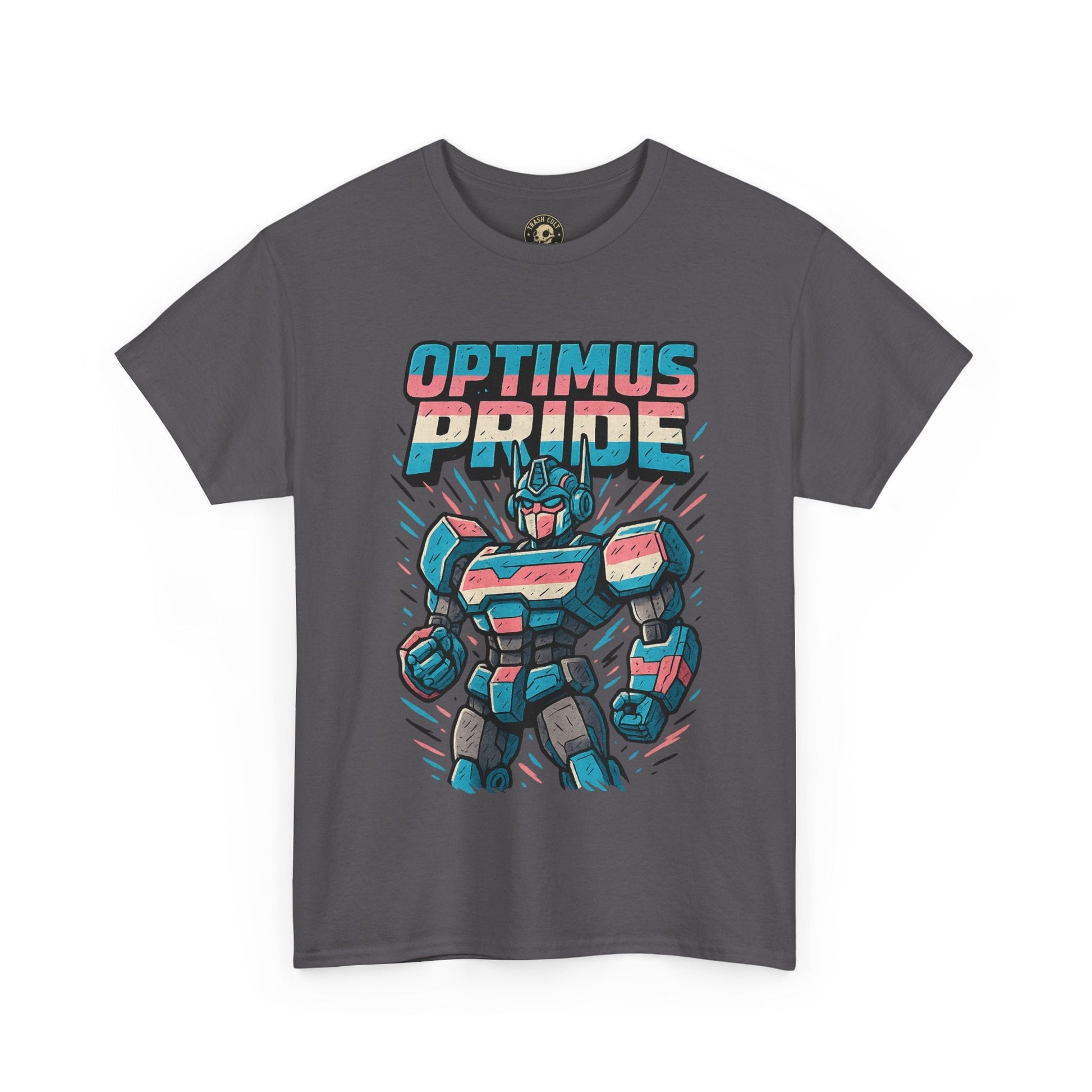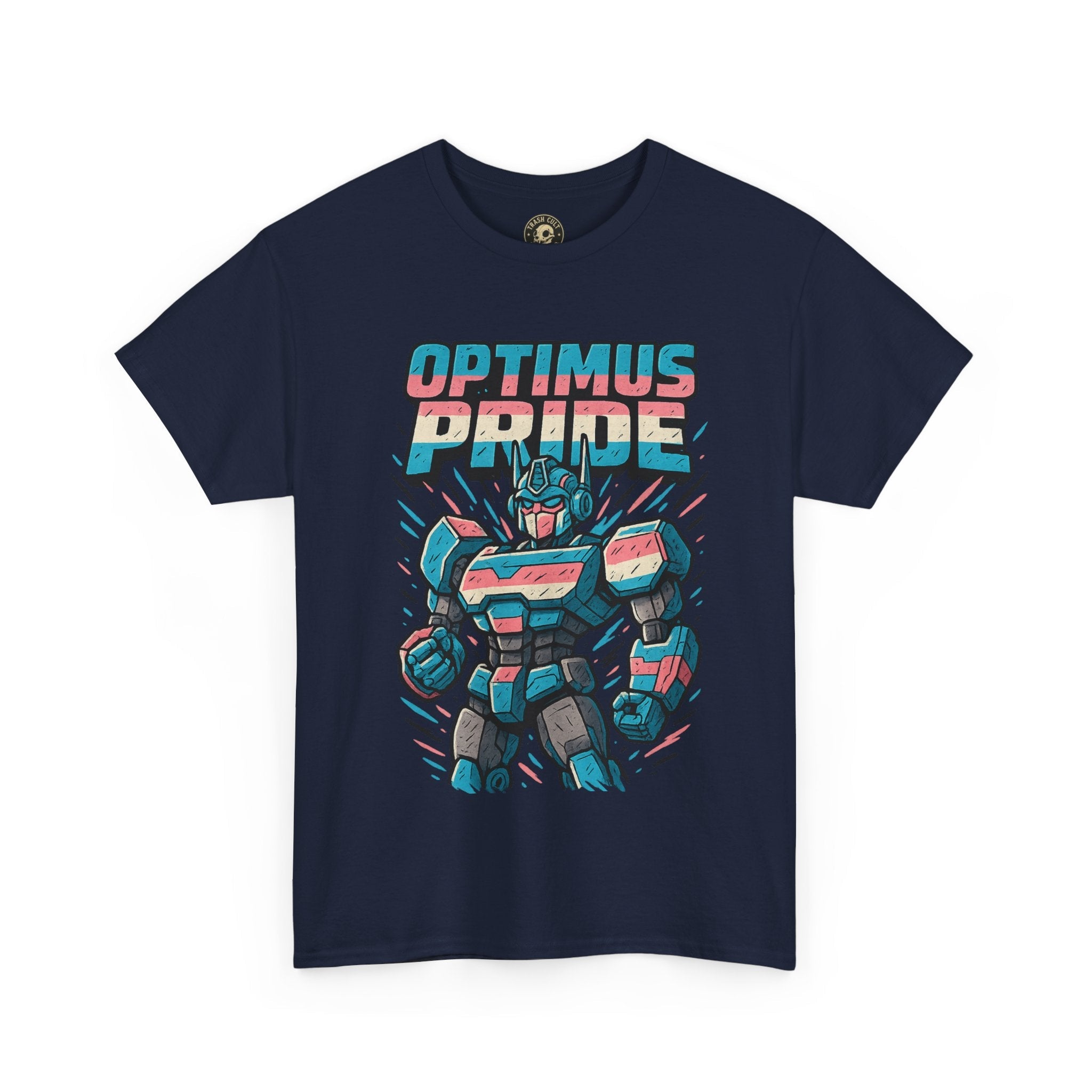 Roll out and stand proud. This Optimus Pride tee fuses mech power with trans pride in a bold, funny design perfect for LGBTQ+ geeks and queer comic lovers. Great for festivals, game nights, or just flexing your transformer energy with pride.