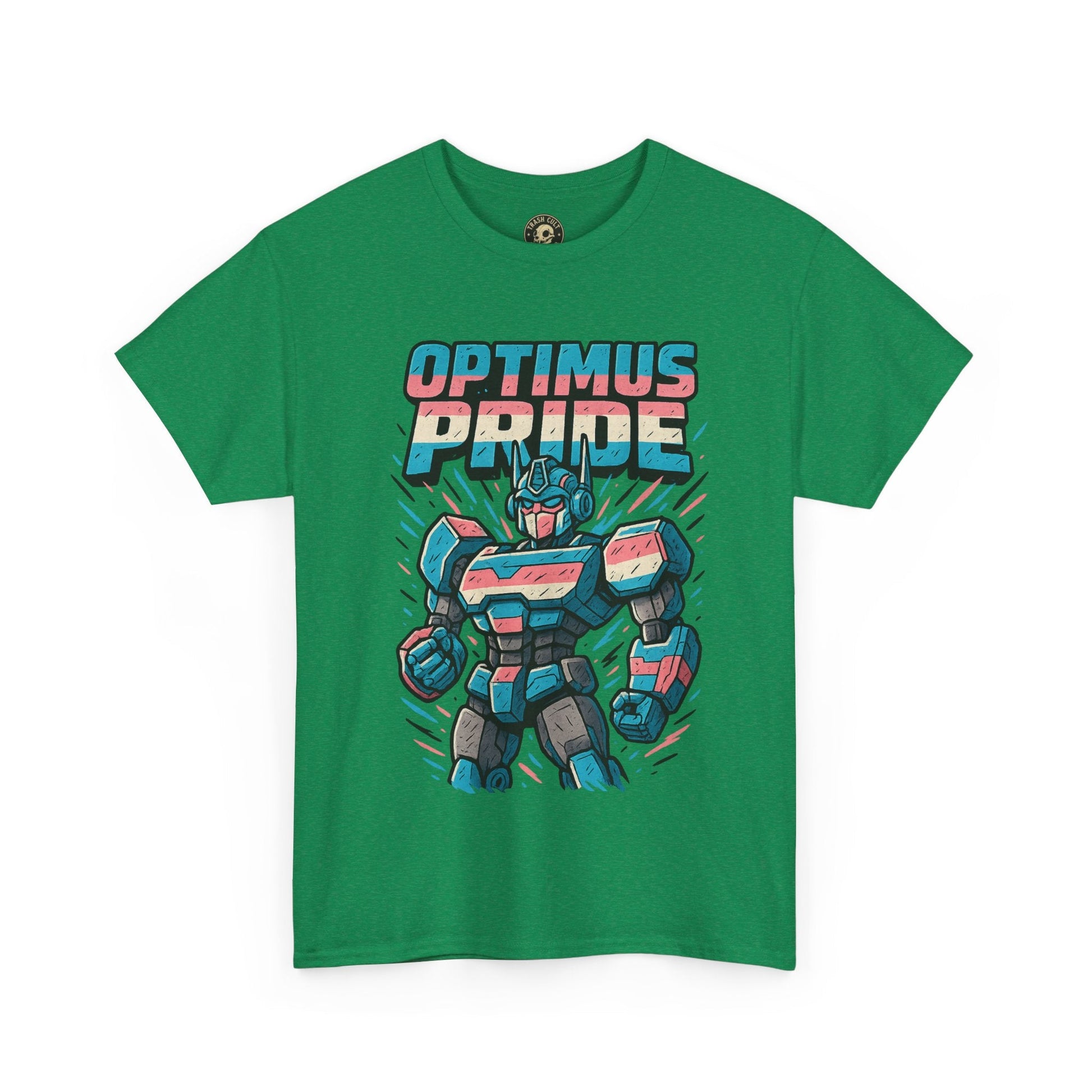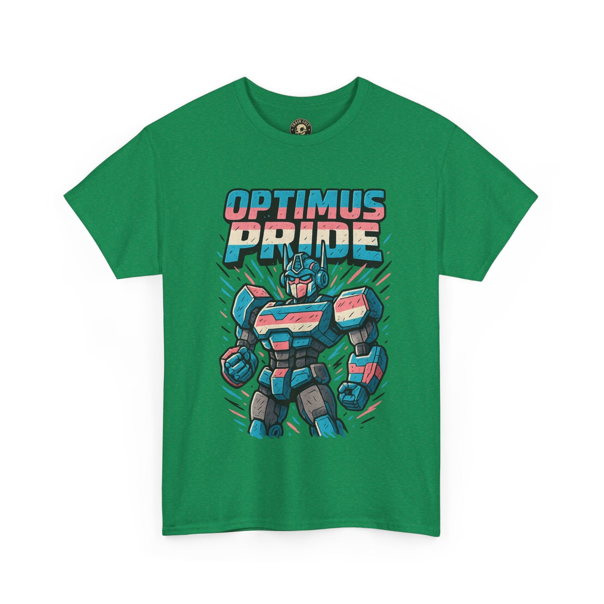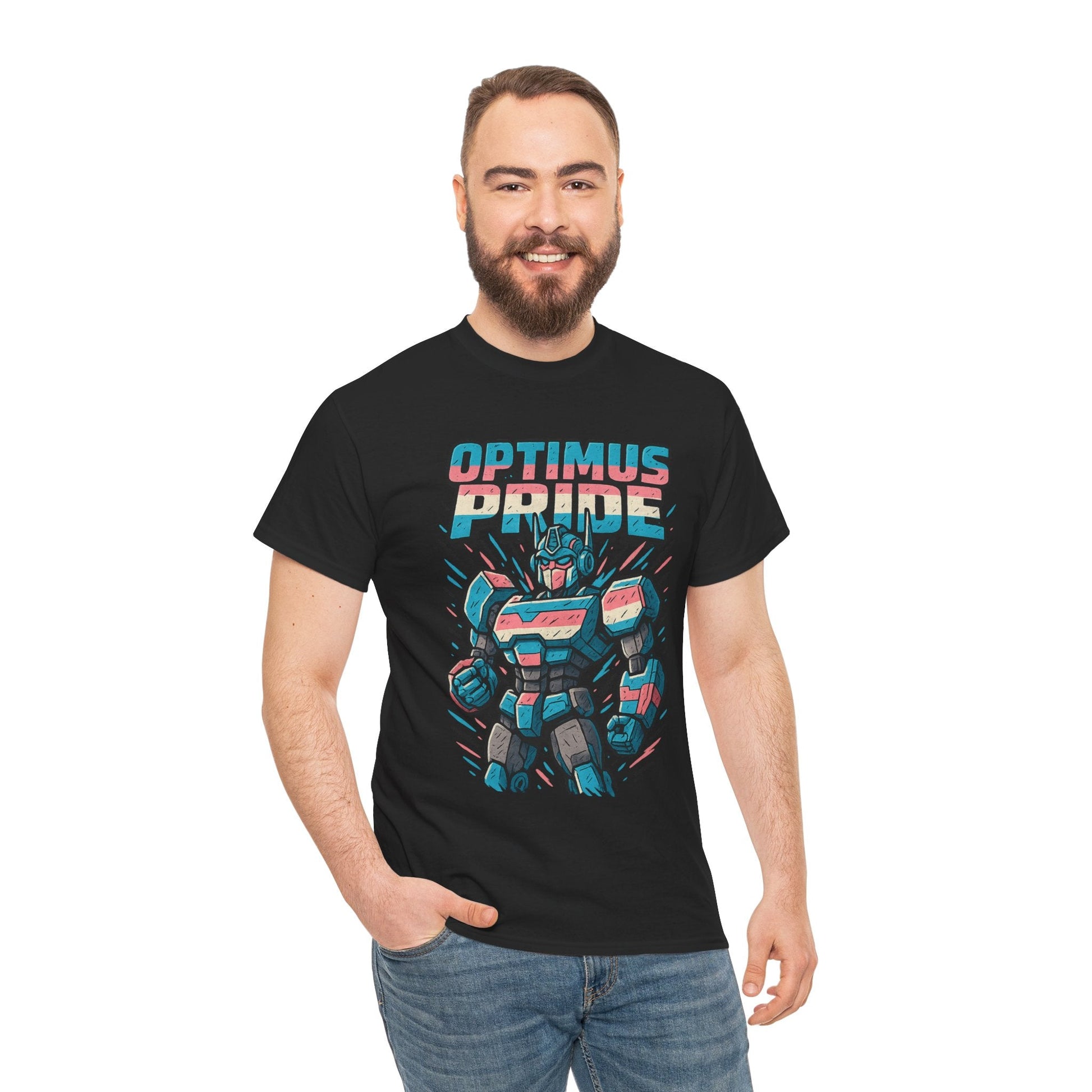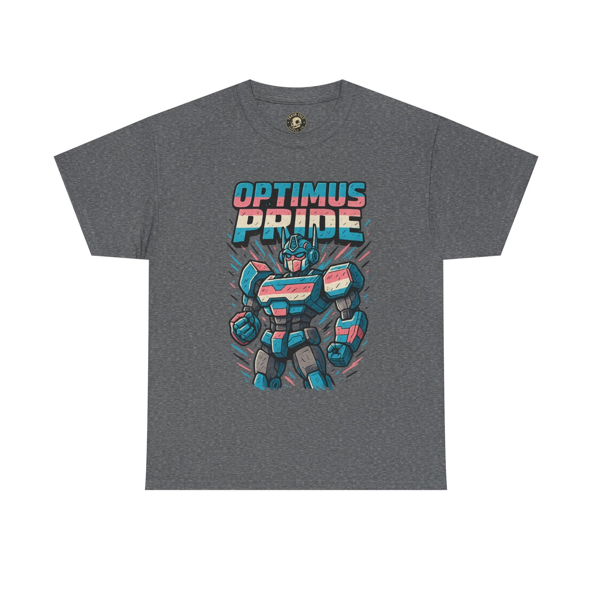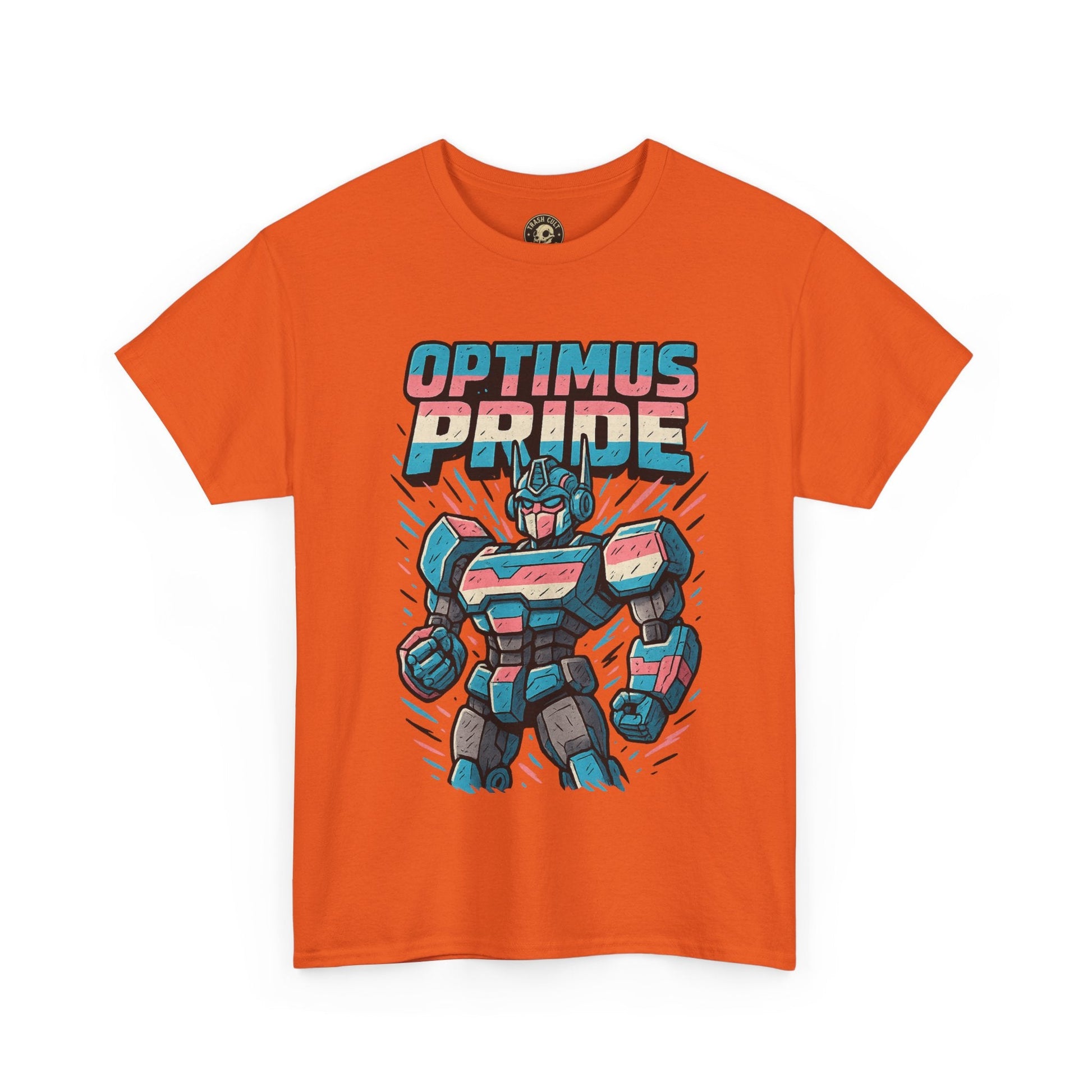 Roll out and stand proud. This Optimus Pride tee fuses mech power with trans pride in a bold, funny design perfect for LGBTQ+ geeks and queer comic lovers. Great for festivals, game nights, or just flexing your transformer energy with pride.