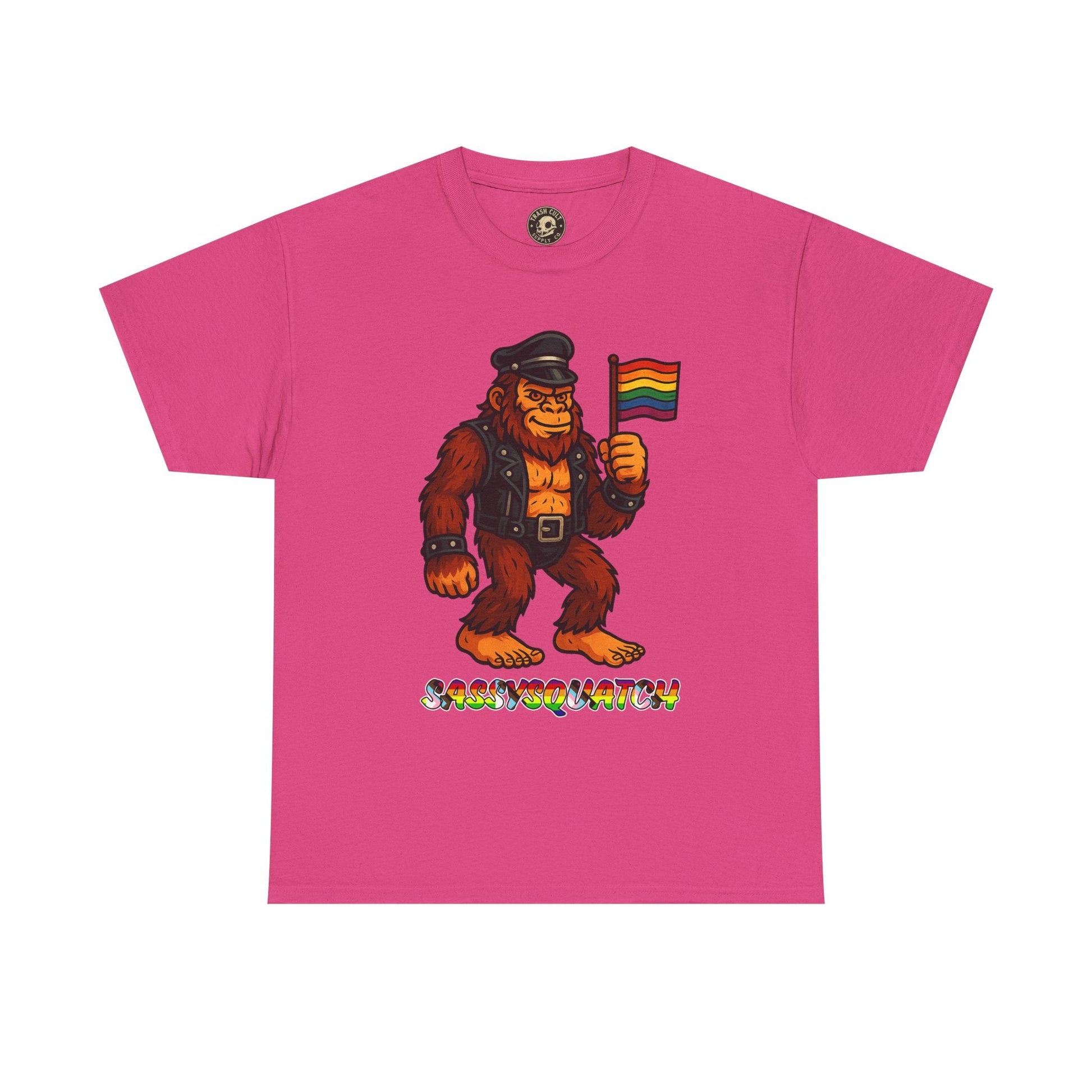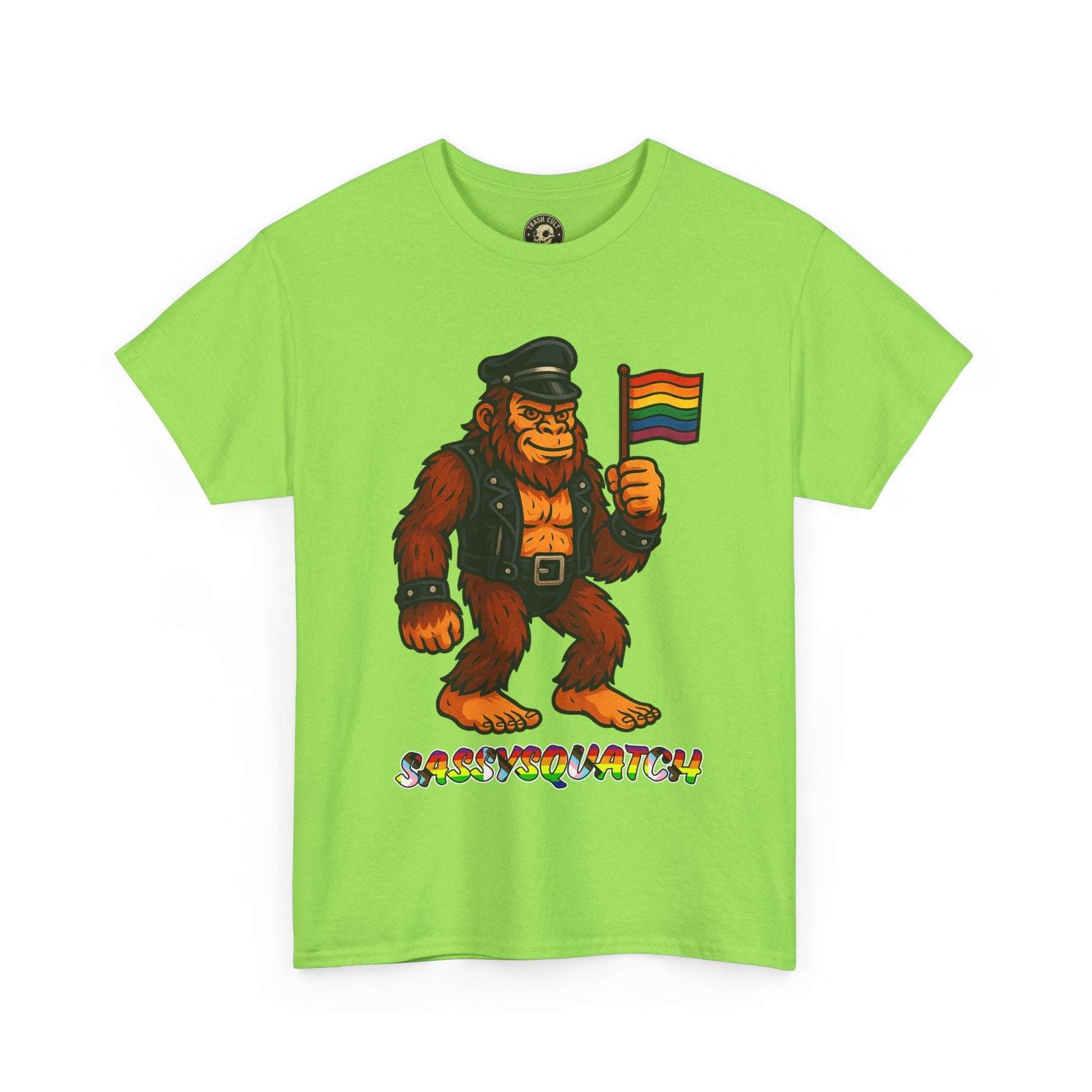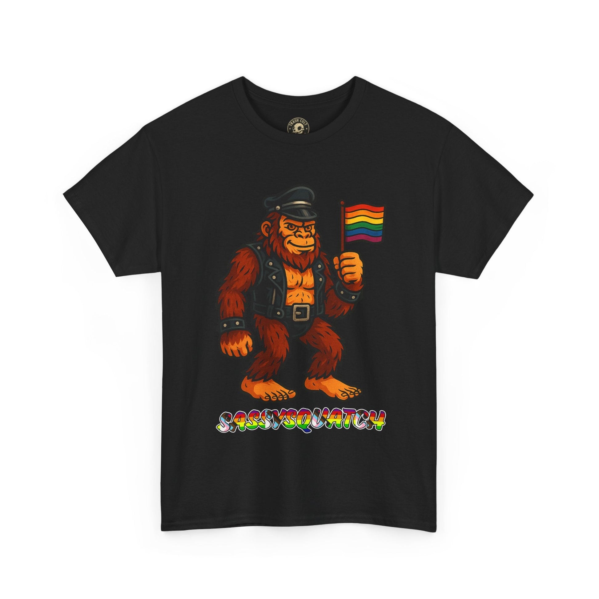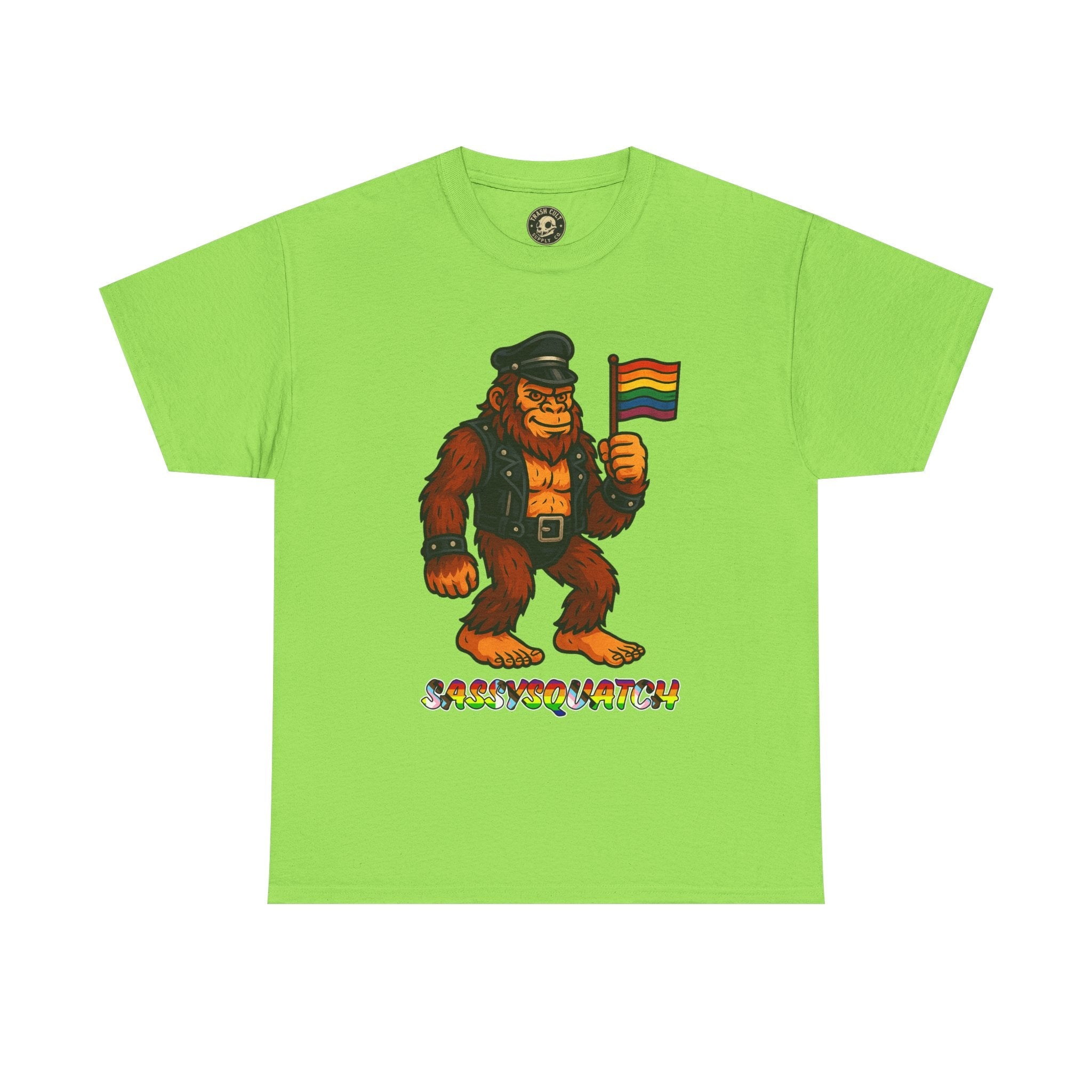 Unleash your inner legend with the Sassysquatch T-Shirt, featuring Bigfoot like you've never seen him before—decked out in full leather and holding a tiny Pride flag with attitude. This hilarious and bold new school design celebrates LGBTQ+ pride, the bear community, and unapologetic self-expression.