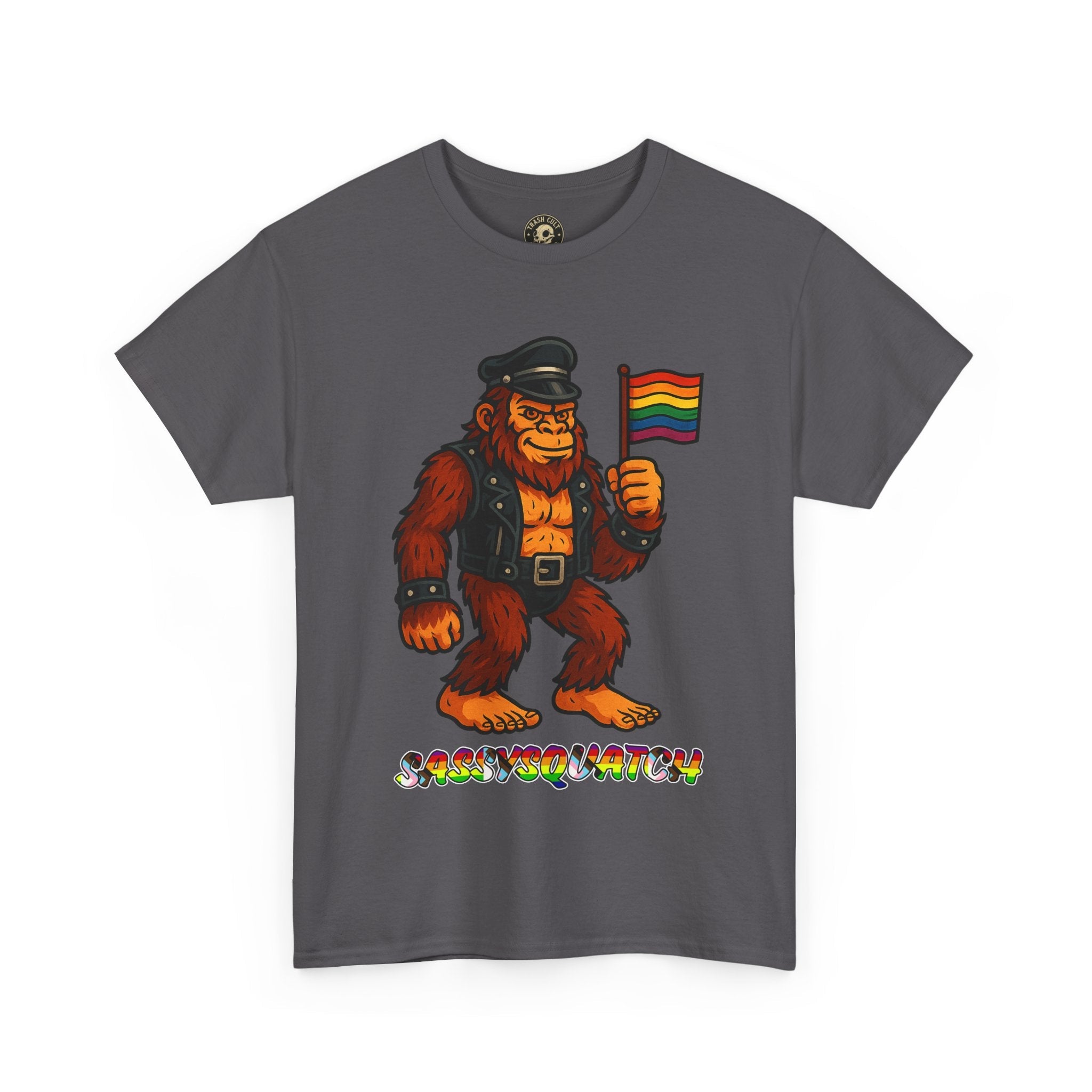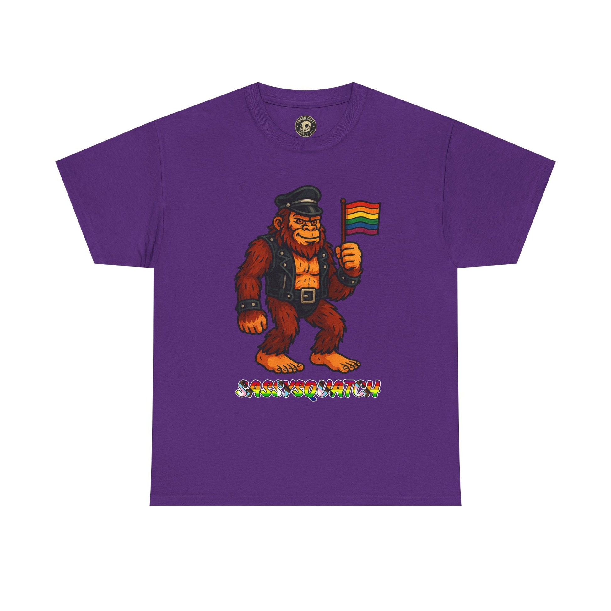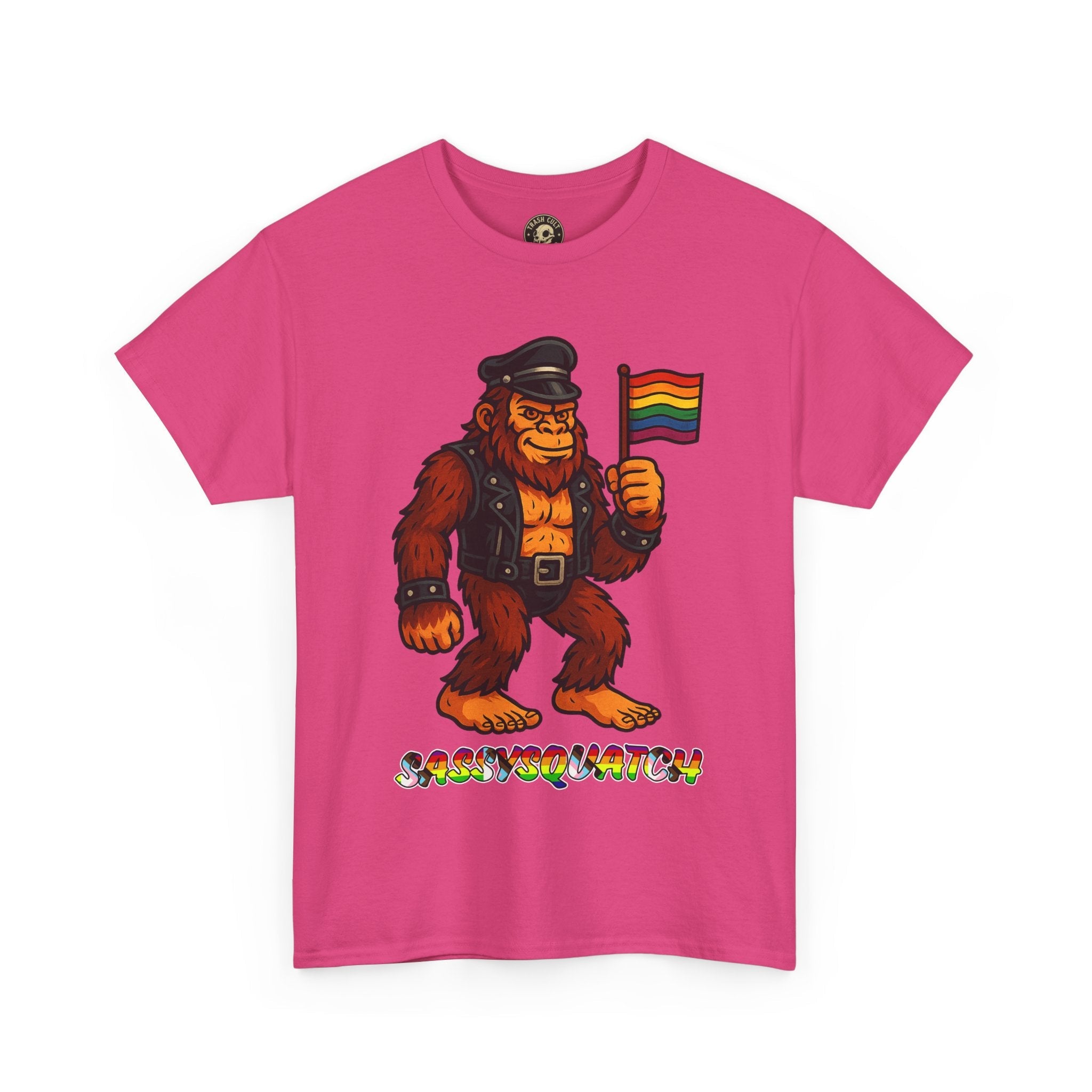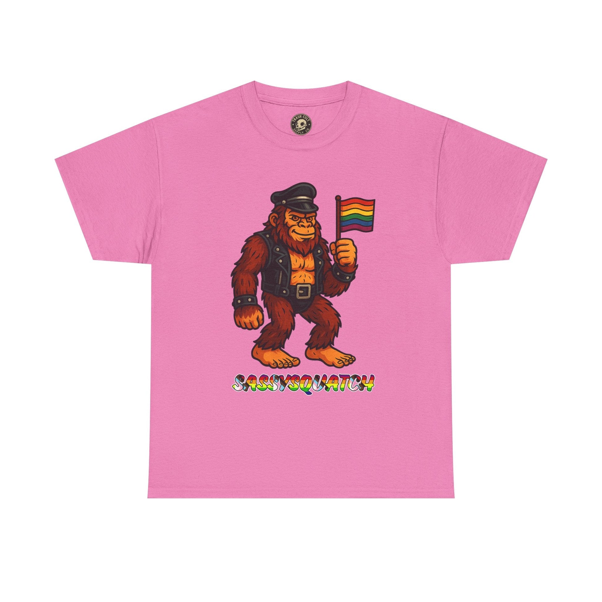 Unleash your inner legend with the Sassysquatch T-Shirt, featuring Bigfoot like you've never seen him before—decked out in full leather and holding a tiny Pride flag with attitude. This hilarious and bold new school design celebrates LGBTQ+ pride, the bear community, and unapologetic self-expression.