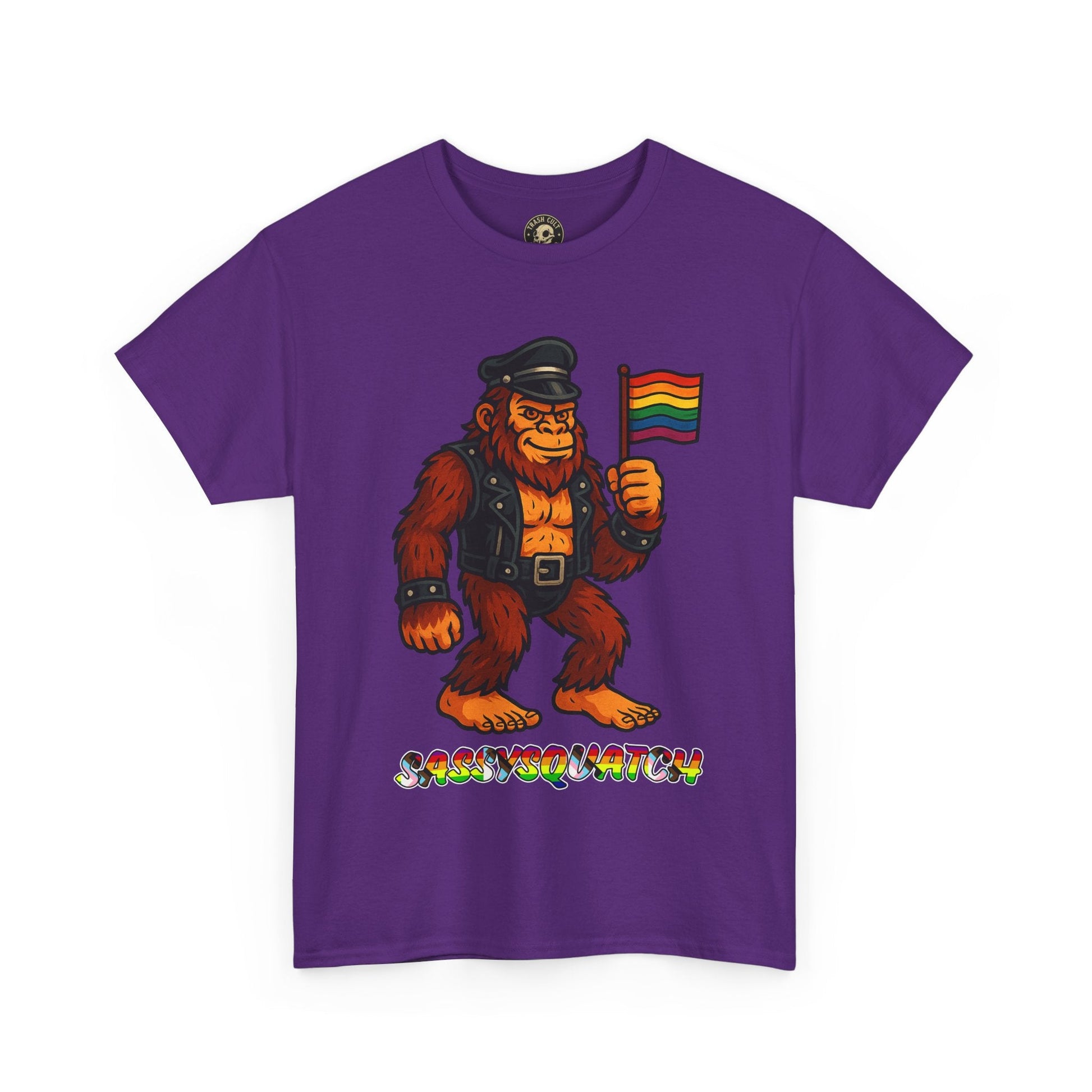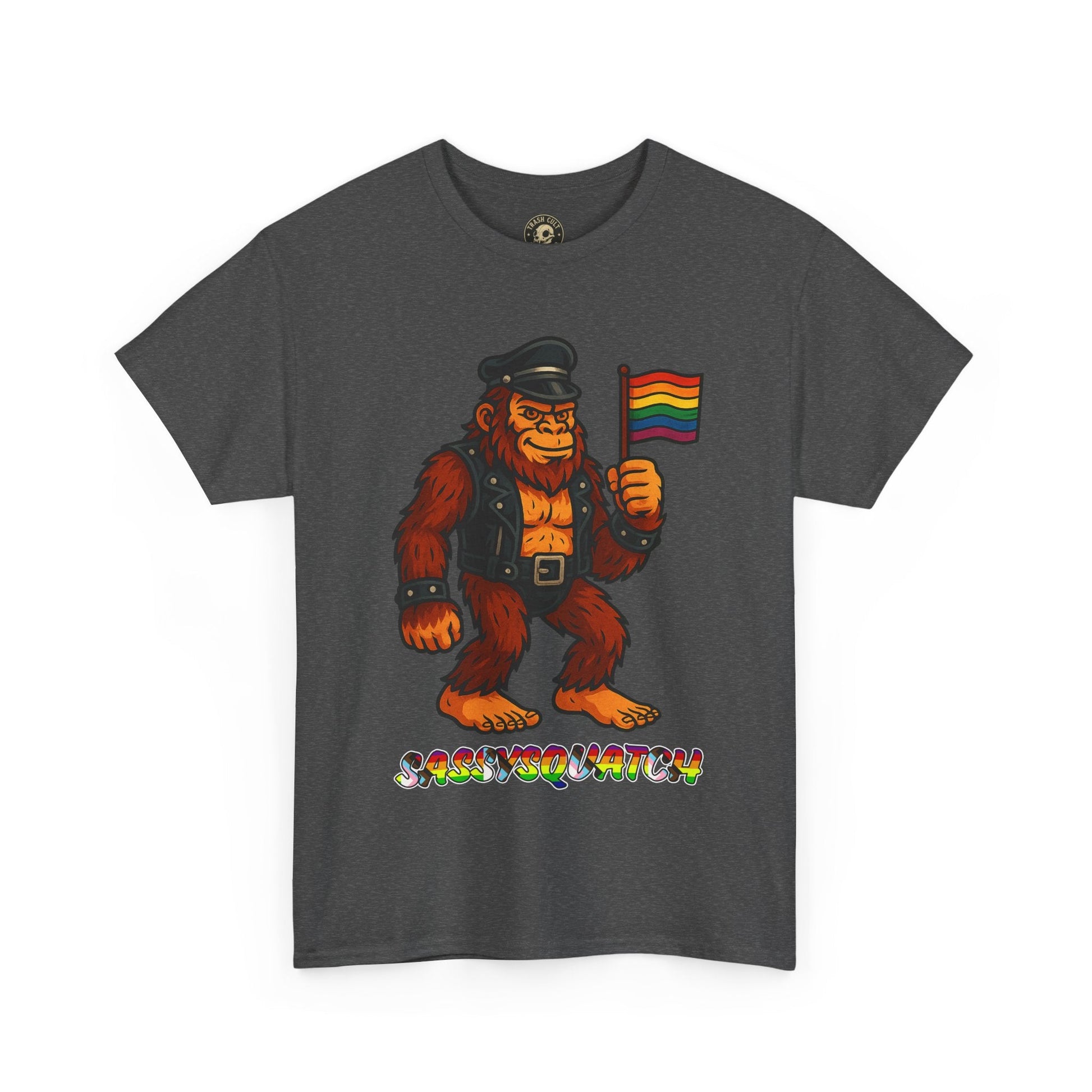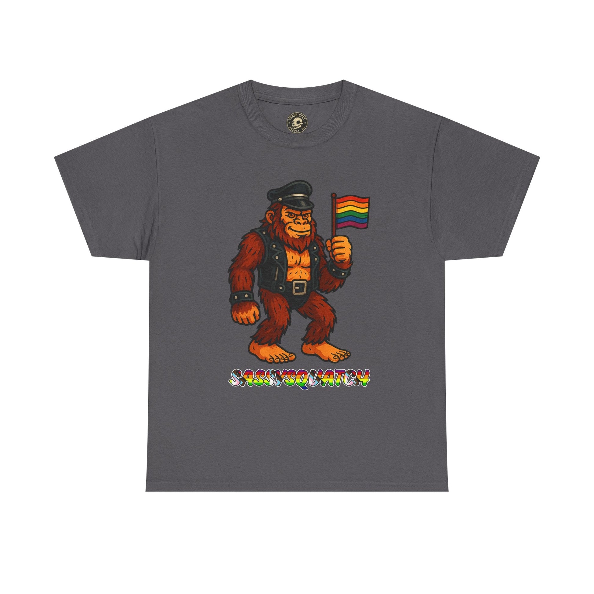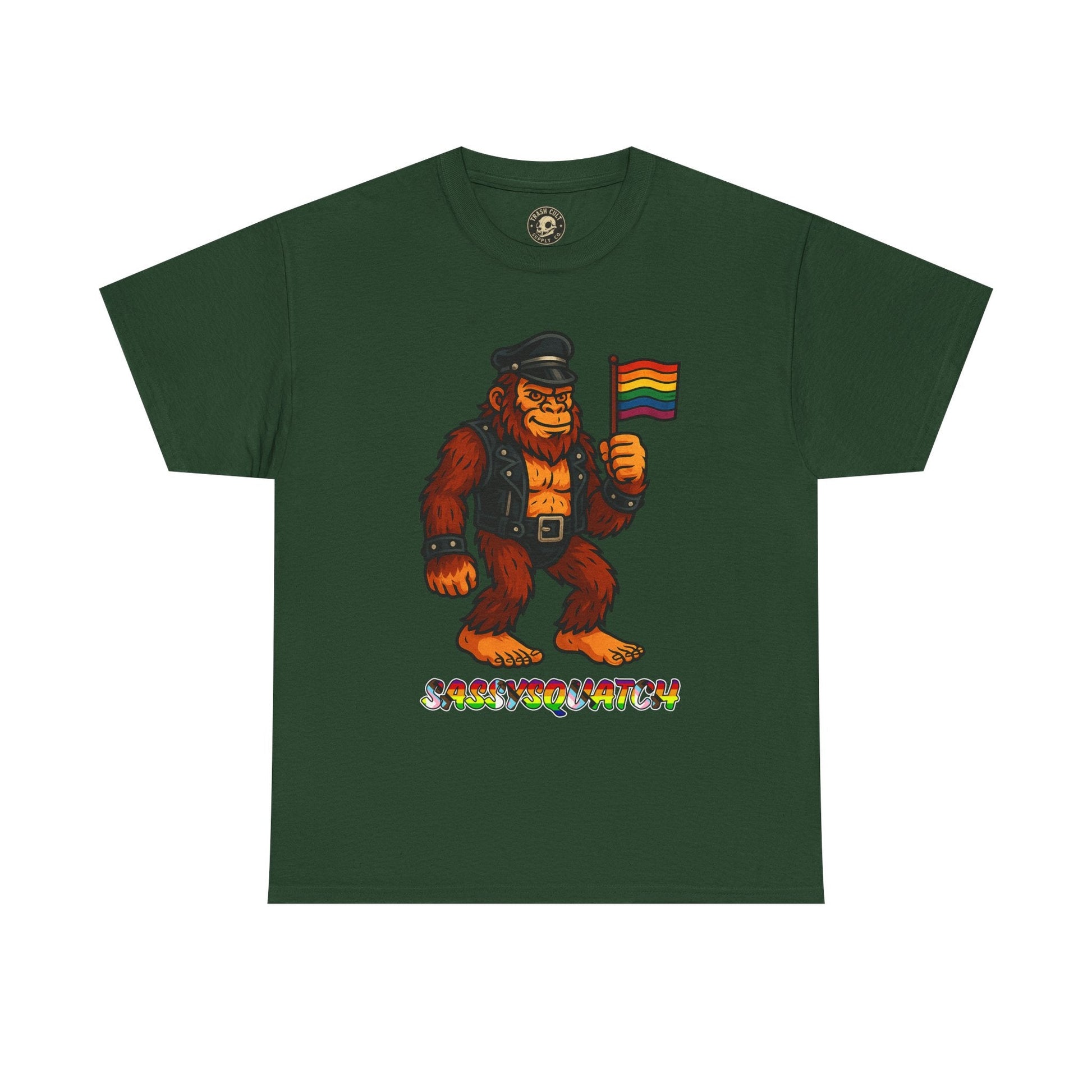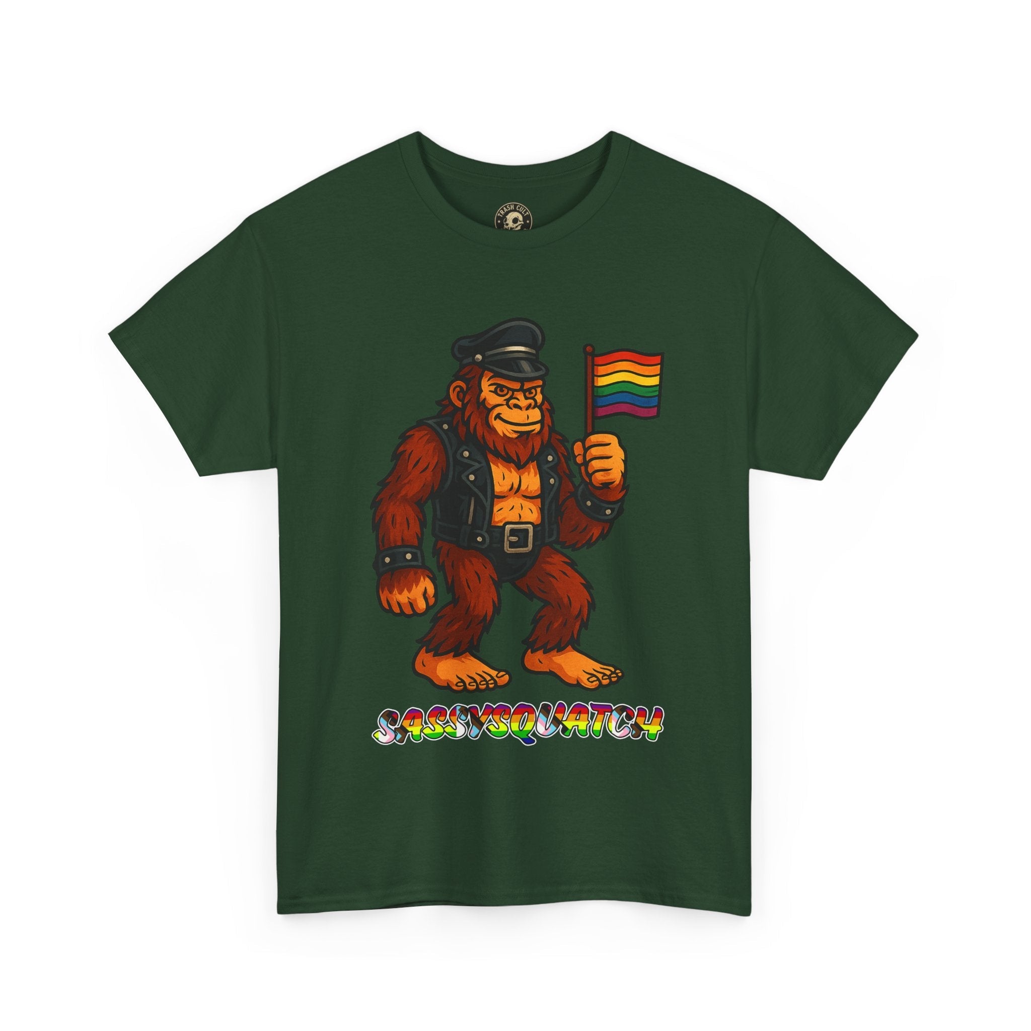 Unleash your inner legend with the Sassysquatch T-Shirt, featuring Bigfoot like you've never seen him before—decked out in full leather and holding a tiny Pride flag with attitude. This hilarious and bold new school design celebrates LGBTQ+ pride, the bear community, and unapologetic self-expression.
