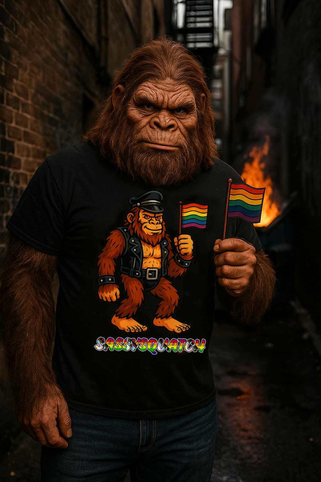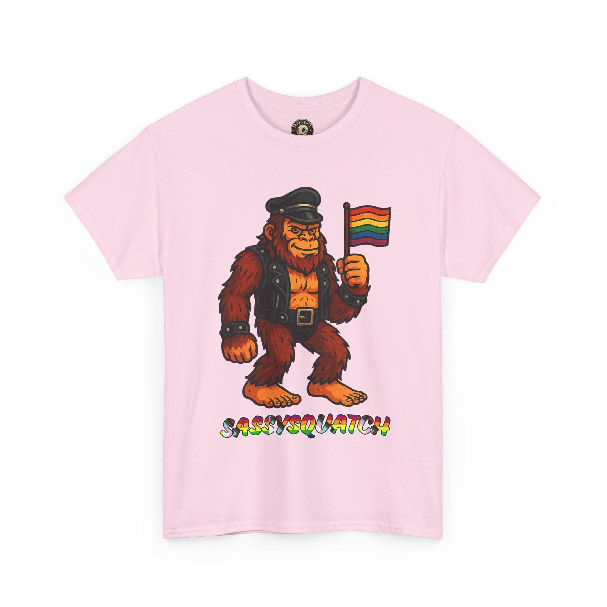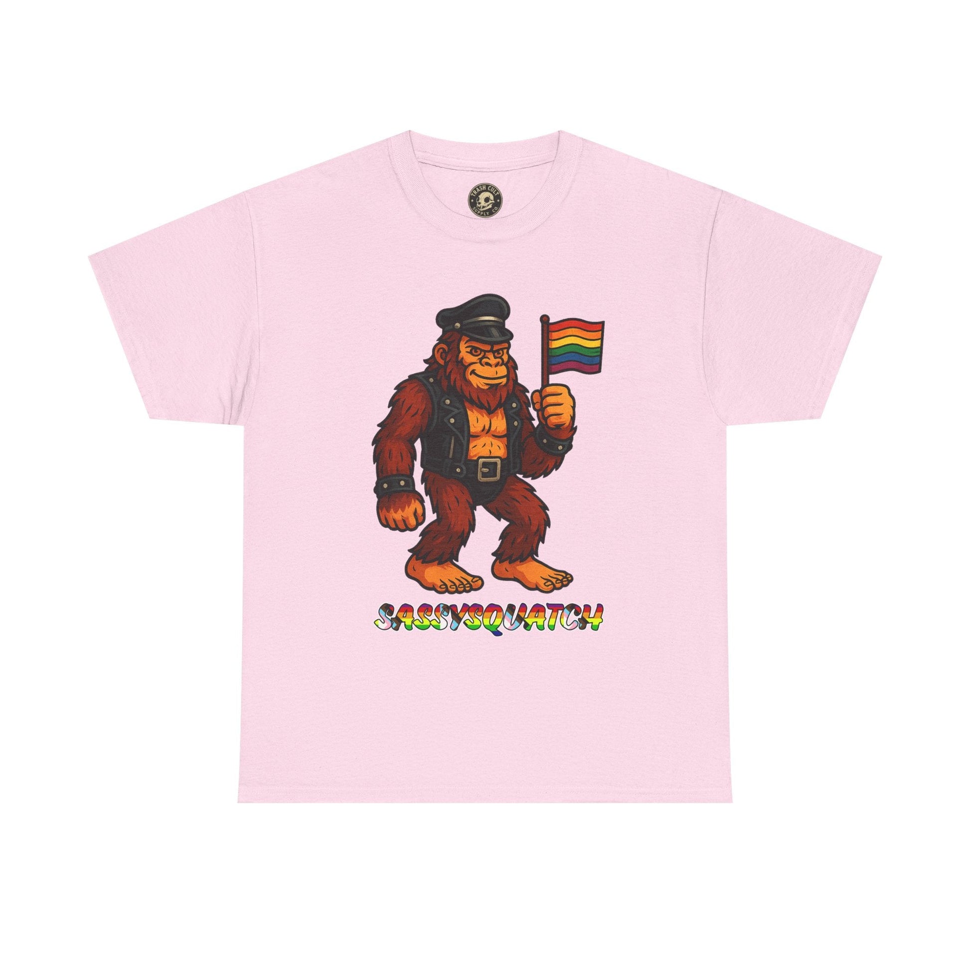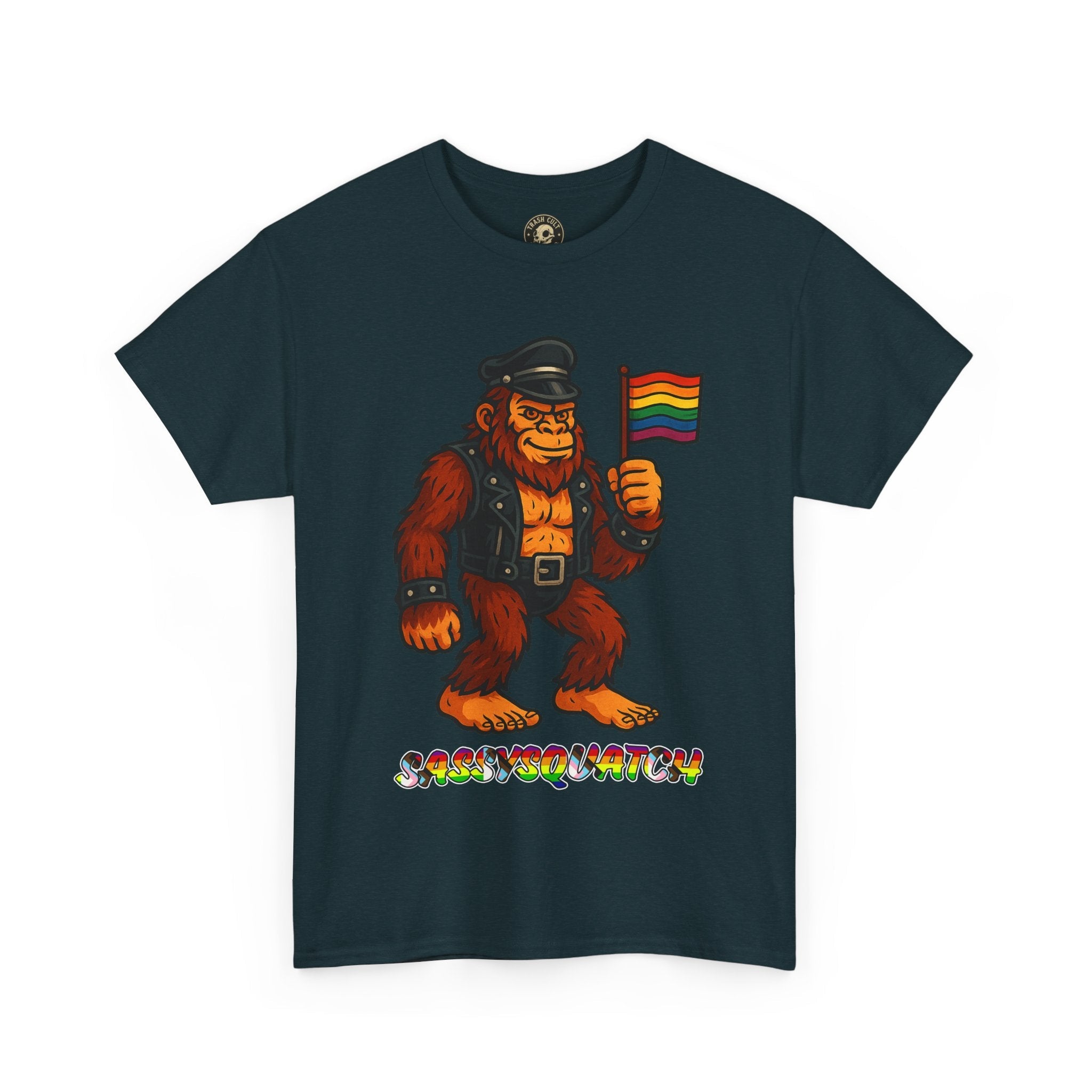 Unleash your inner legend with the Sassysquatch T-Shirt, featuring Bigfoot like you've never seen him before—decked out in full leather and holding a tiny Pride flag with attitude. This hilarious and bold new school design celebrates LGBTQ+ pride, the bear community, and unapologetic self-expression.