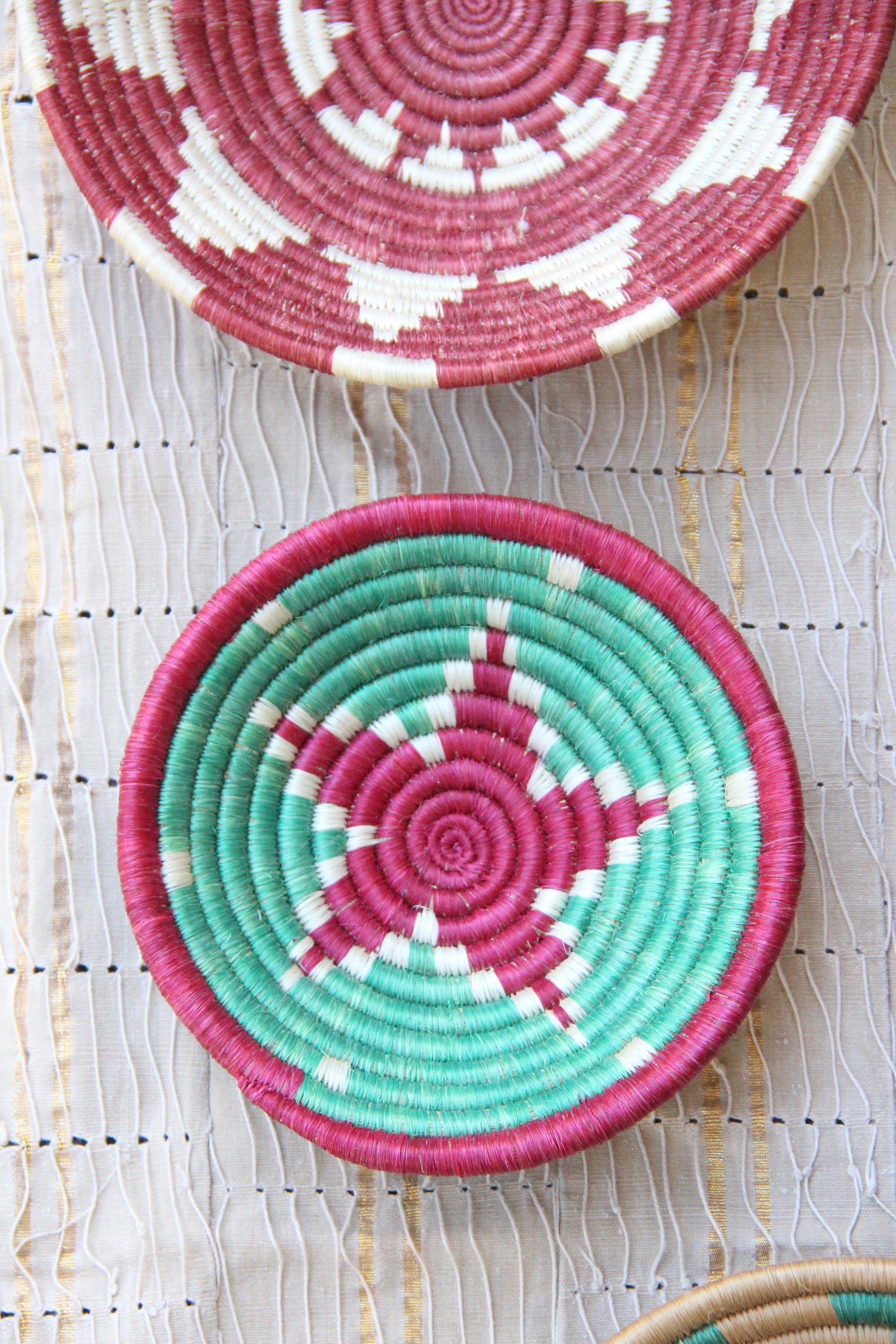 Add some pizzazz to a boring wall or tabletop with this curated and cohesive collection of berry, teal, and neutral African baskets. This colorful set makes it easy to create a global boho home. Handcrafted in Rwanda by women, from Sisal wrapped around native grasses, these vibrant baskets are not only beautiful, but widely functional too.