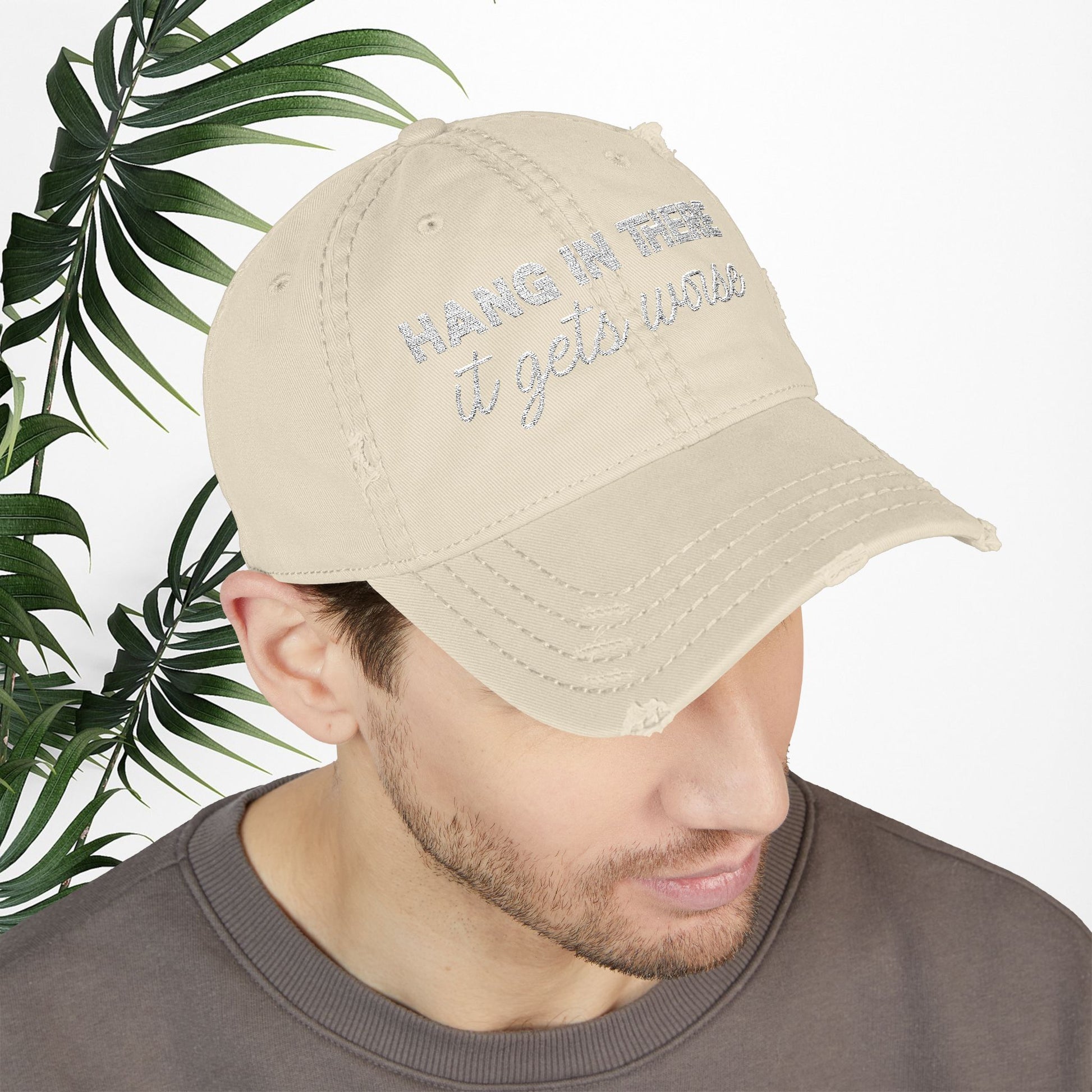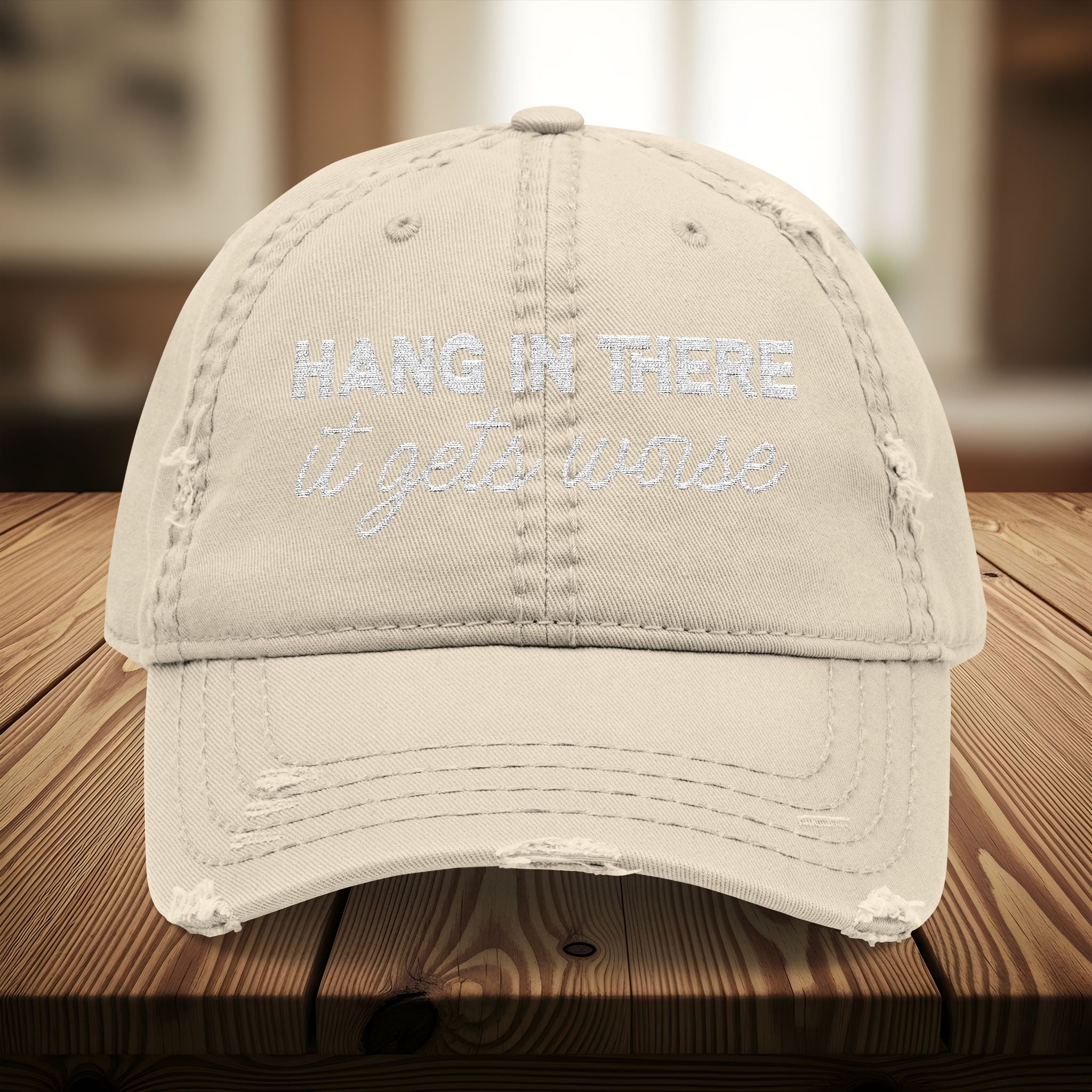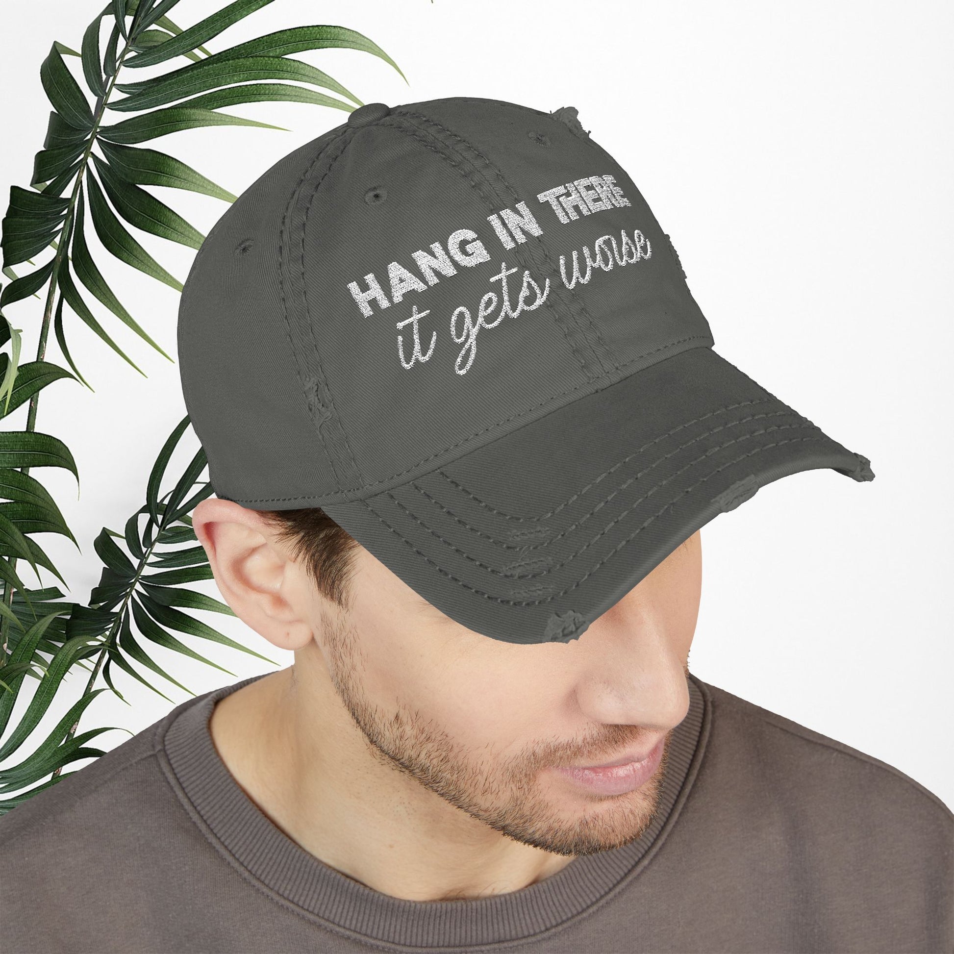 Bespattered Facade "Hang in There" White Embroidered Distressed Cap