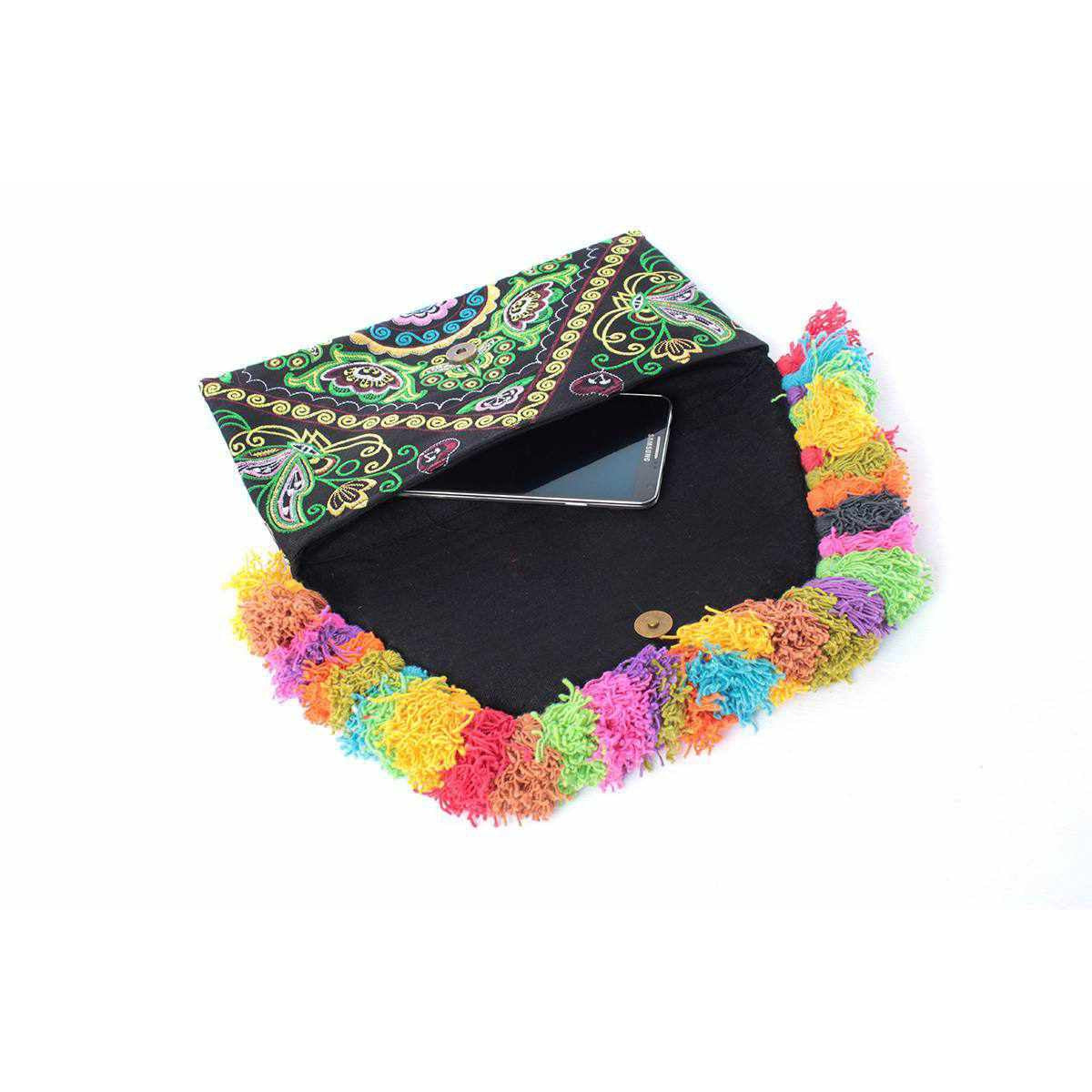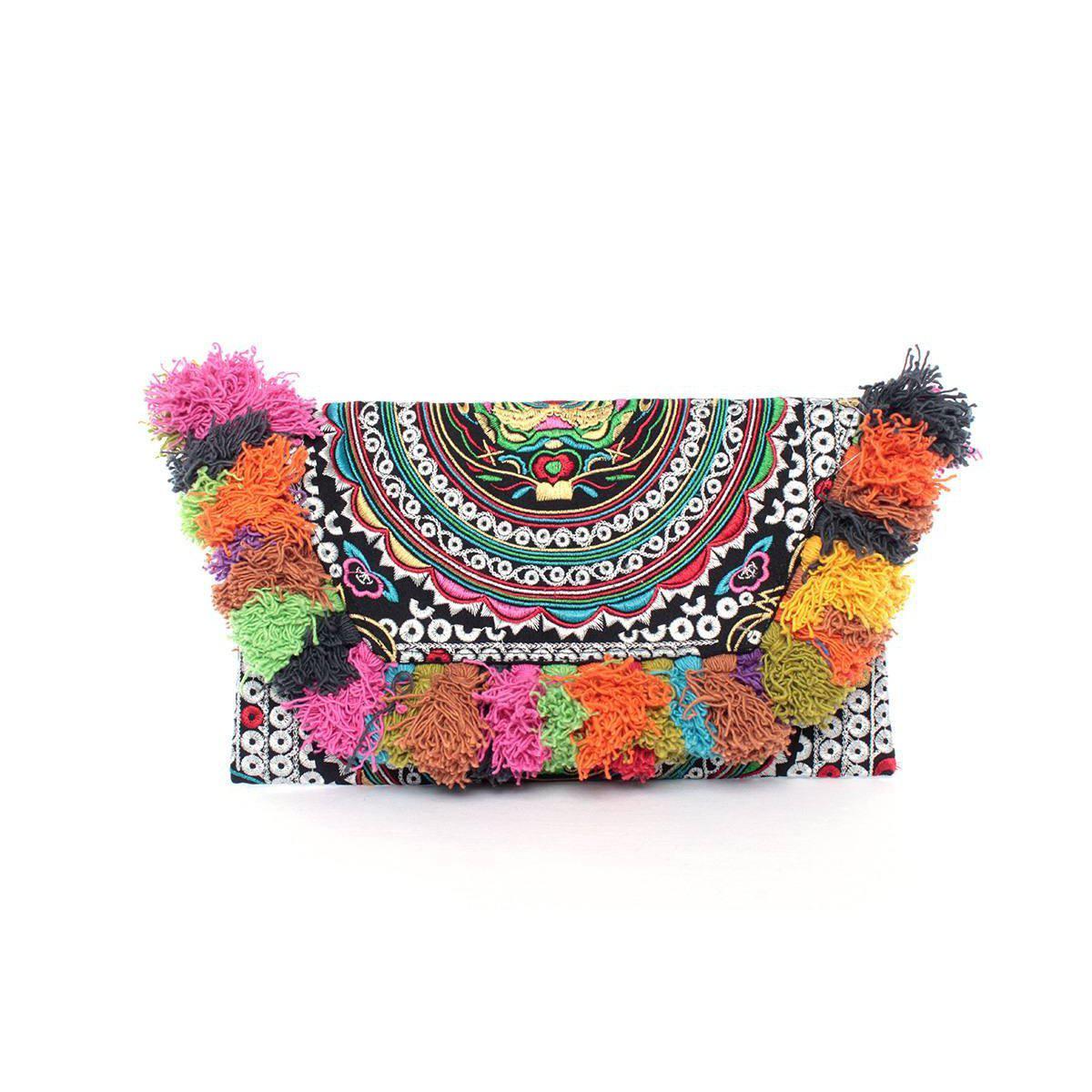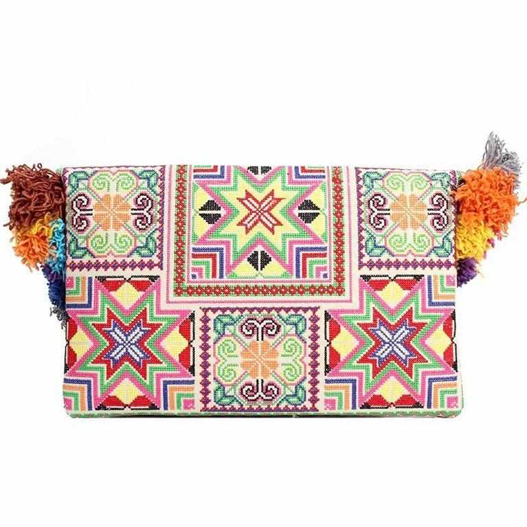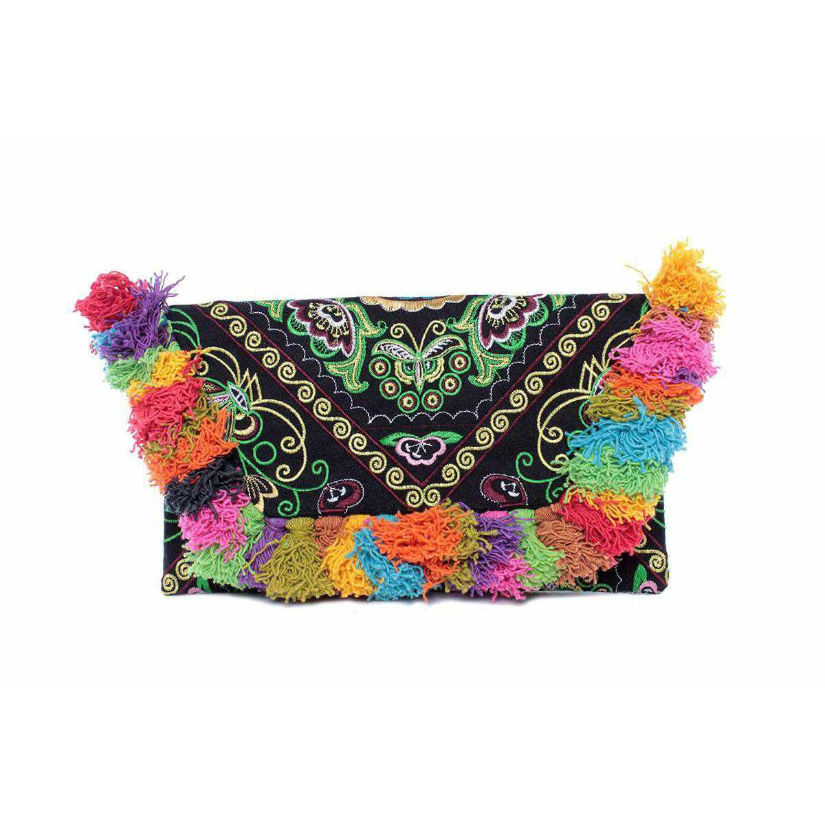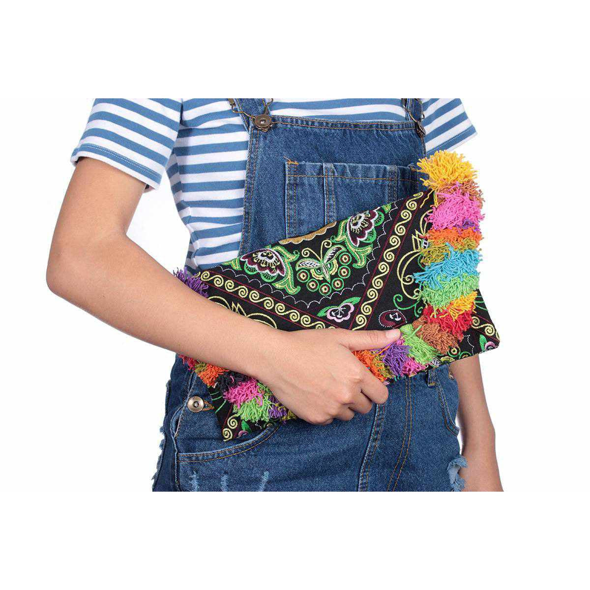 Our Lotus Star bag is part of the limited edition collection here until it's gone!  It is created from gorgeous embroidery in contrasting hues. Handmade by Hmong women artisans that features an embroidered tribal pattern embroidered fabric, black cotton lining, adorned with multi colored fringe pom poms.