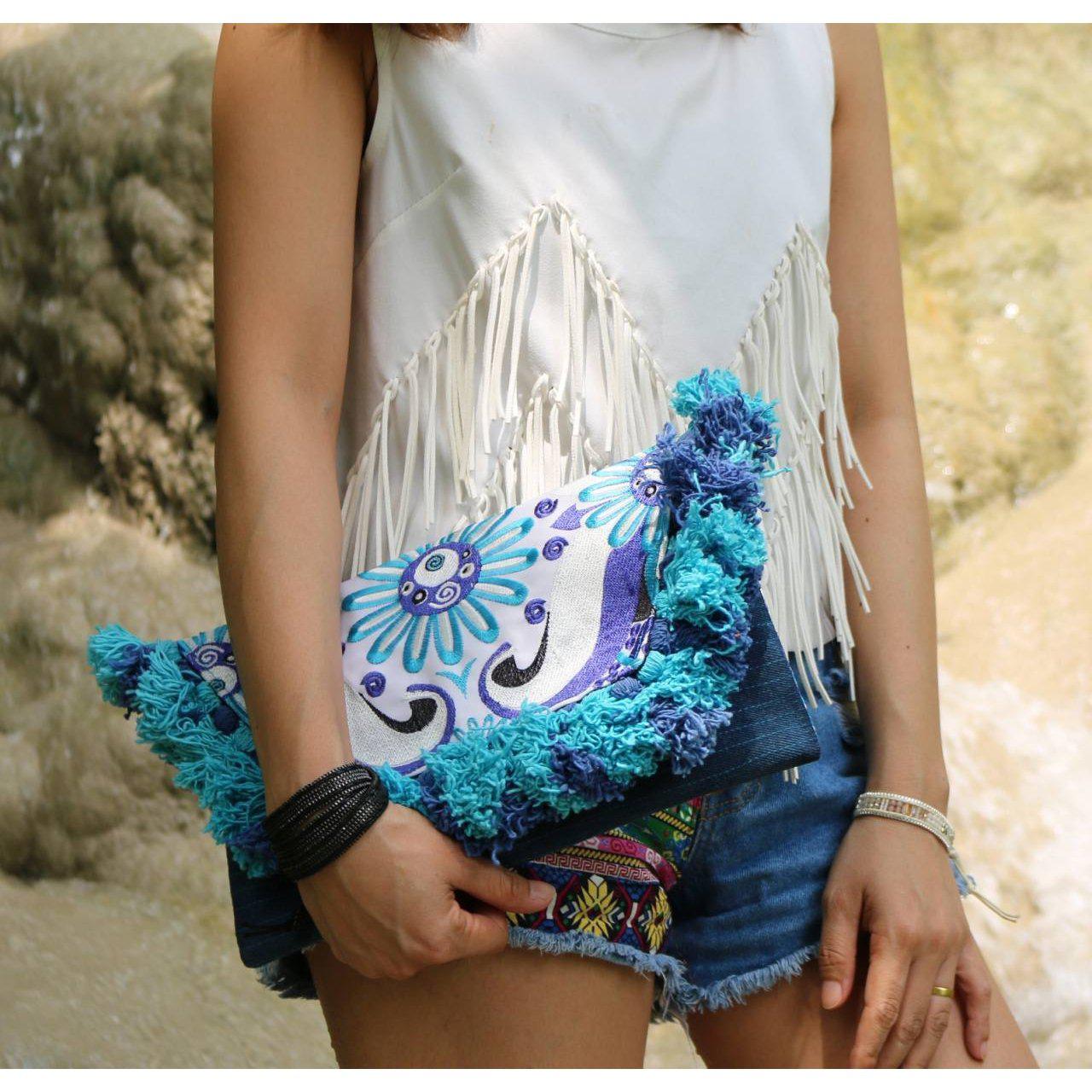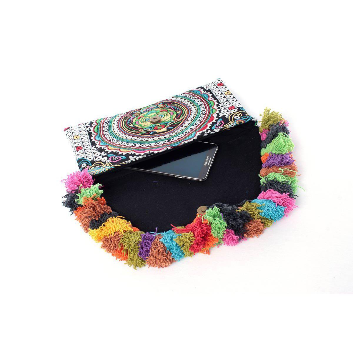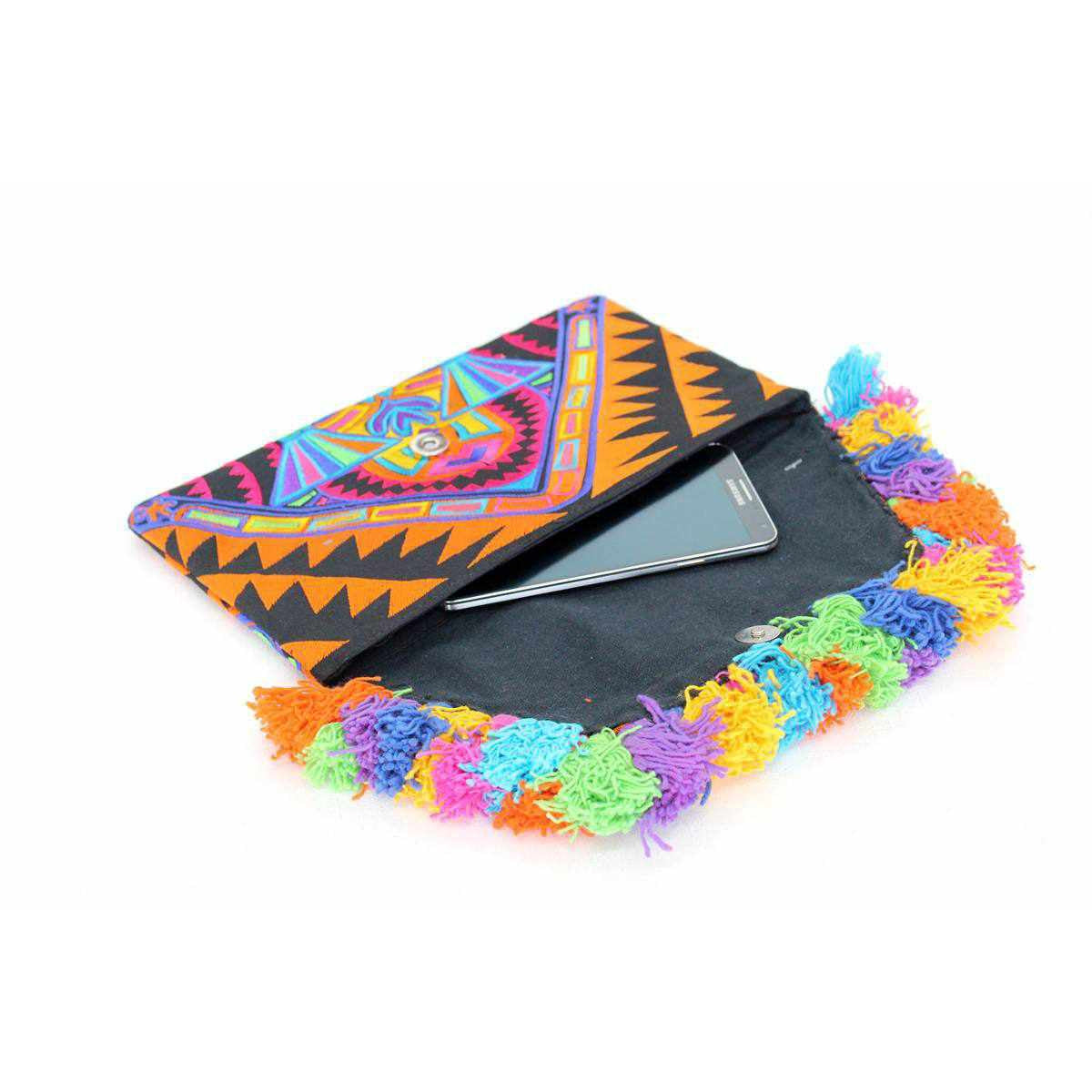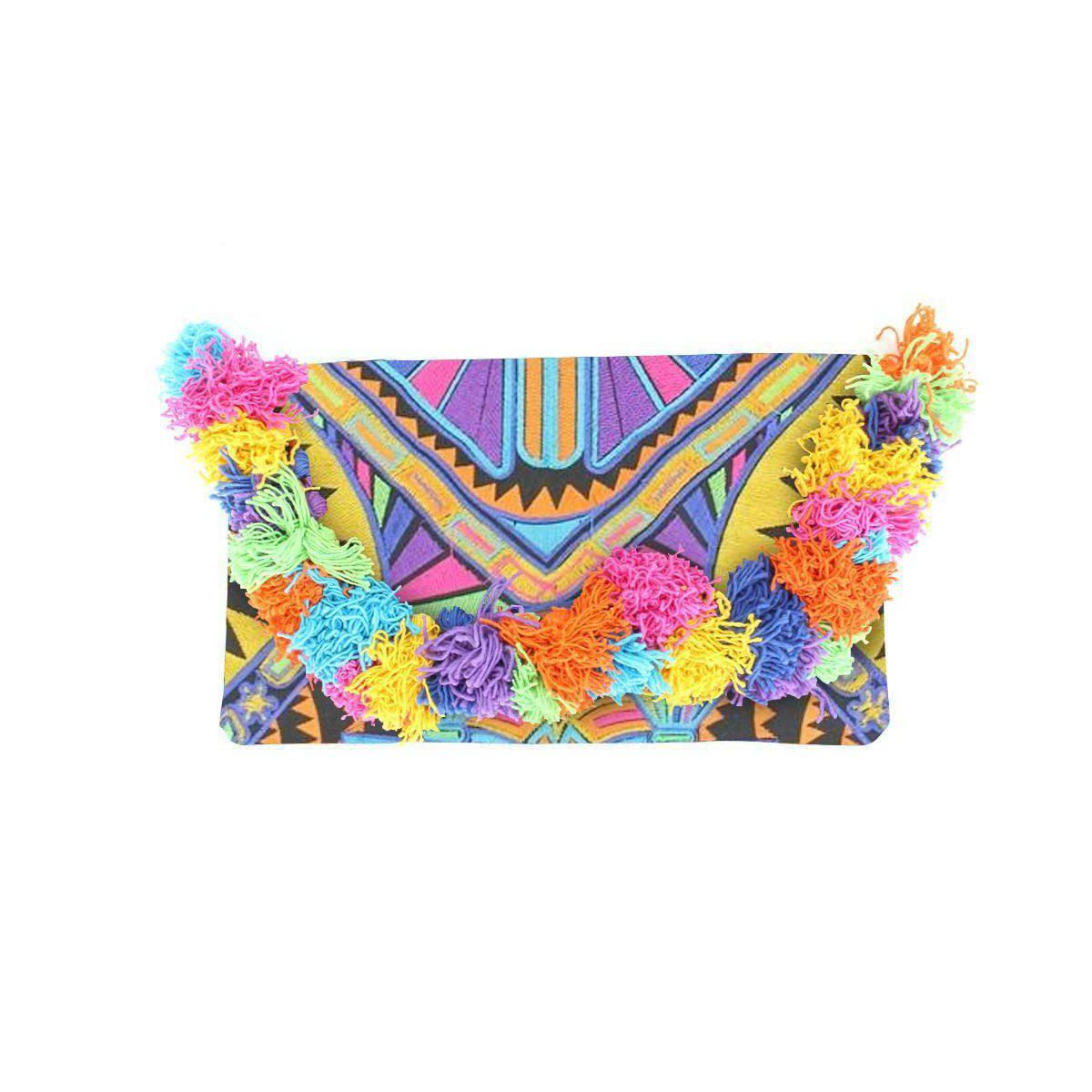 Our Lotus Star bag is part of the limited edition collection here until it's gone!  It is created from gorgeous embroidery in contrasting hues. Handmade by Hmong women artisans that features an embroidered tribal pattern embroidered fabric, black cotton lining, adorned with multi colored fringe pom poms.