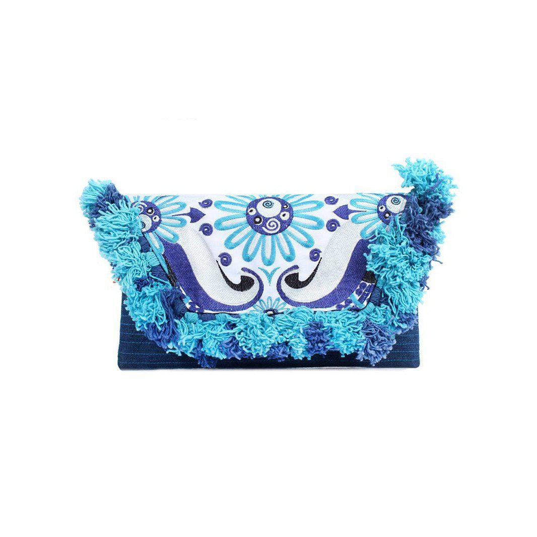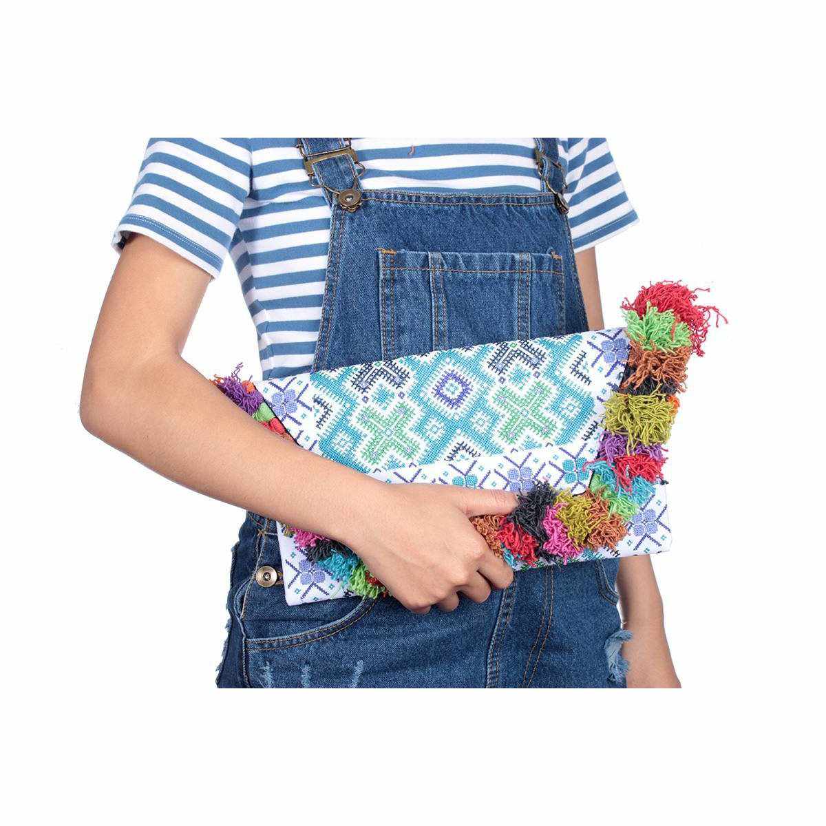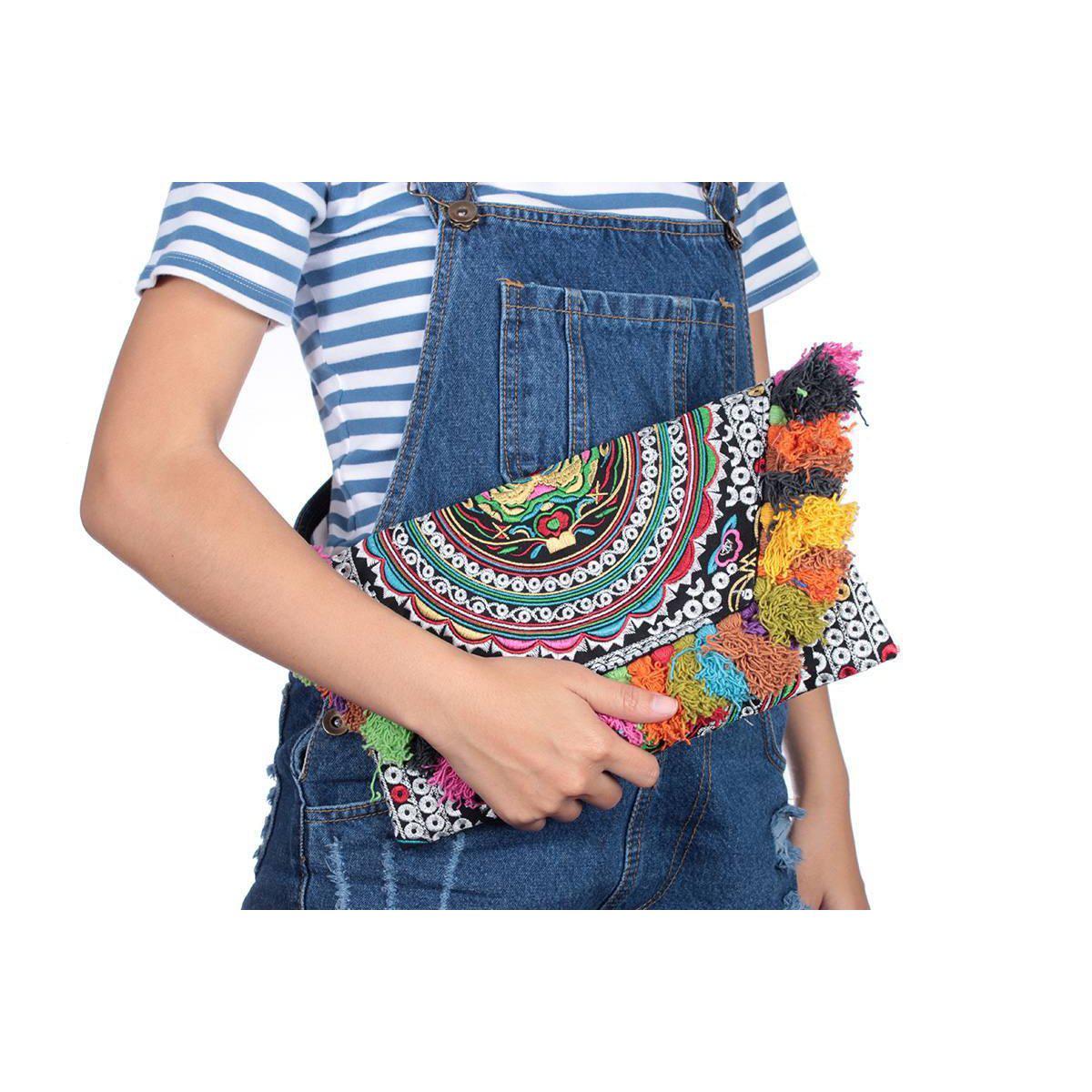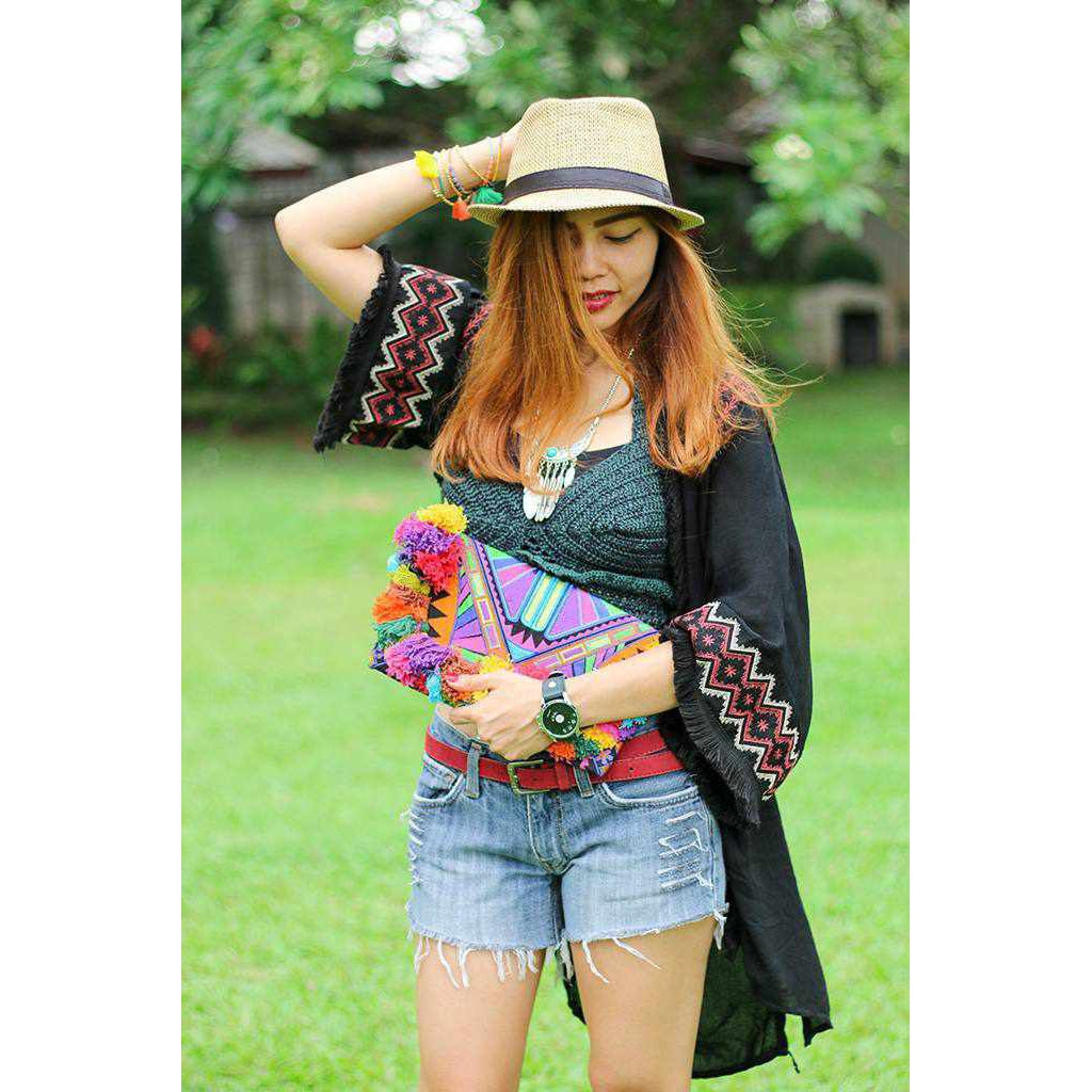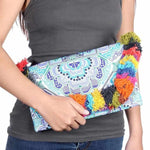 Our Lotus Star bag is part of the limited edition collection here until it's gone!  It is created from gorgeous embroidery in contrasting hues. Handmade by Hmong women artisans that features an embroidered tribal pattern embroidered fabric, black cotton lining, adorned with multi colored fringe pom poms.