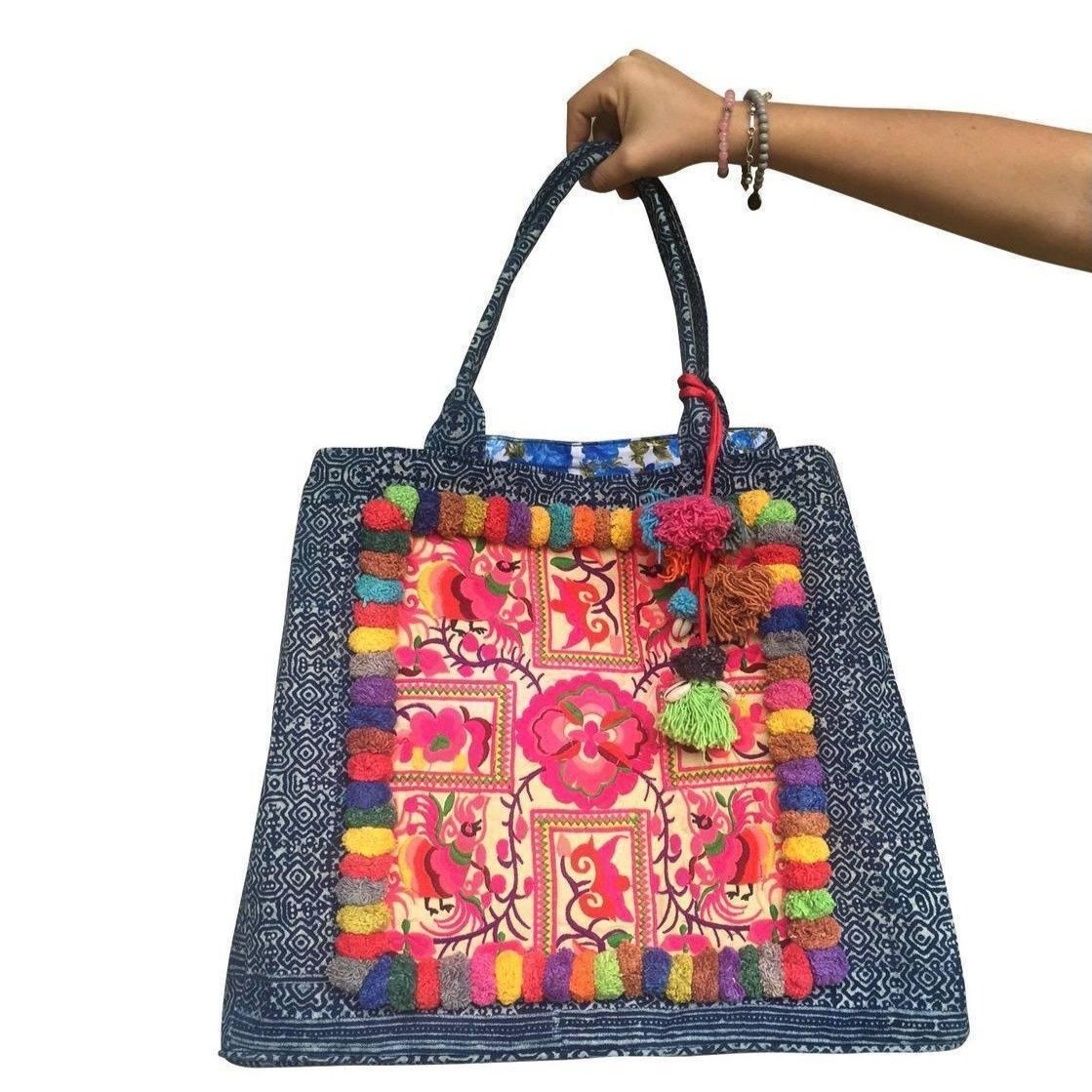 The bag is finished with a bright, embroidered fabric and adorned with handmade pompoms. It has a sturdy metal clip as the closure on top.