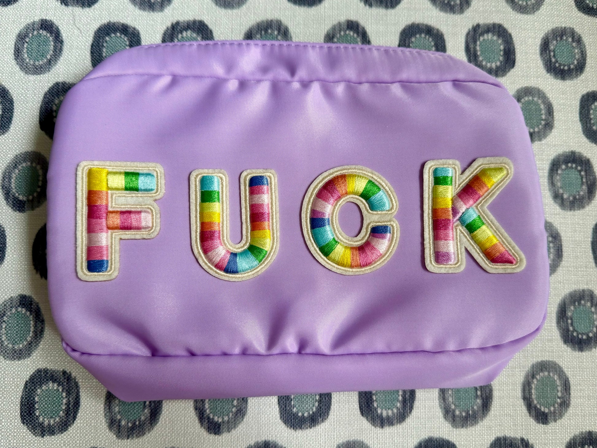 The lightly padded nylon pouch has a gold-tone, smooth-zipping closure and is adorned with Everyone's Favorite Word in a colorful stripe pattern.