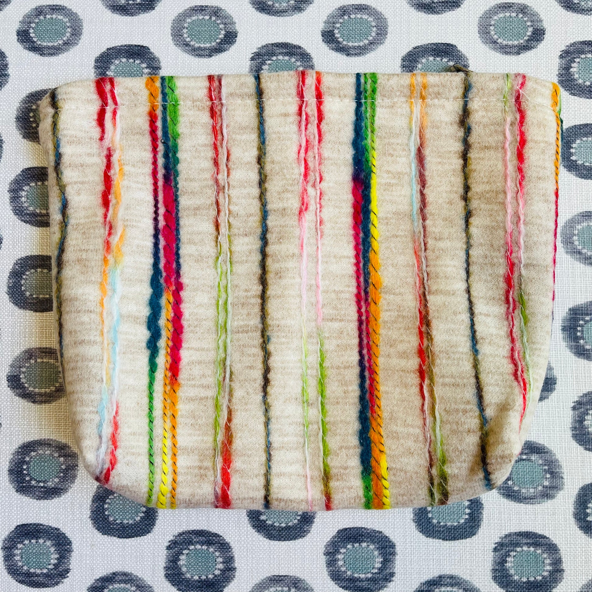 Three (3) bright woven stripe zip pouches with plenty of rainbow color to liven up your day. These bags are made by hand and each one is unique, please expect variations in color and pattern. Each canvas bag has a lined interior and measures: