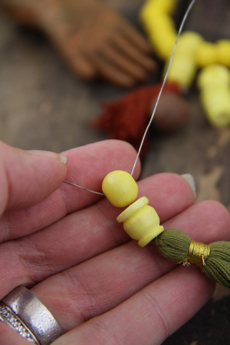 The round bead has 3 holes in it so that you can close off your bracelet or necklace on both sides, then pull the thread through the third hole, and through the column bead, then add a tassel and knot your thread. See the 4th photo for an example of this process in action.