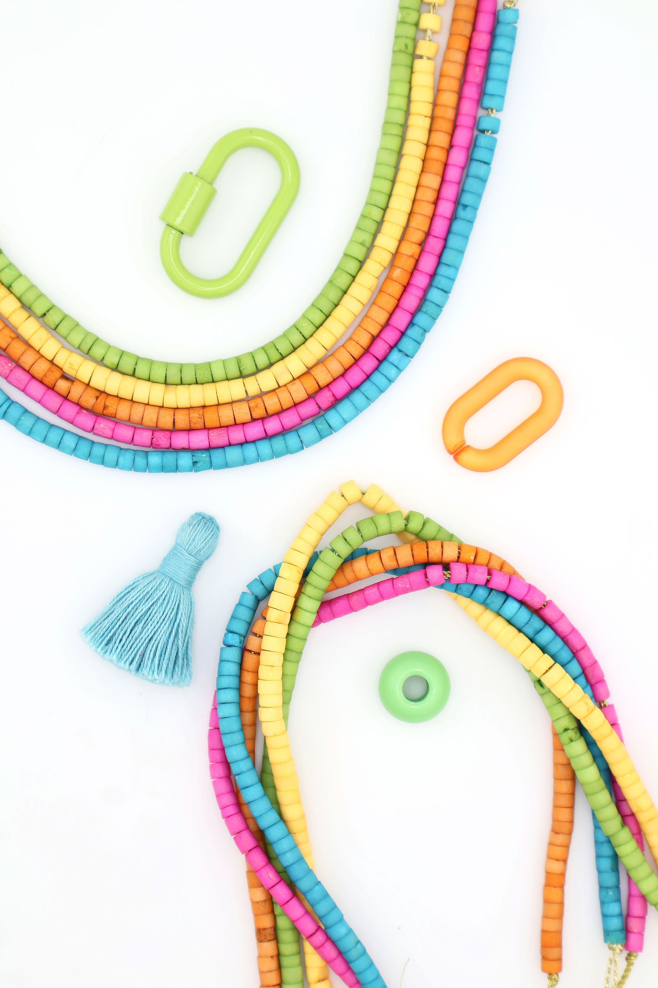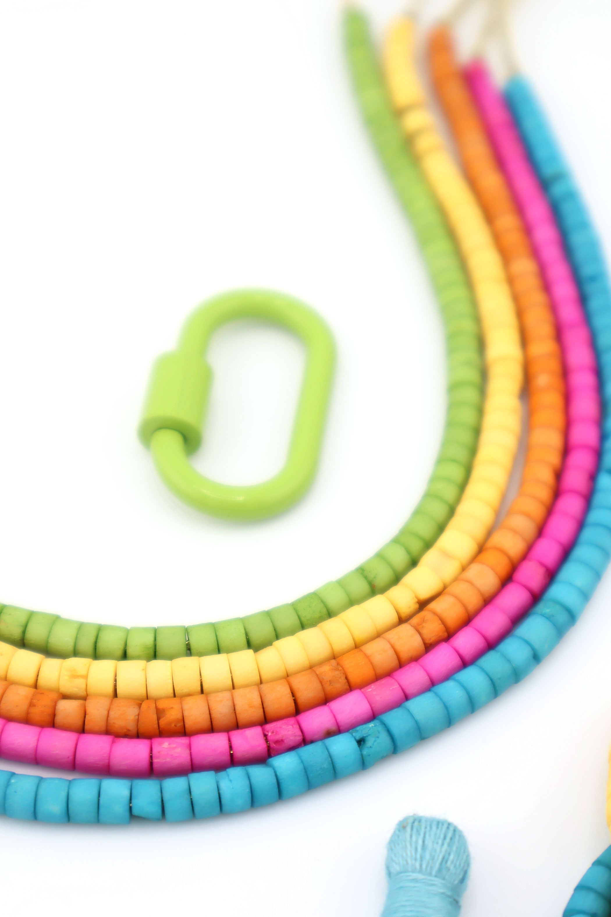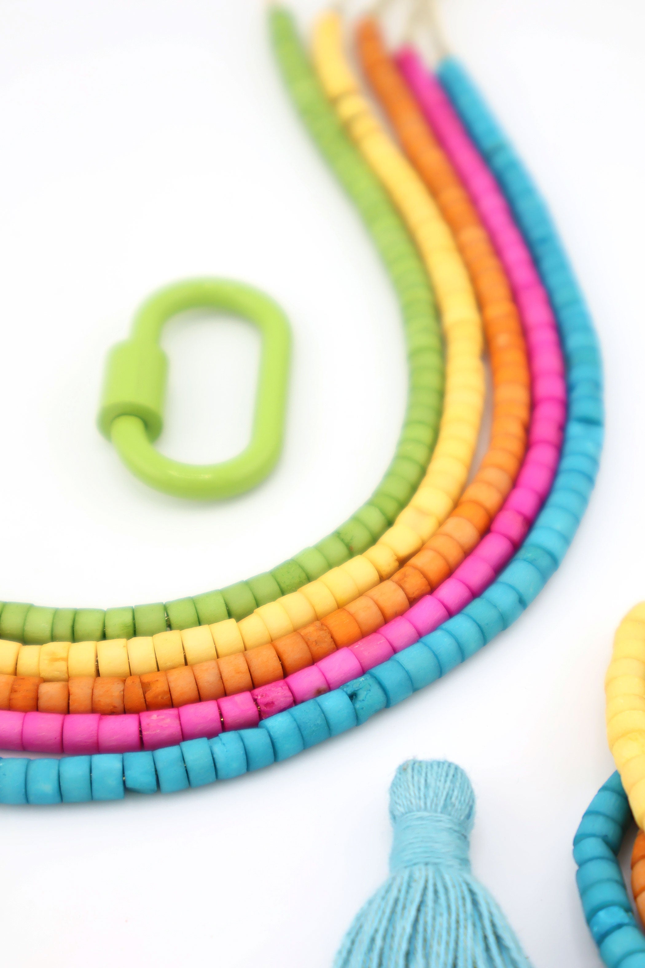 These bone beads are made in India, from water buffalo and cow bone (cruelty-free) that has been dyed in 5 vibrant shades. These would make excellent spacer beads or additions to your bohemian inspired jewelry designs.
