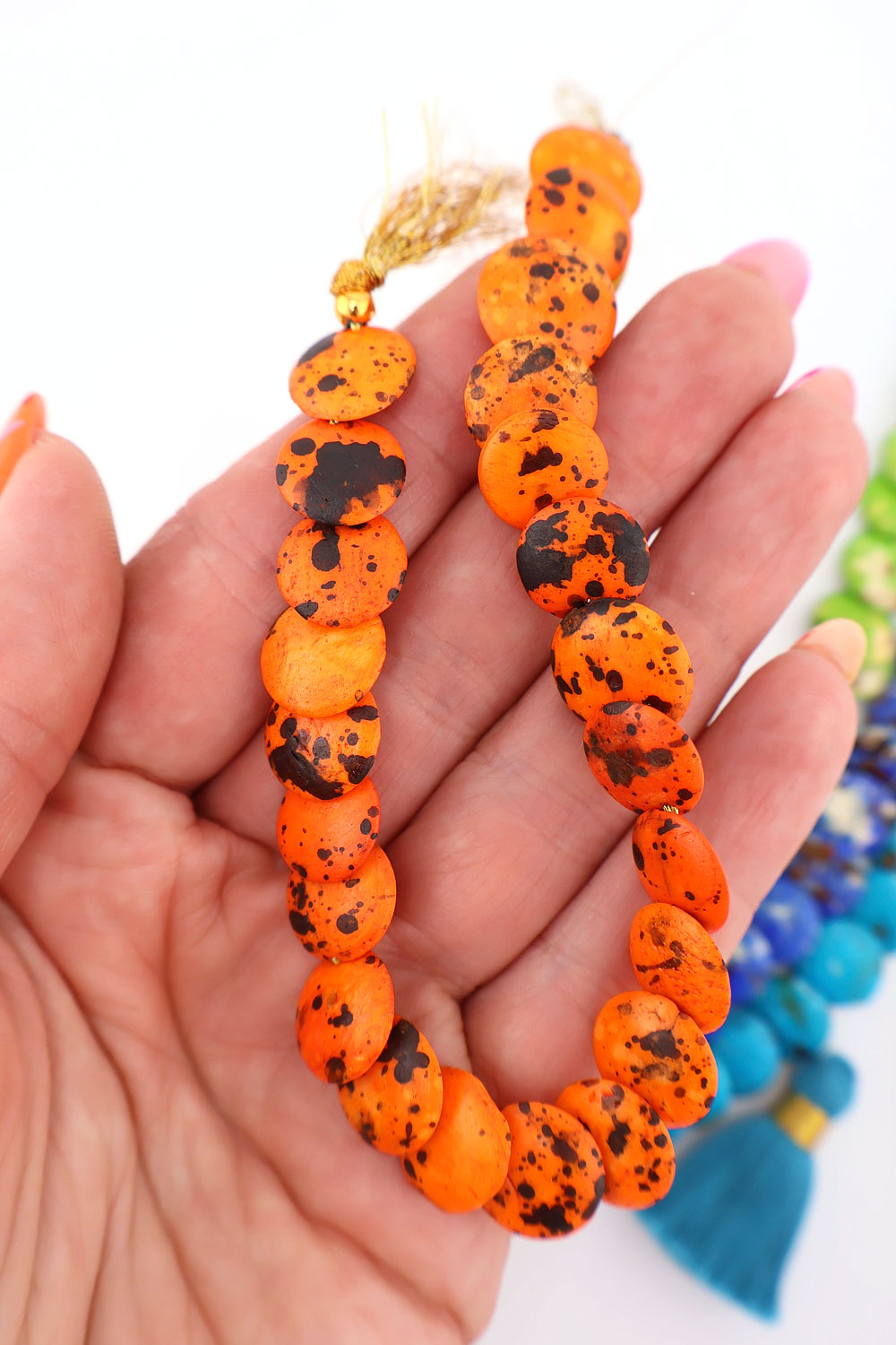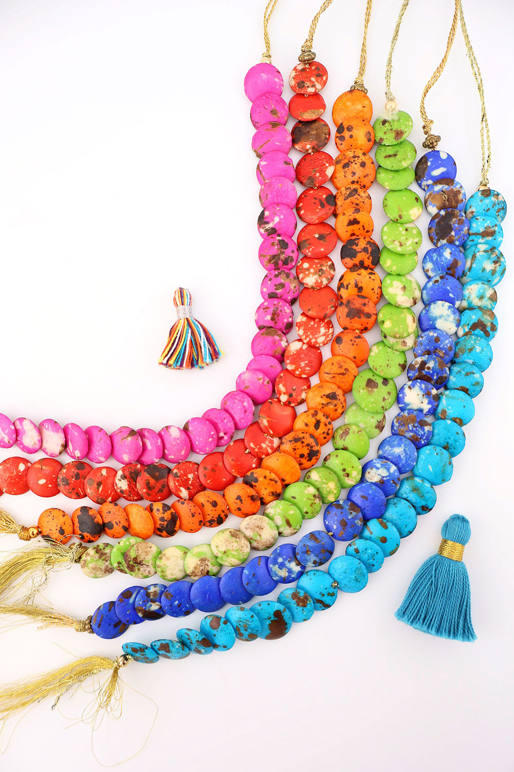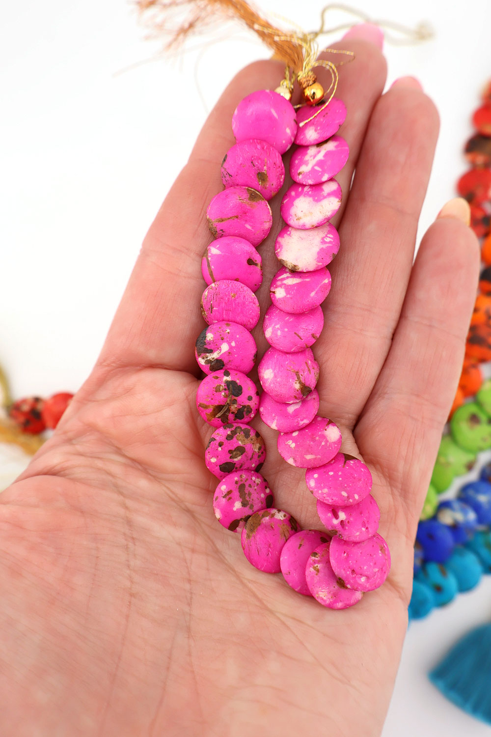 These cascading coin-shaped bone beads sit in such a cool manner when made into a bracelet. With a beautiful speckled visual texture, the colors on these are so striking. Choose your color, or choose them all and mix them together for a fun rainbow look.