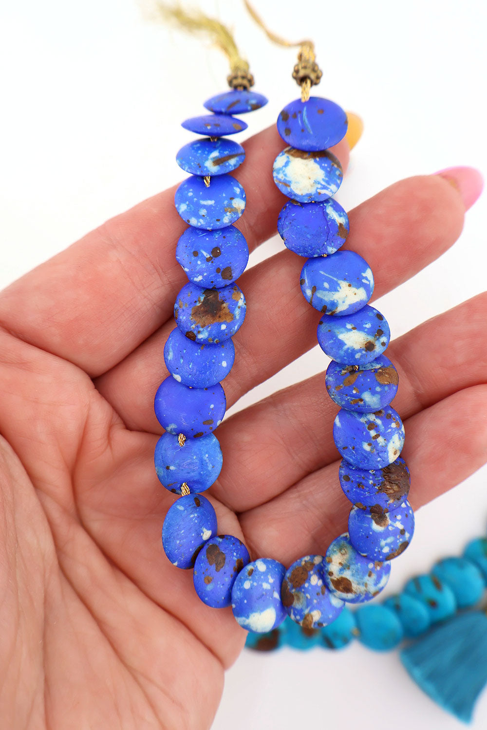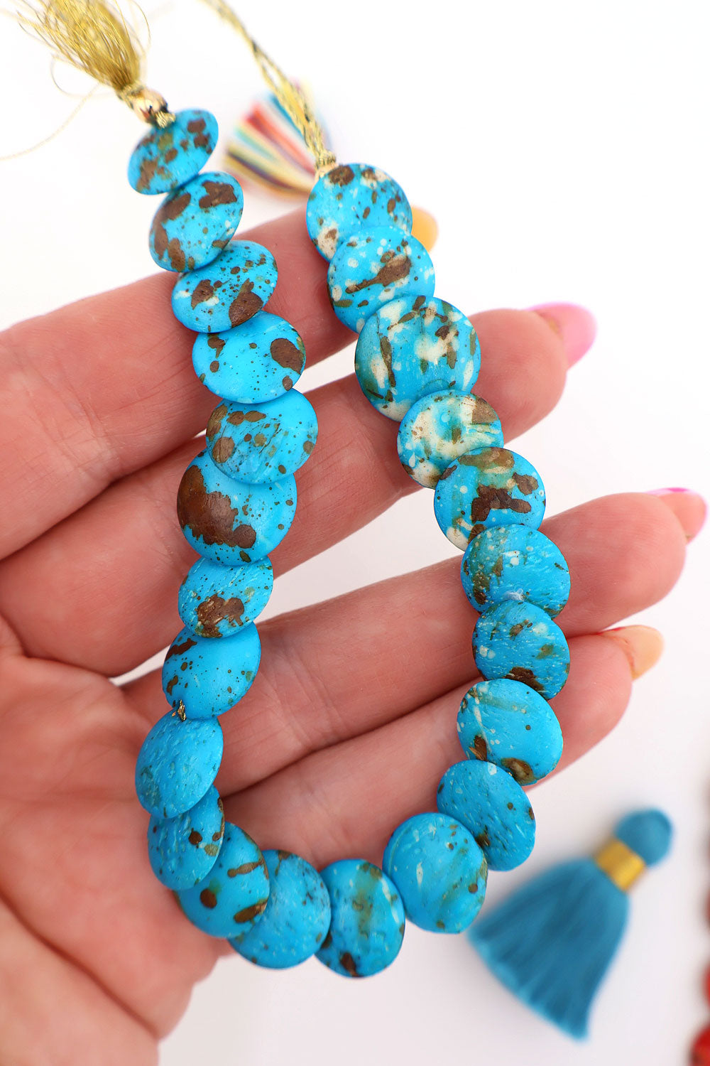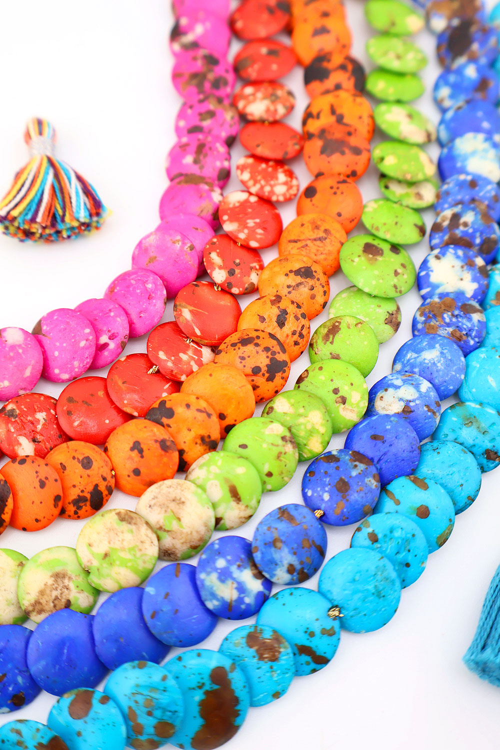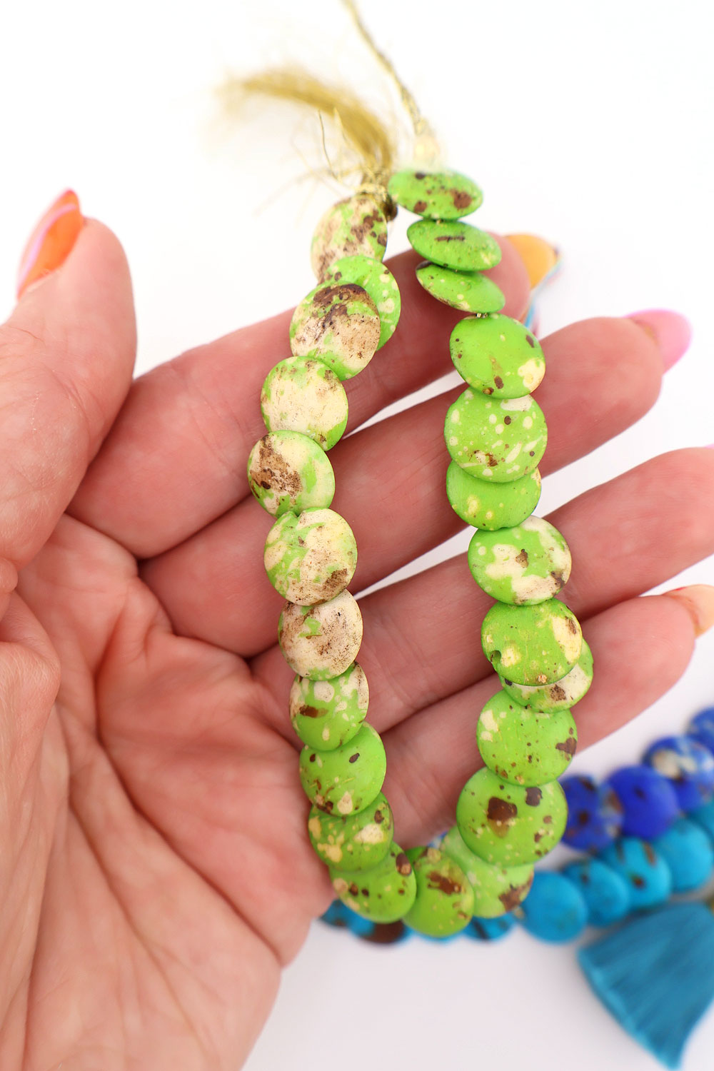 These cascading coin-shaped bone beads sit in such a cool manner when made into a bracelet. With a beautiful speckled visual texture, the colors on these are so striking. Choose your color, or choose them all and mix them together for a fun rainbow look.