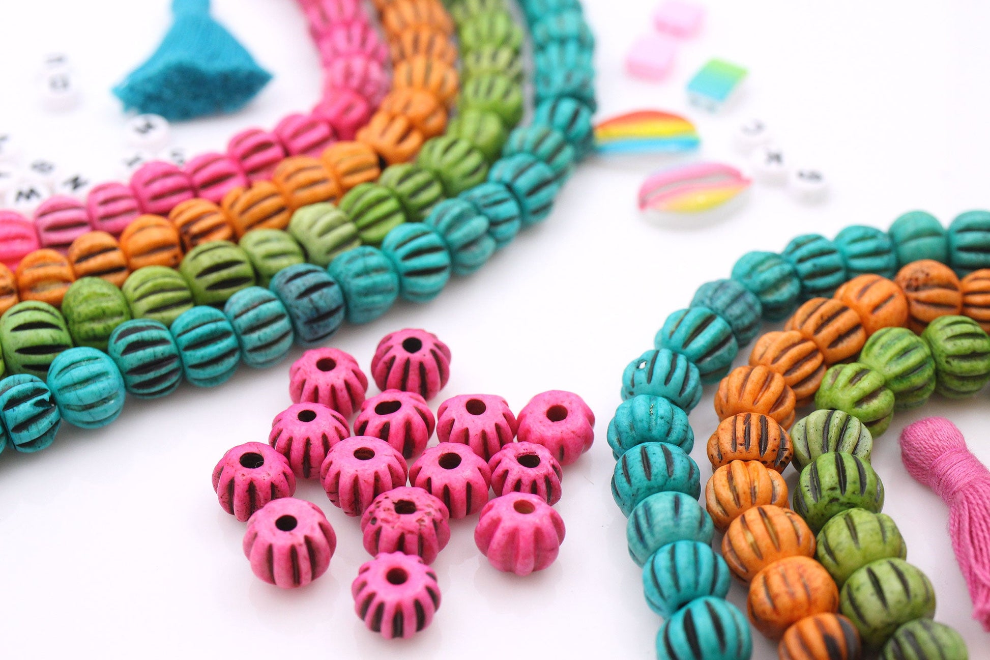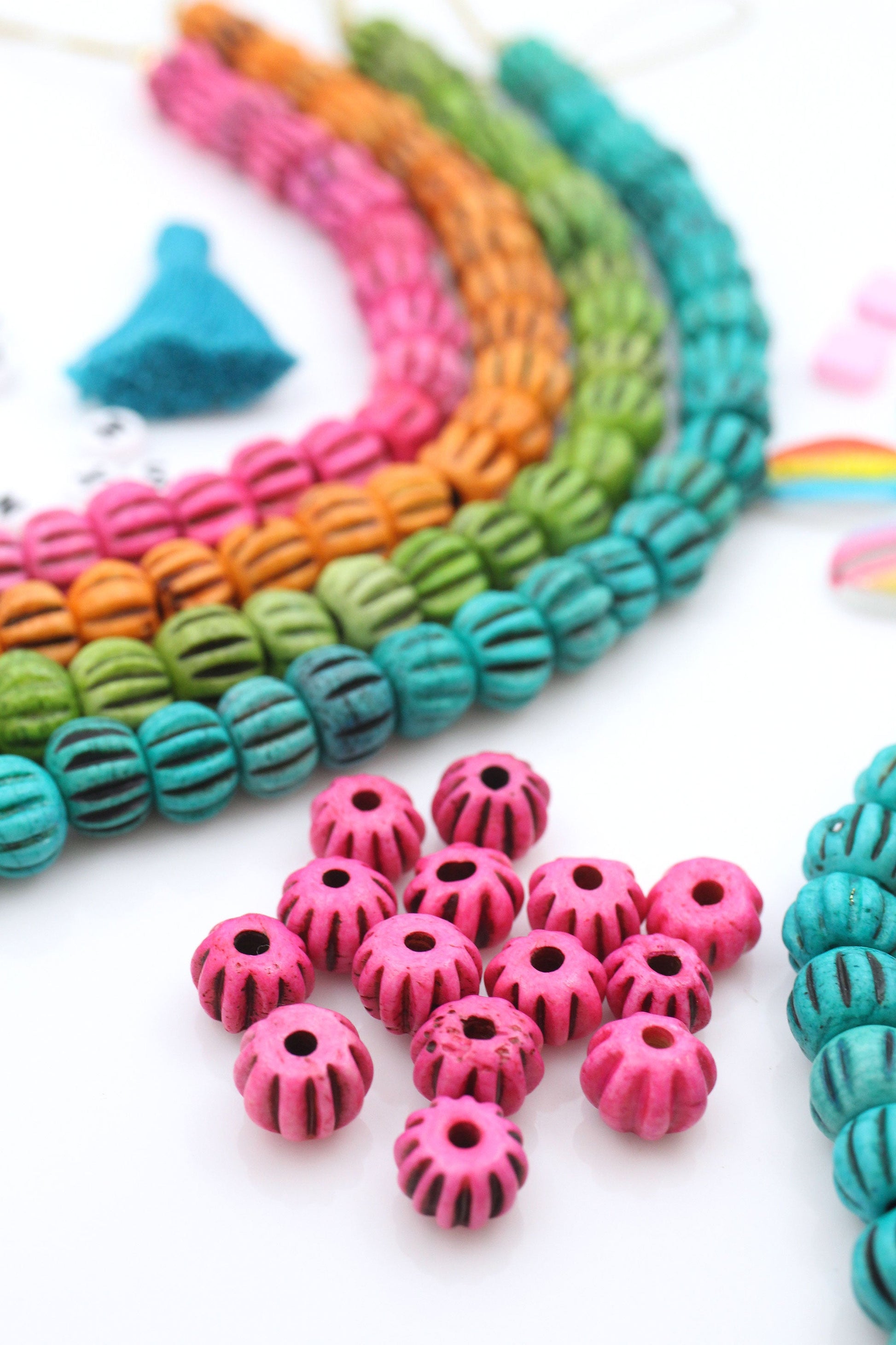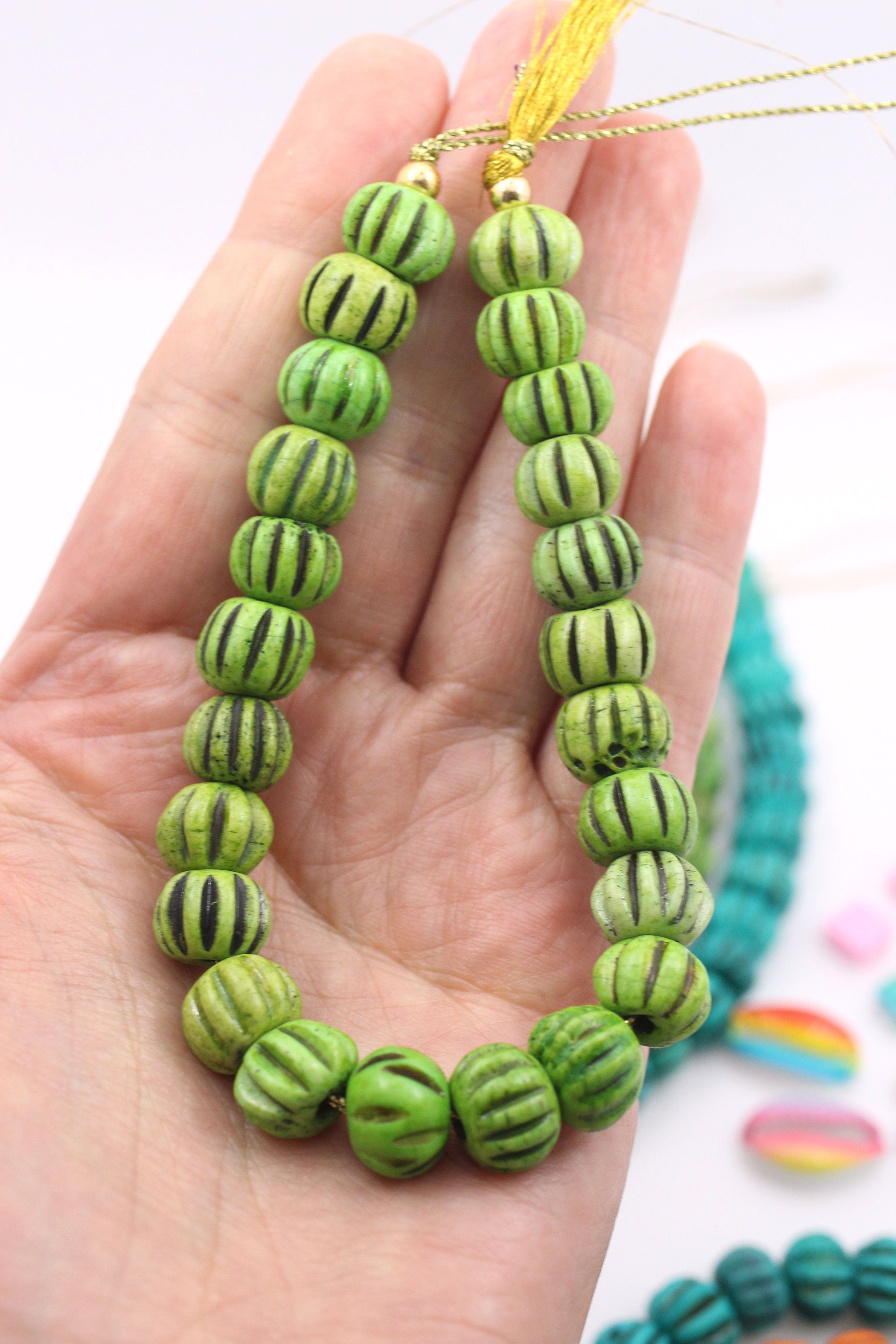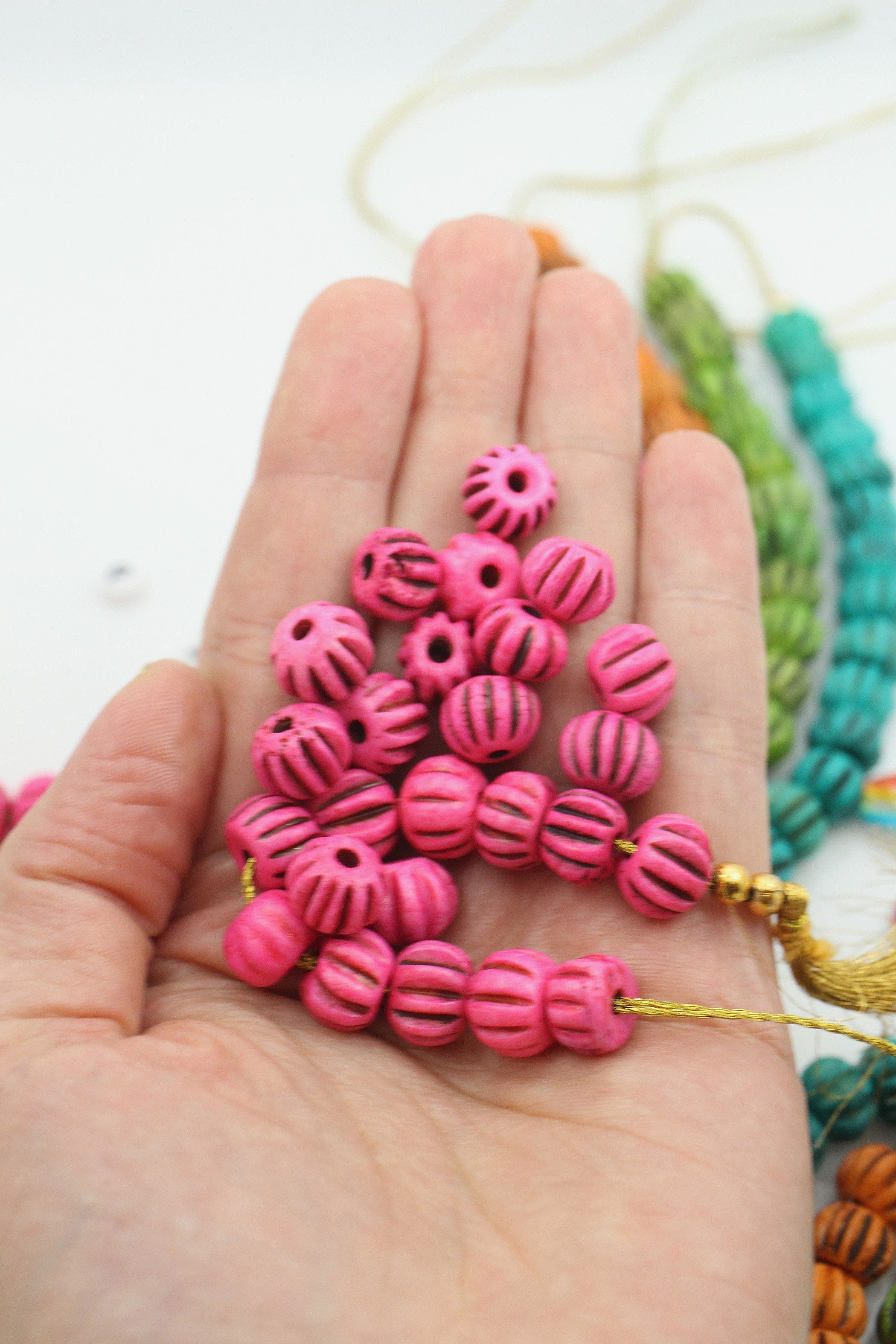 What a striking, eye-catching, and tactile pattern these beads have! Such a great shape for spacer beads in your beaded jewelry, these beads are entirely hand-crafted. They are perfect for making earthy-girl and yoga-inspired jewelry. Made in India, from cow bone that has been carved into a ridged melon pattern.