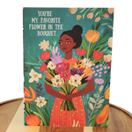 Show someone special just how much they mean to you with this vibrant and heartwarming greeting card. Featuring an exquisite illustration of a Black woman holding a lush, colorful bouquet, this card's message, "YOU'RE MY FAVORITE FLOWER IN THE BOUQUET," makes it perfect for expressing deep appreciation.