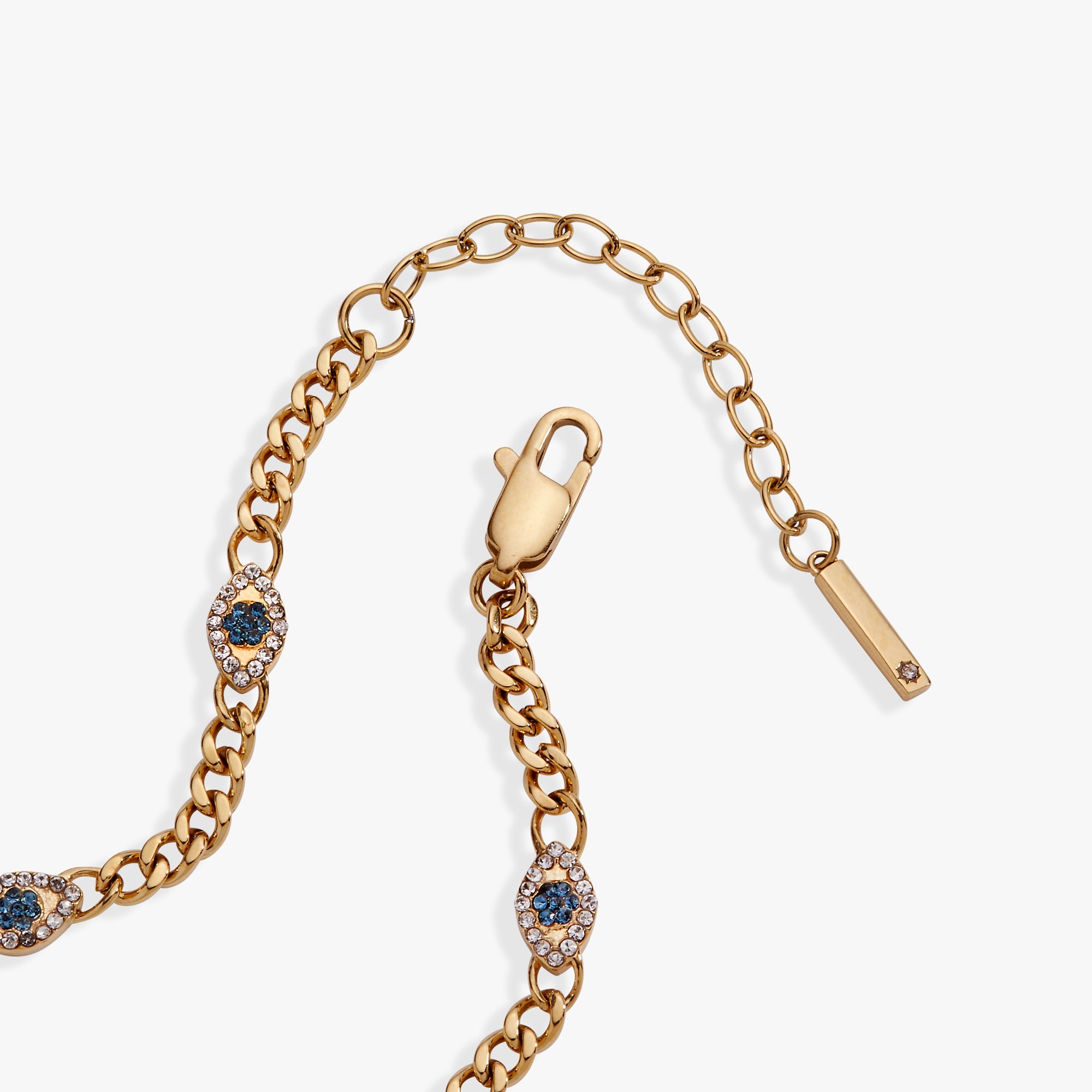 The Evil Eye Curb Chain Inline Bracelet makes a bold statement with its sharp, faceted curb chain and dazzling sapphire and crystal stones. A striking mix of contrast and brilliance, it blends edgy craftsmanship with radiant sparkle, perfect for elevating any look with confidence and attitude.