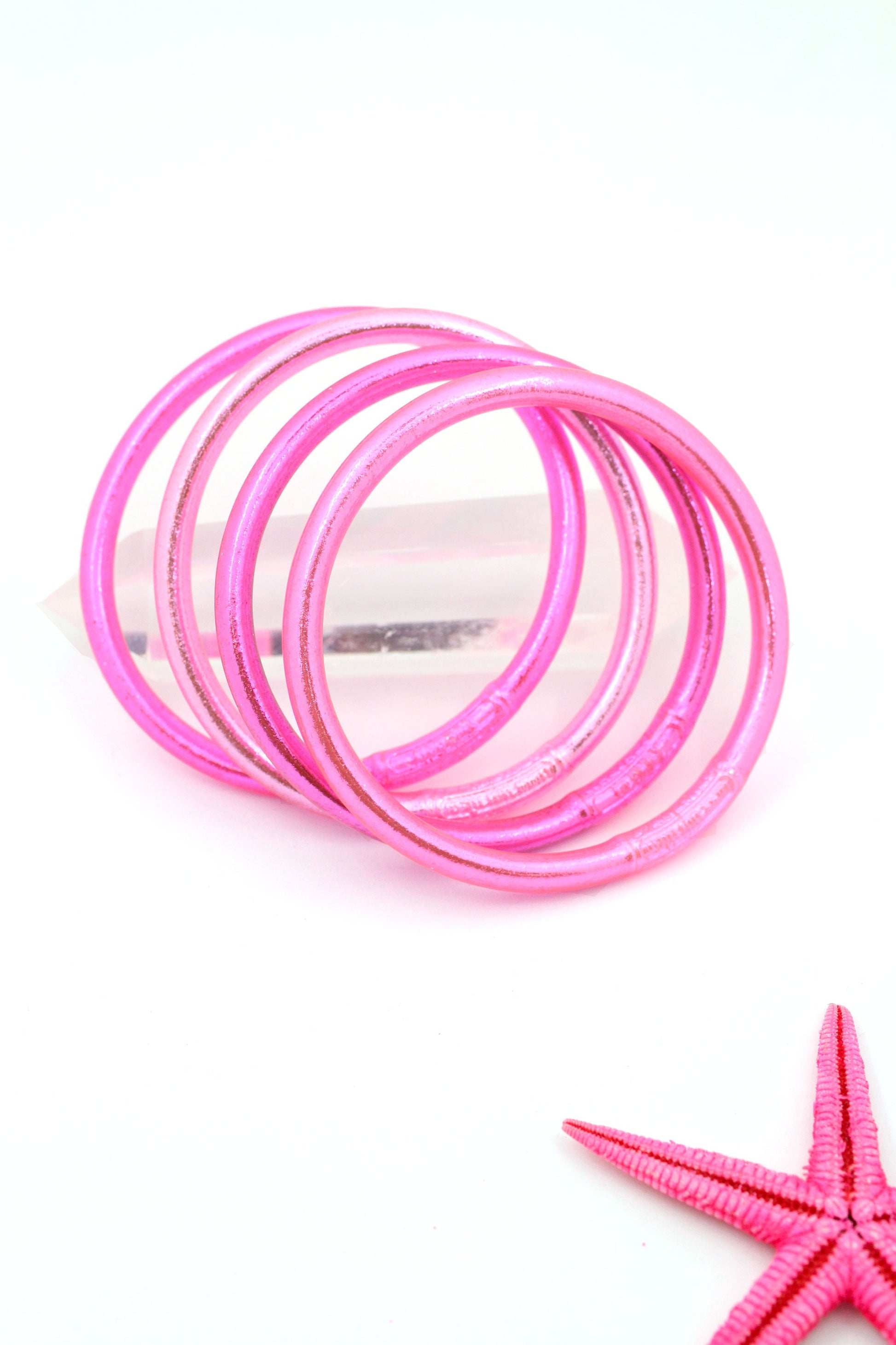 Bangle Color Options: Poppy, Ruby, Flamingo, Fluorescent Pink, Bubblegum, Rose Gold, Champagne, Ginger, Coral, Apricot, Orange, Light Gold, Golden, Fluorescent Yellow, Banana Leaf, Fluorescent Green, Spearmint, Green, Peacock, Ocean, Aqua, Blue Jeans, True Blue, Sapphire, Midnight, Lavender, Veri Peri, Lilac, Sugarplum, Portobella, Violet, Silver, Bronze, Dark Bronze, Cognac
