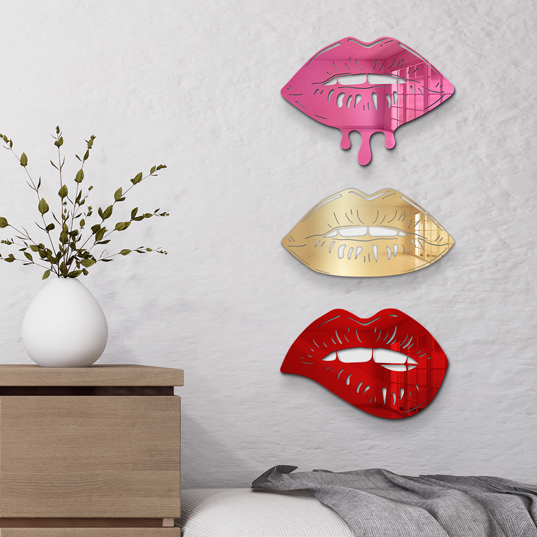 💋   REFINED, FUN & PLAYFUL - You'll love the deep gloss and sleek mirror finish options of this bold statement piece. Make it your centerpiece or mix and match with the dripping, Melting Lips and Biting Lips styles to leave your own creative fashion stamp for your home, studio, apartment, or dorm room. The effect is subtly sexy and fun while still being classy and tasteful. Choose between vibrant red gloss and sleek silver, gold, pink, purple, or red mirror finishes. The acrylic is layered on top of a white PVC back layer, creating a unique 3D effect and allowing the pearly whites and detailing to show through white, regardless of the color of your wall.