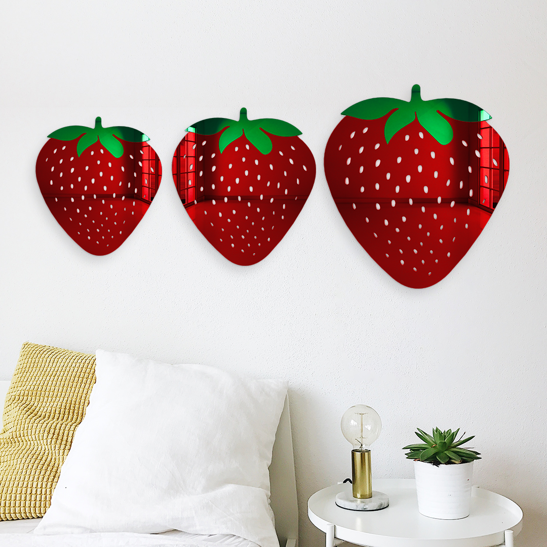 🍓 JUICY FRUIT VIBES - Bring bright summer vibes home year round with this colorful strawberry silhouette decorative wall mirror. Made of acrylic mirror in vibrant shades of red and green, this summer picnic and dessert fave brings a splash of fun color to your walls. Available in three sizes, mix and match for a playful look or use as a standalone statement piece. This piece is incredibly versatile and will work with a range of different styles, decor themes and rooms: from vanity, bedroom, and living room to dorm room, kid’s room, or playroom; from maximalist to minimalist and young to cool.