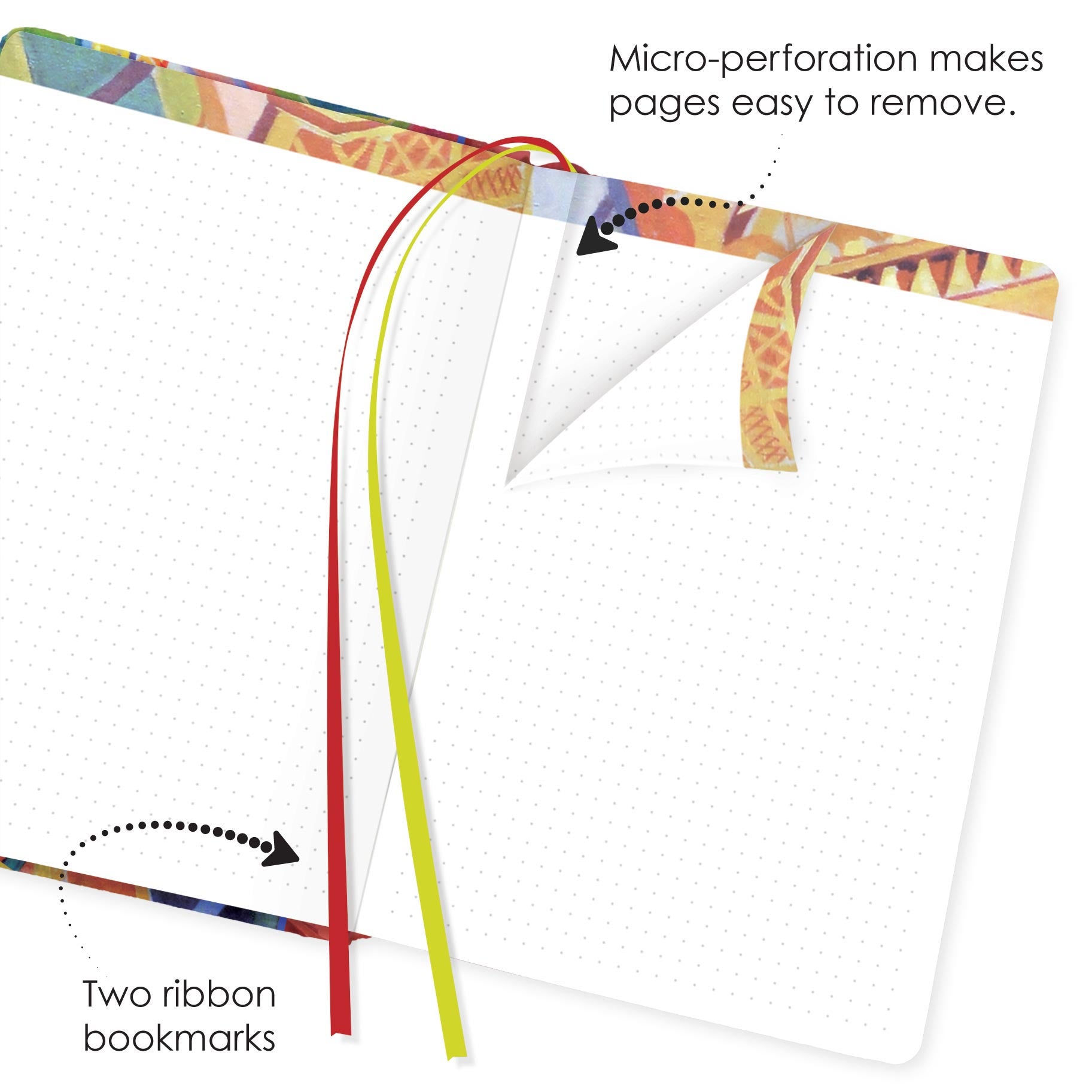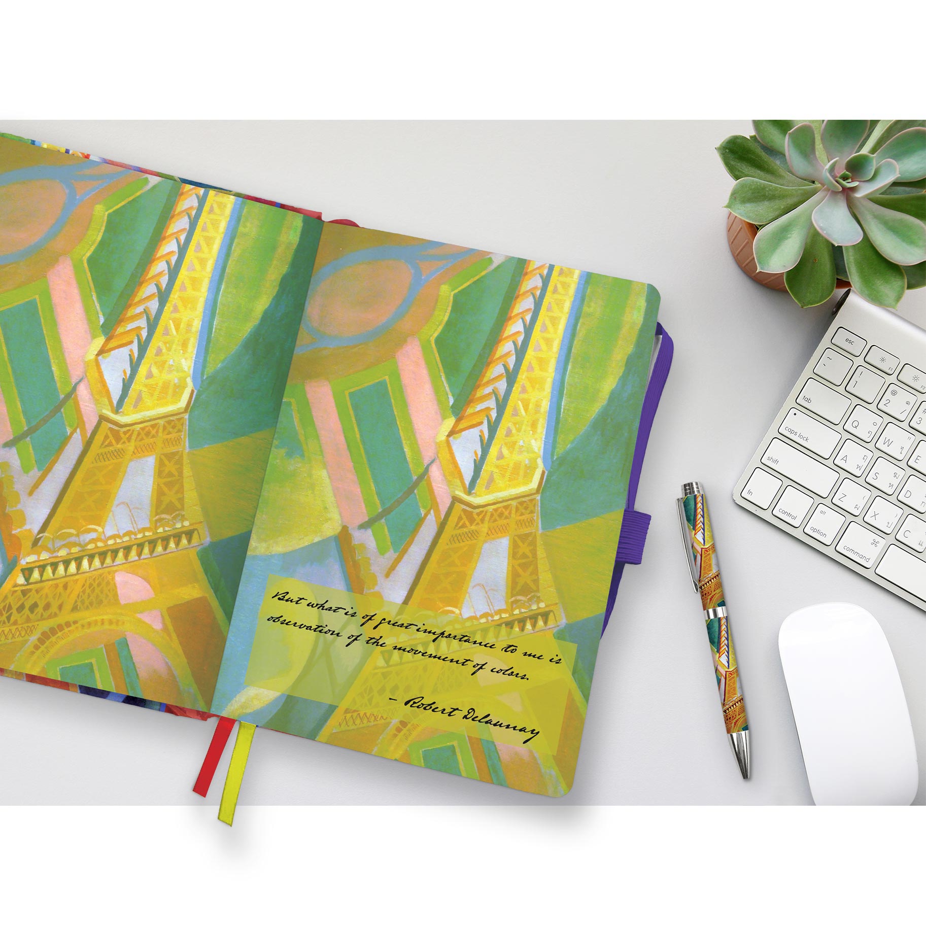 Each vegan leather journal is printed with a fine art masterpiece in vivid colors, with the artist's signature on the spine. Complete with an elastic band to keep it securely closed in your bag, two silky ribbon bookmarks to keep your place, a loop to hold your pen, and an interior pocket for ticket stubs and photographs, this journal is ready to travel wherever you might take it. Each page is micro-perforated for easy tear-out, and thick enough to prevent ink from bleeding through to the other side. With 160 dot grid pages, this luxurious journal makes a perfect gift for students, writers, travelers, and art-lovers of any kind.
