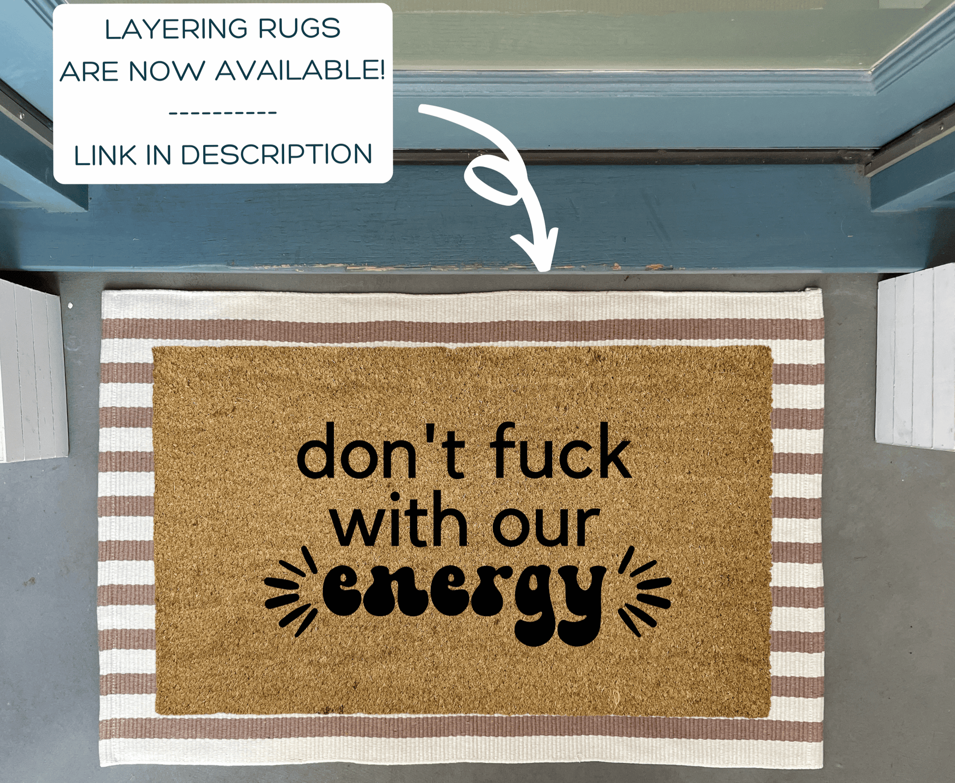 Welcome guests with a playful reminder not to mess with your energy! Our Don't Fuck With Our Energy Doormat is sure to get a chuckle outta anyone who steps foot on your porch! Not only is it fun, but it'll help keep the dirt and dust out of your living space.