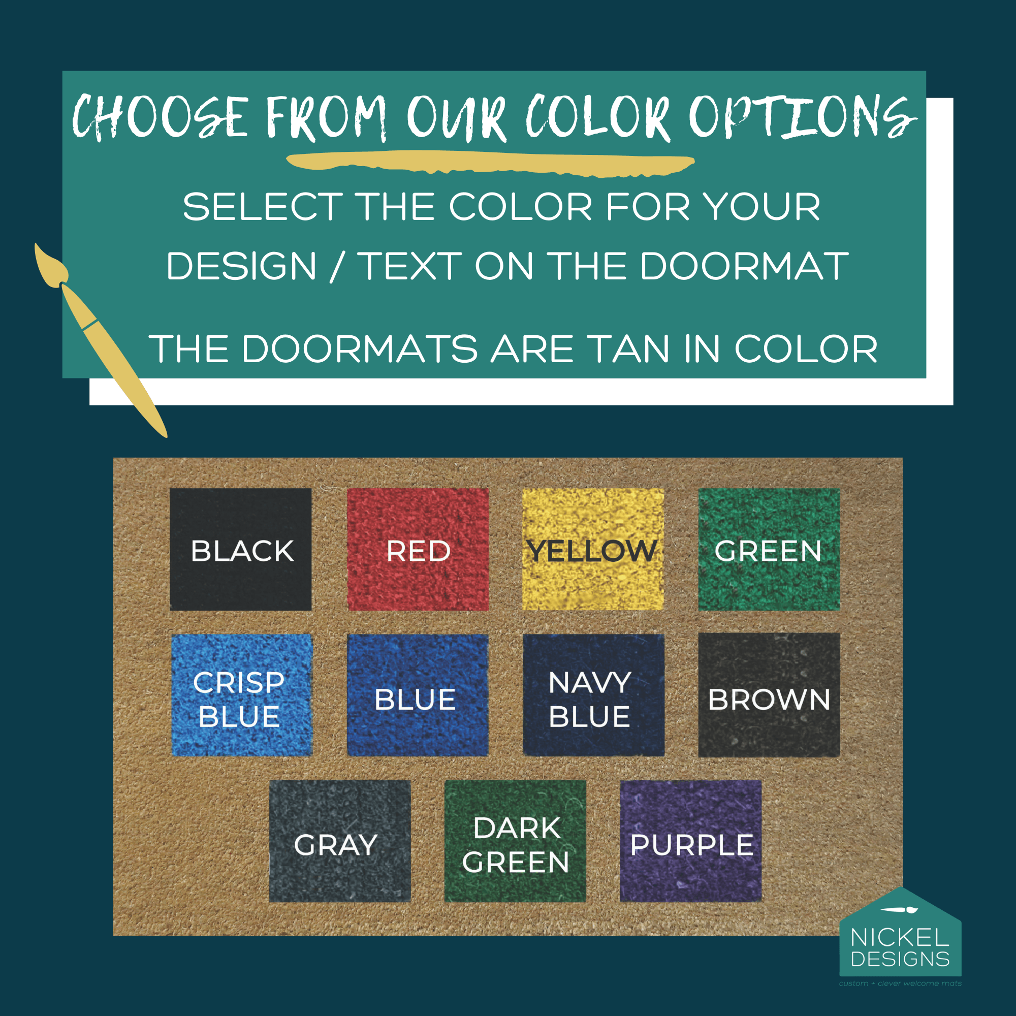 All of our doormats are tan/natural brown in color. The natural coir fibers of the doormat are from the husk of the coconut which is mold and mildew resistant and have an extra-sturdy, thick vinyl backing to ensure they won’t slide around, no matter the surface. Though we use all weather paints and a UV sealant to ensure that your mat is perfect for your doorstep, we suggest that you keep your mat as dry as possible to avoid darkening of the fibers. To clean, simply shake out…easy as that!