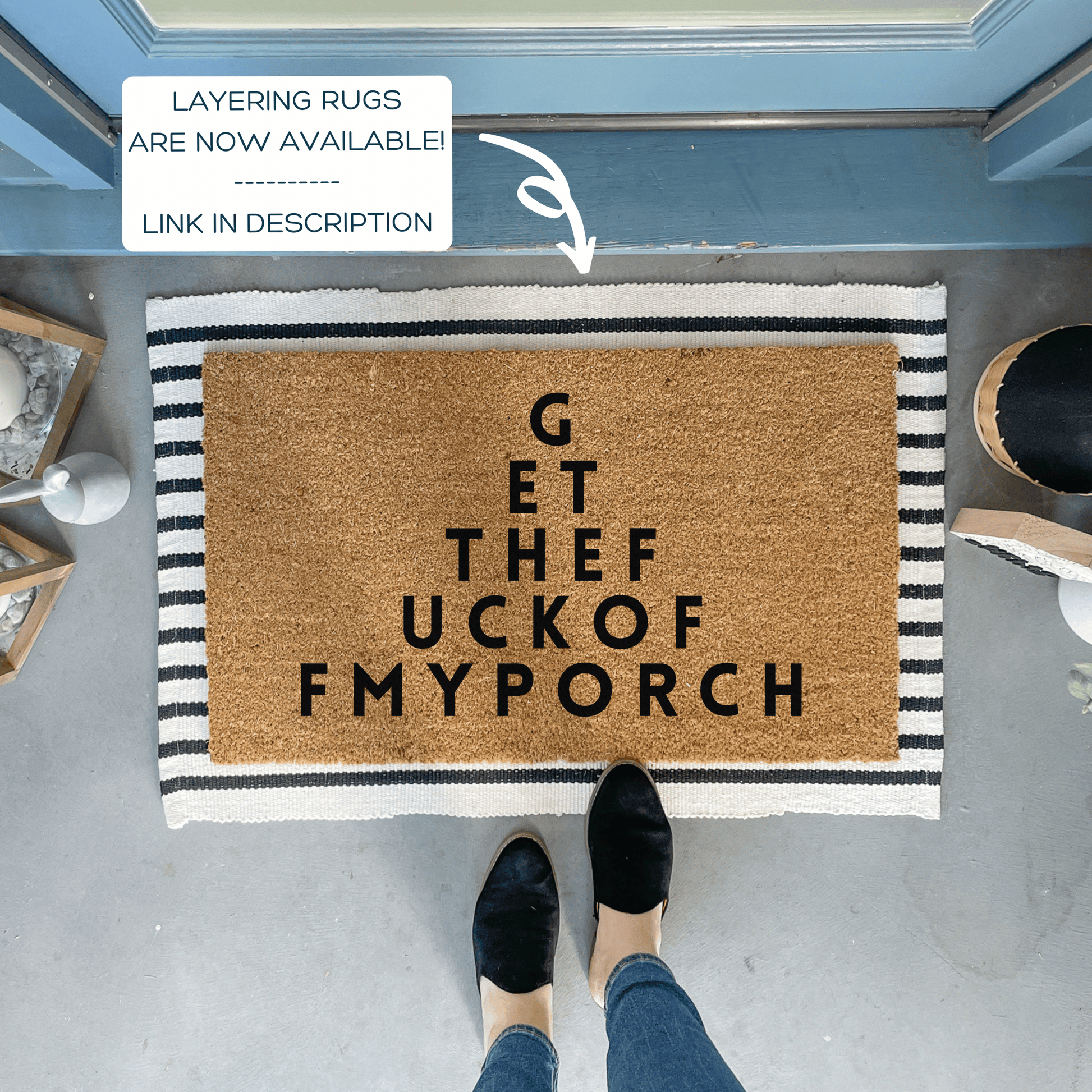 Welcome your guests with a fun and unique statement: Get the fuck off my Porch! Our Get off my Porch Doormat is sure to make a lasting impression and start a conversation. Made with natural coir fibers, this doormat is mold and mildew resistant and perfect for your outdoor space. So, get ready to greet your guests with a humorous message!