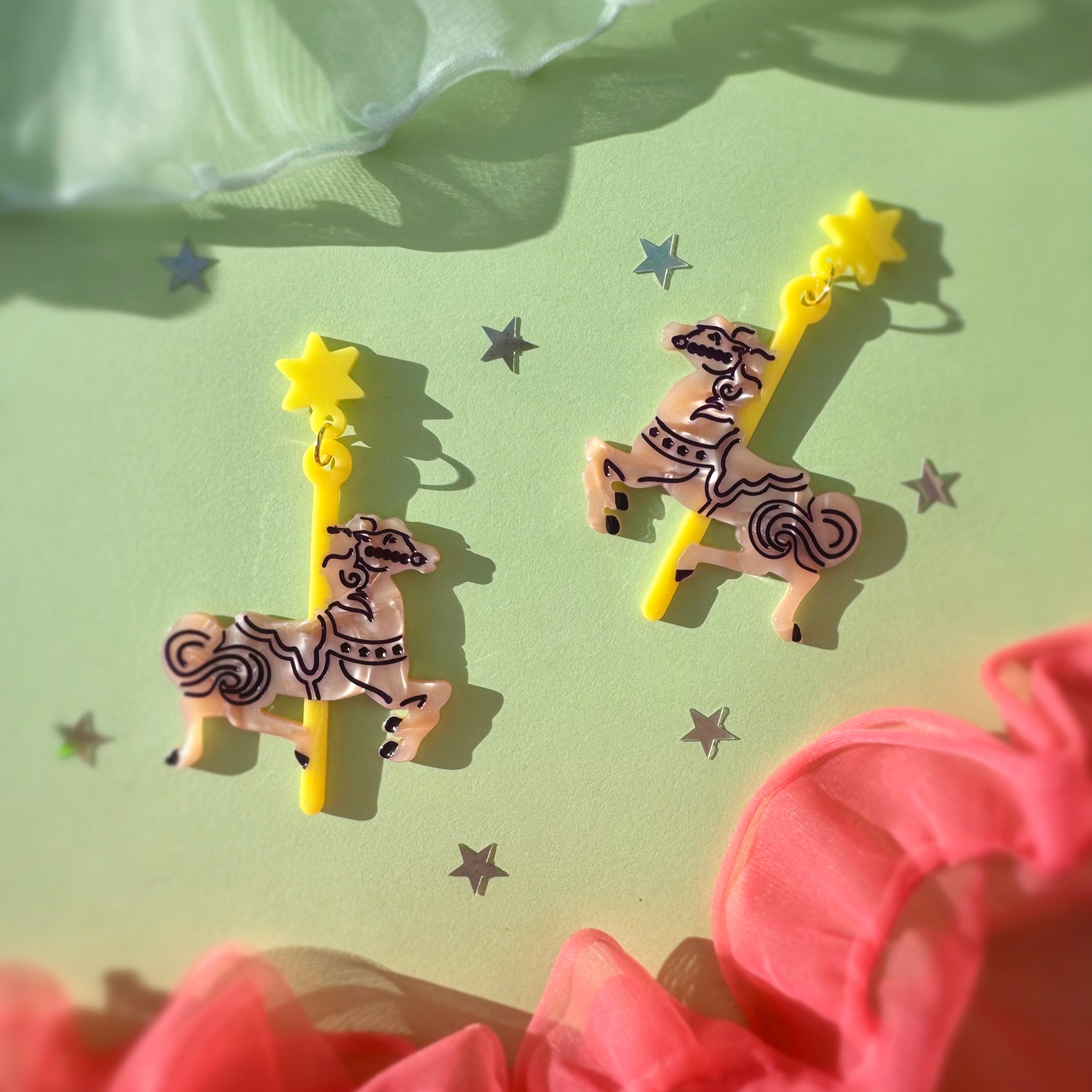 These earrings are about to become the most fun statement piece in your closet. These adorable little tiny carousel horses are the perfect spill of color and whimsy for your look. 2.5" in length.
