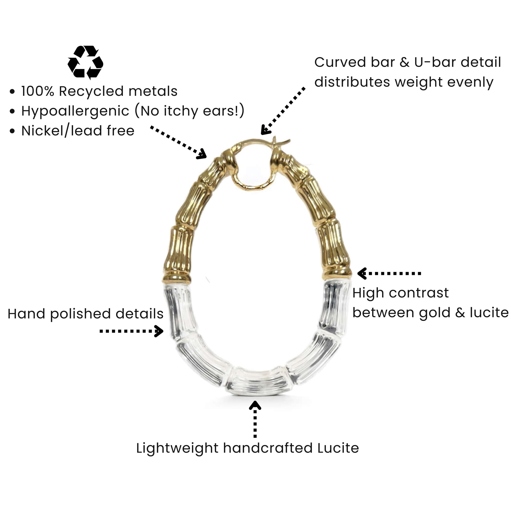 Fit for a queen (or anyone who wants to feel like one). Our Duchess Bamboo Hoops combine regal gold plated bamboo detailing with hand poured clear lucite for a look that’s equal parts sculptural and sleek.