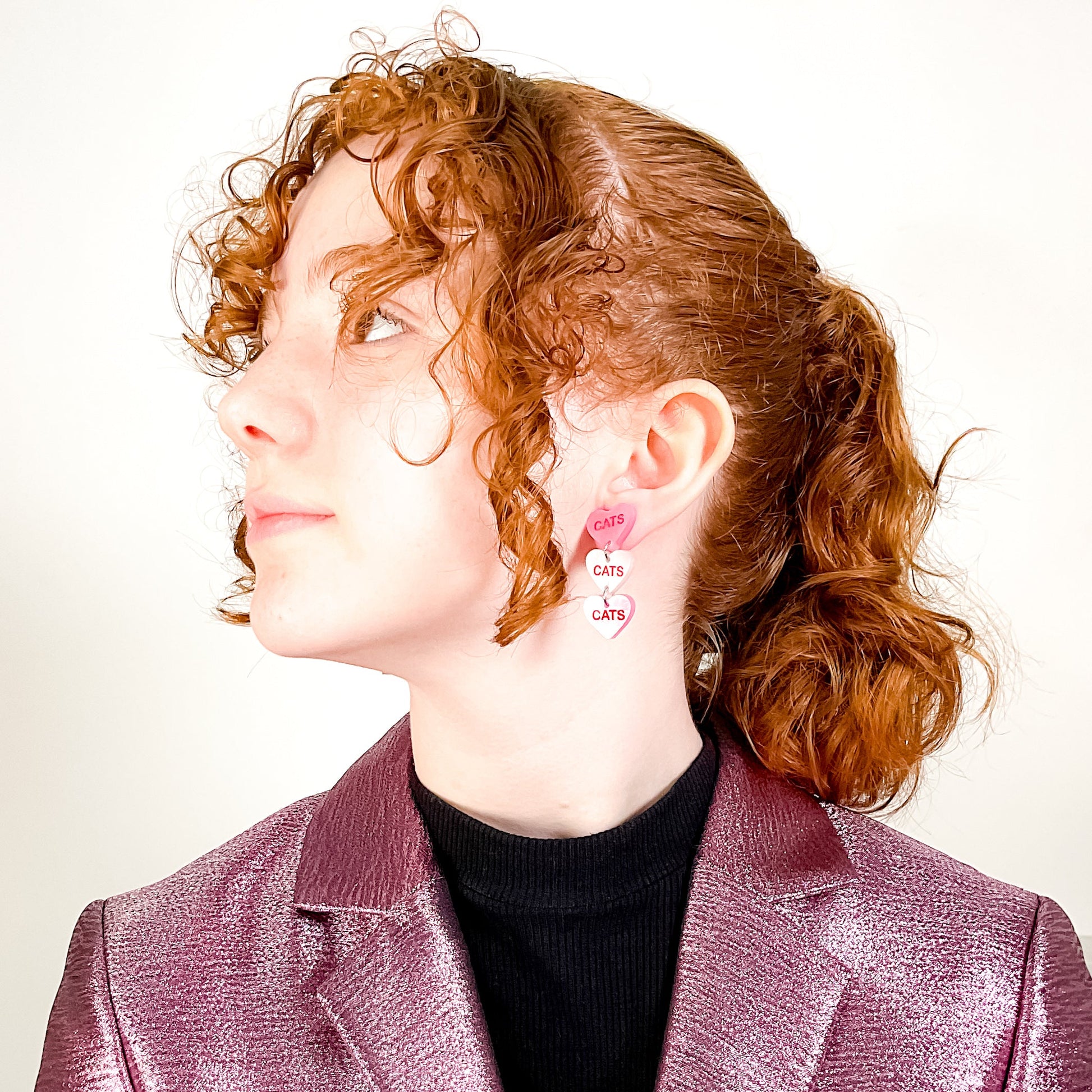 It's Valentine's Day! Here's one for all you cat lovers out there. Someone get NECCO on the phone and tell them to make the candy version of these STAT! This design is our inedible version of the Valentine's Day candy. These earrings are our post dangle style earrings with 'Cats' etched onto each candy heart design. Adorable, sweet, but not sweet enough to eat. They are comprised of pearl pink and pearl white plastic!