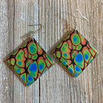 Earrings are made from a lightweight wood base, giclee print front, and are finished with a glossy resin topcoat and silver edge