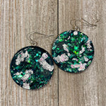 Earrings are made from a lightweight wood base, feature holographic flakes, crushed mica, and silver leaf, and are finished with a glossy resin topcoat and a silver edge.
