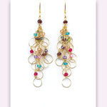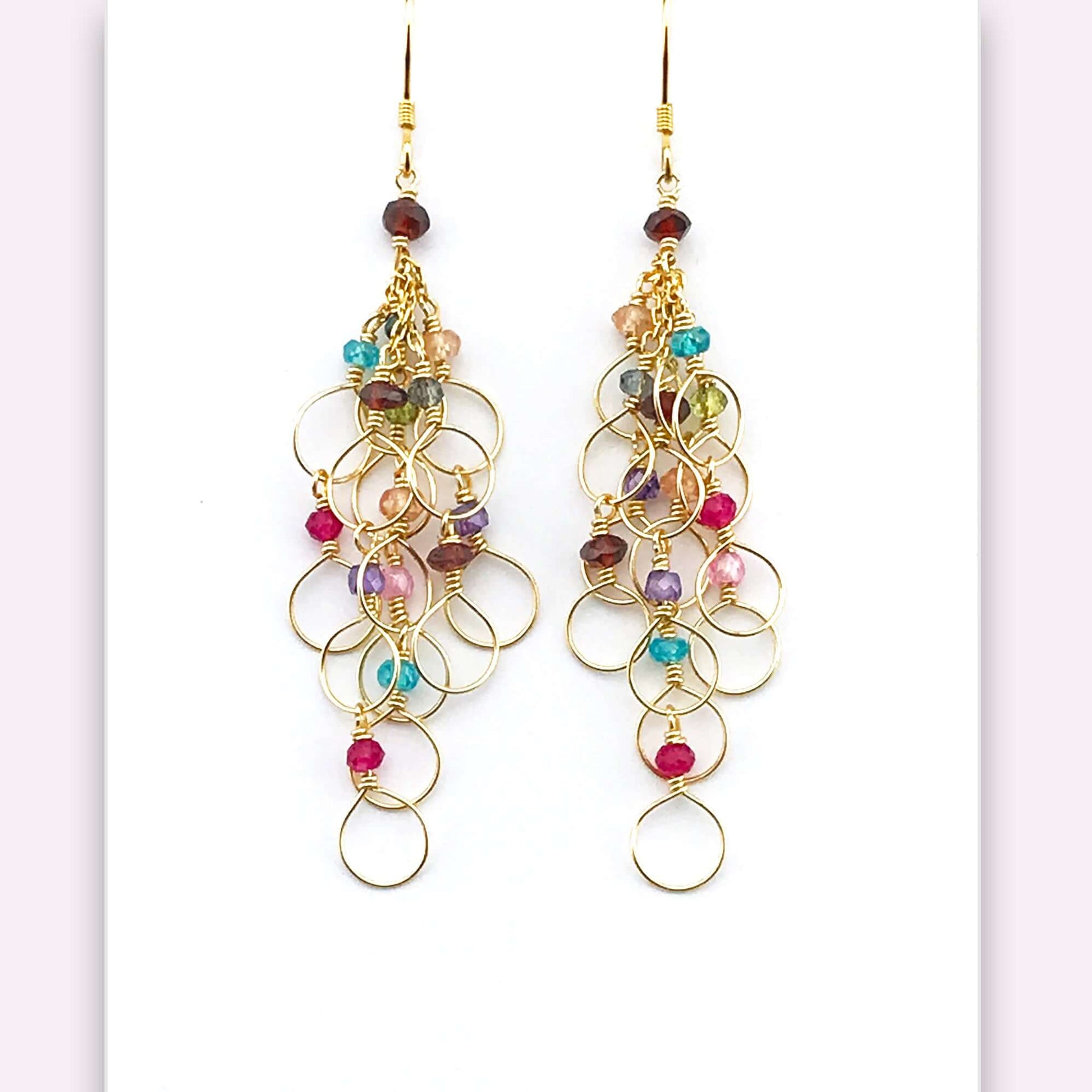 A colorful rainbow of gemstones in garnet, champagne quartz, peridot, amethyst, ruby quartz, blue apatite, pink tourmaline and London Blue quartz.