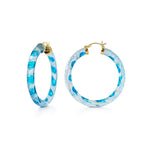 Featured in InStyle Magazine, these lucite hoops are a must have! The hand finished diamond cut sparkles in the light. This elevated lucite hoop design is available in multiple hand painted color options to add a pop of color to your day.