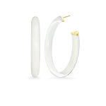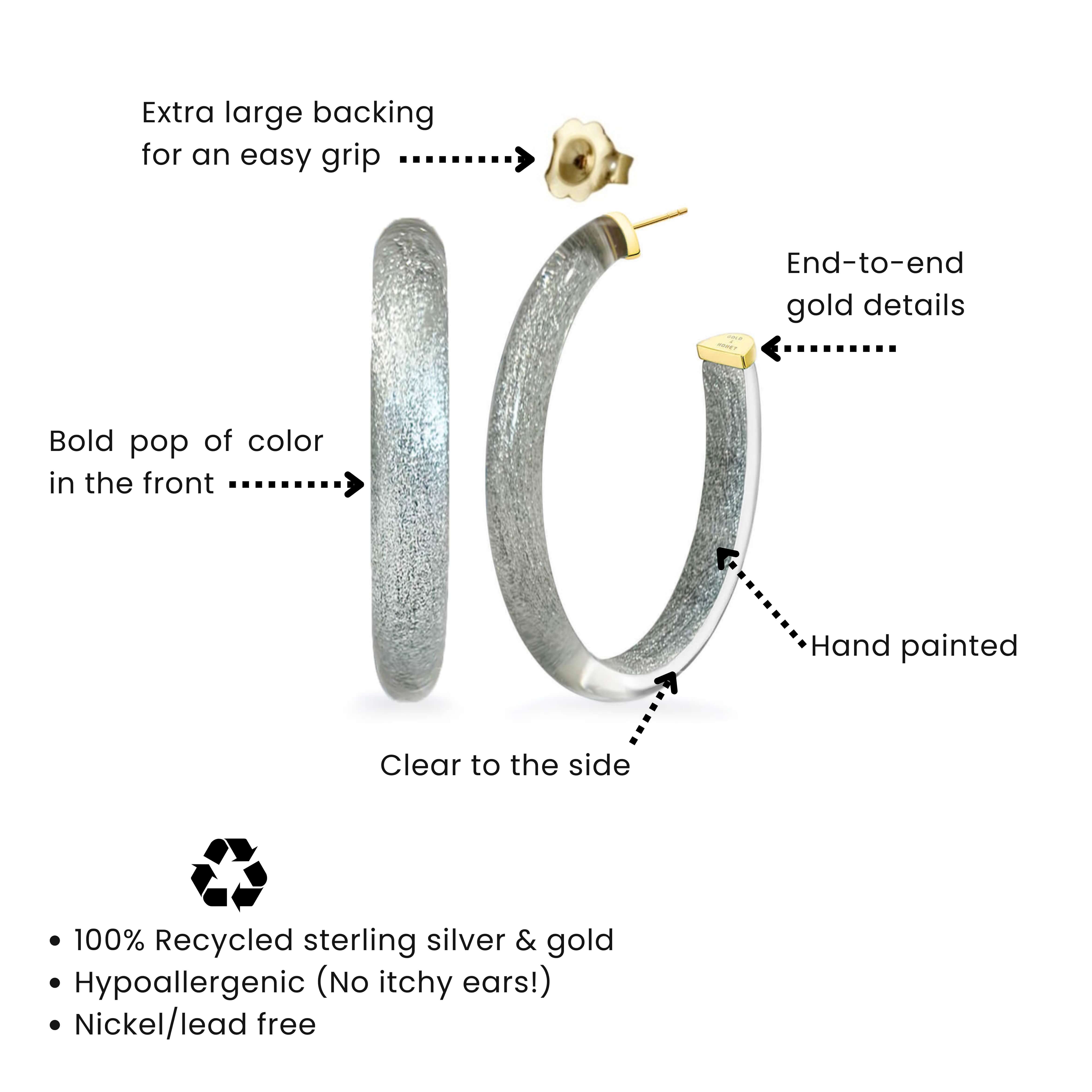 When you look at the hoop from the front, it is full color. When you turn and look from the side, it is clear! Double the fun for a unique design. These large oval hoops feature 14k gold plated sterling silver for a luxe every day look.