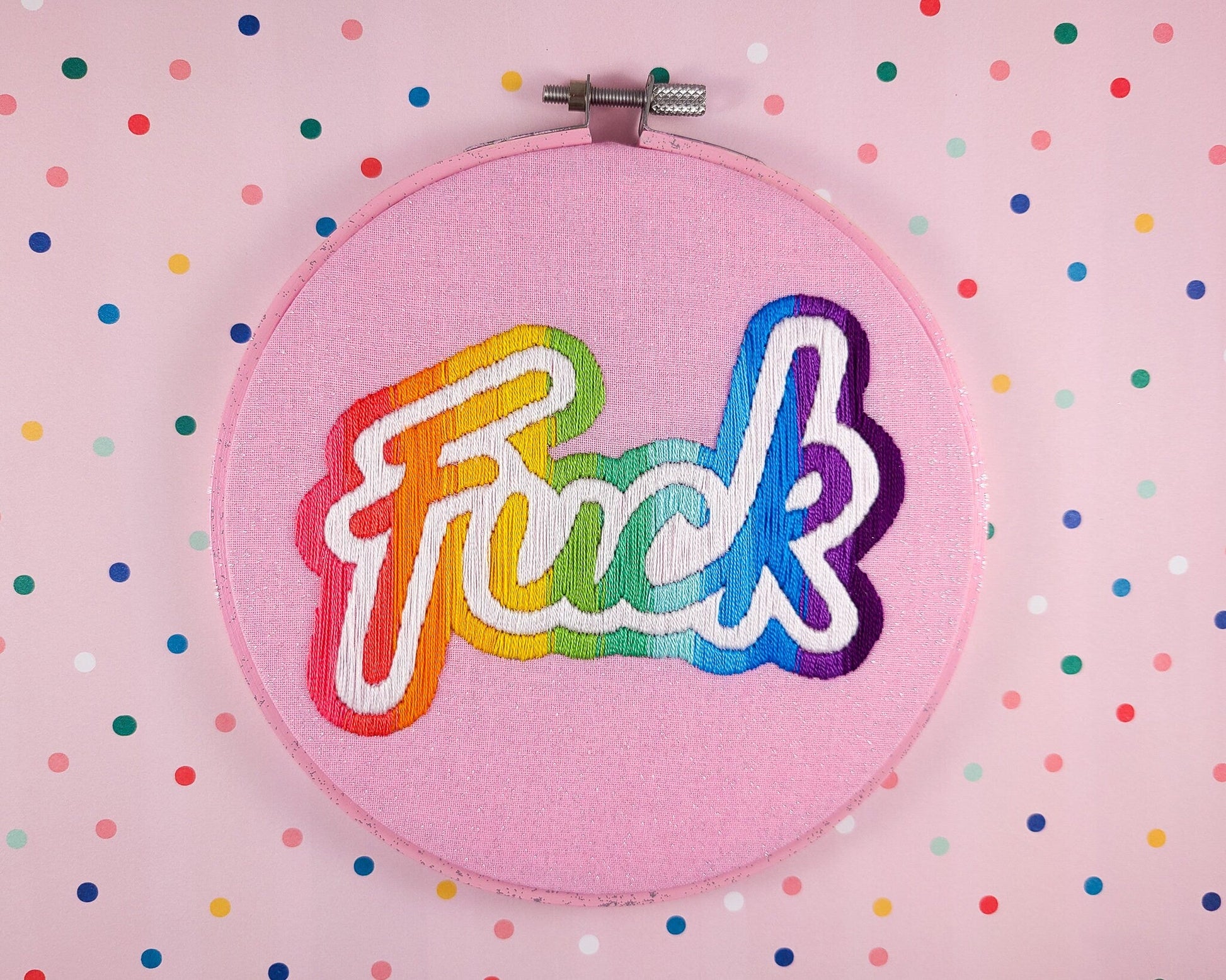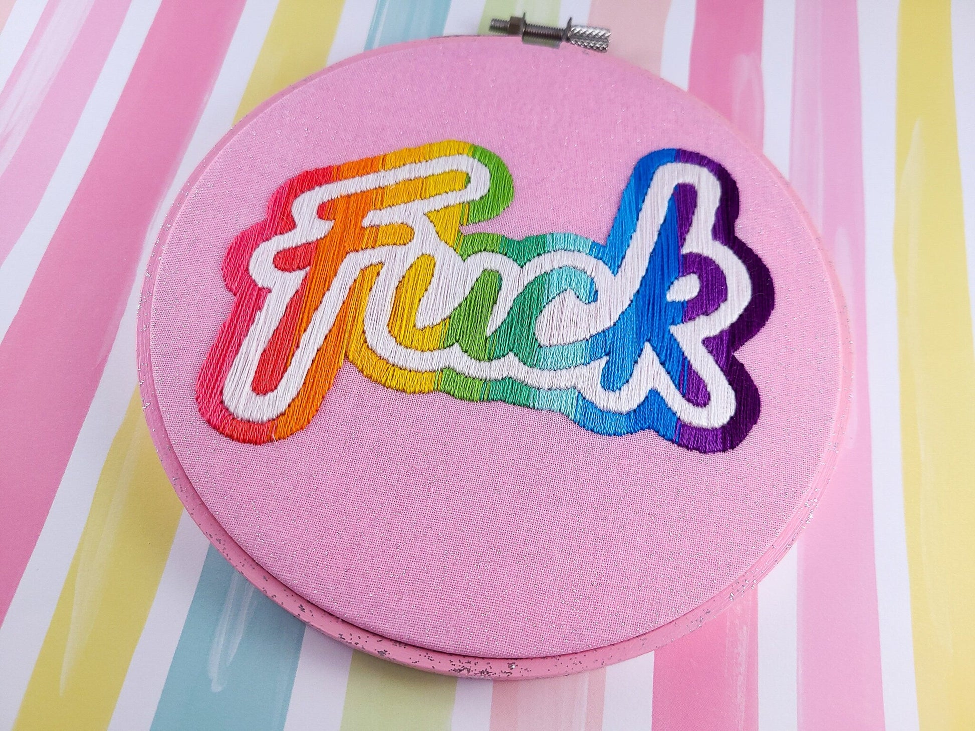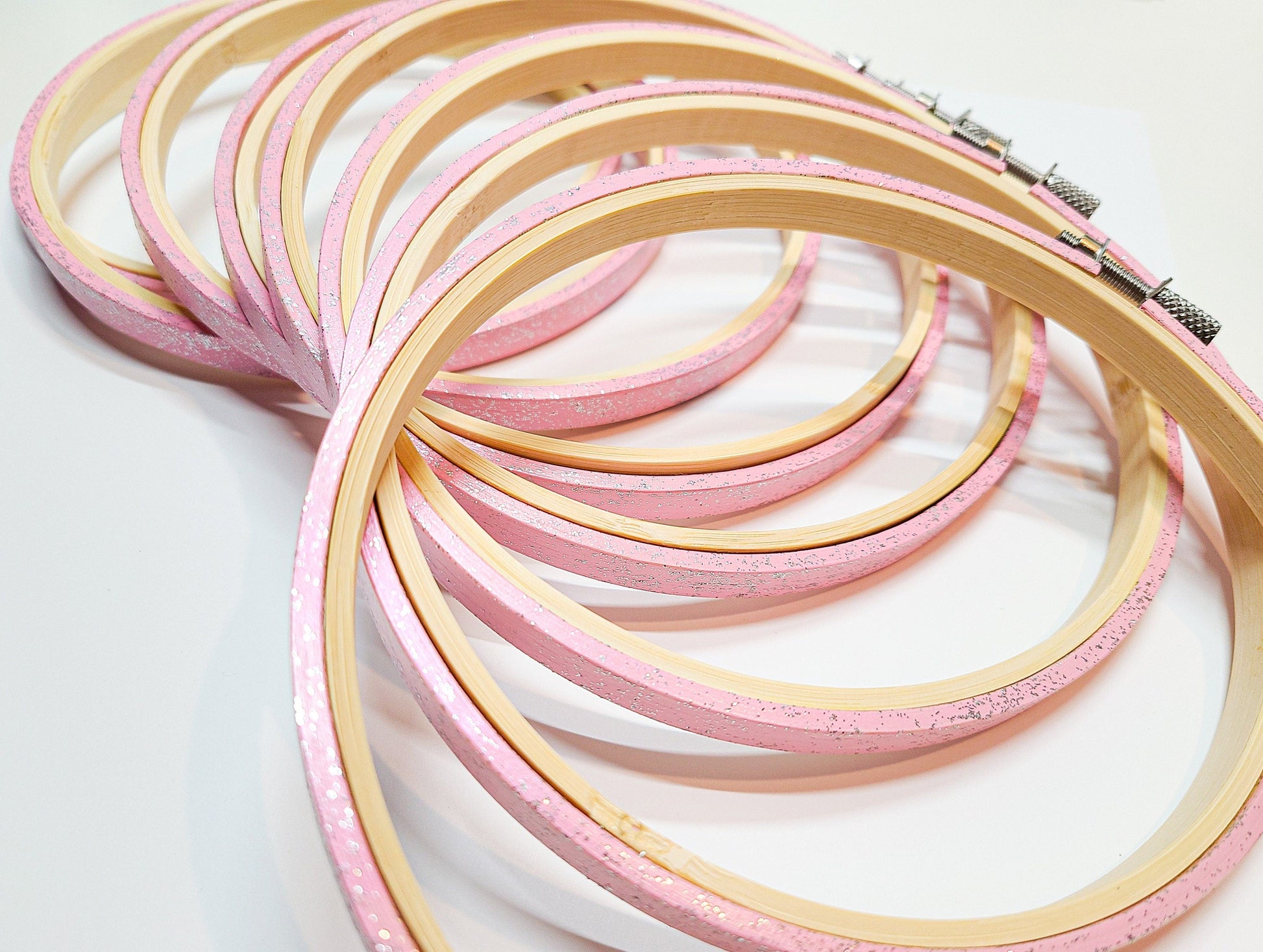 - Hand sanded and hand painted 6" high quality bamboo embroidery hoop with 2 coats of pink and 1 coat of glitter to match the fabric.