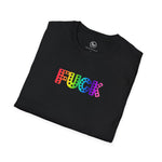 This unisex soft-style t-shirt features a rainbow gradient version of Everyone's Favorite Word. Made from very soft materials, this tee is 100% cotton for solid colors. Heather colors and sports grey include polyester. The shoulders have twill tape for improved durability. There are no side seams. The collar is made with ribbed knitting to prevent curling damage.