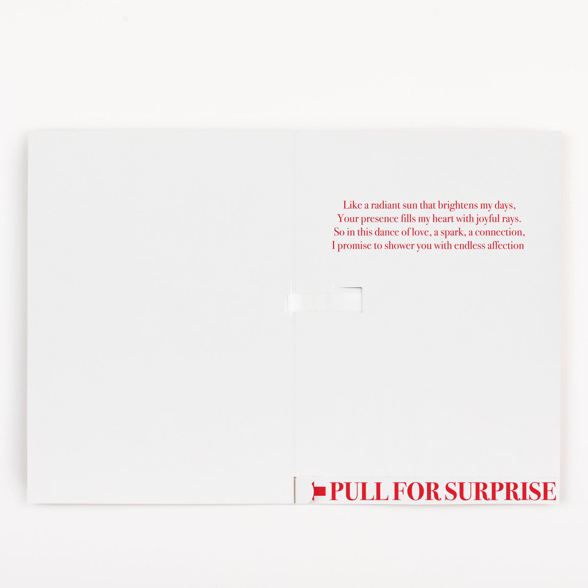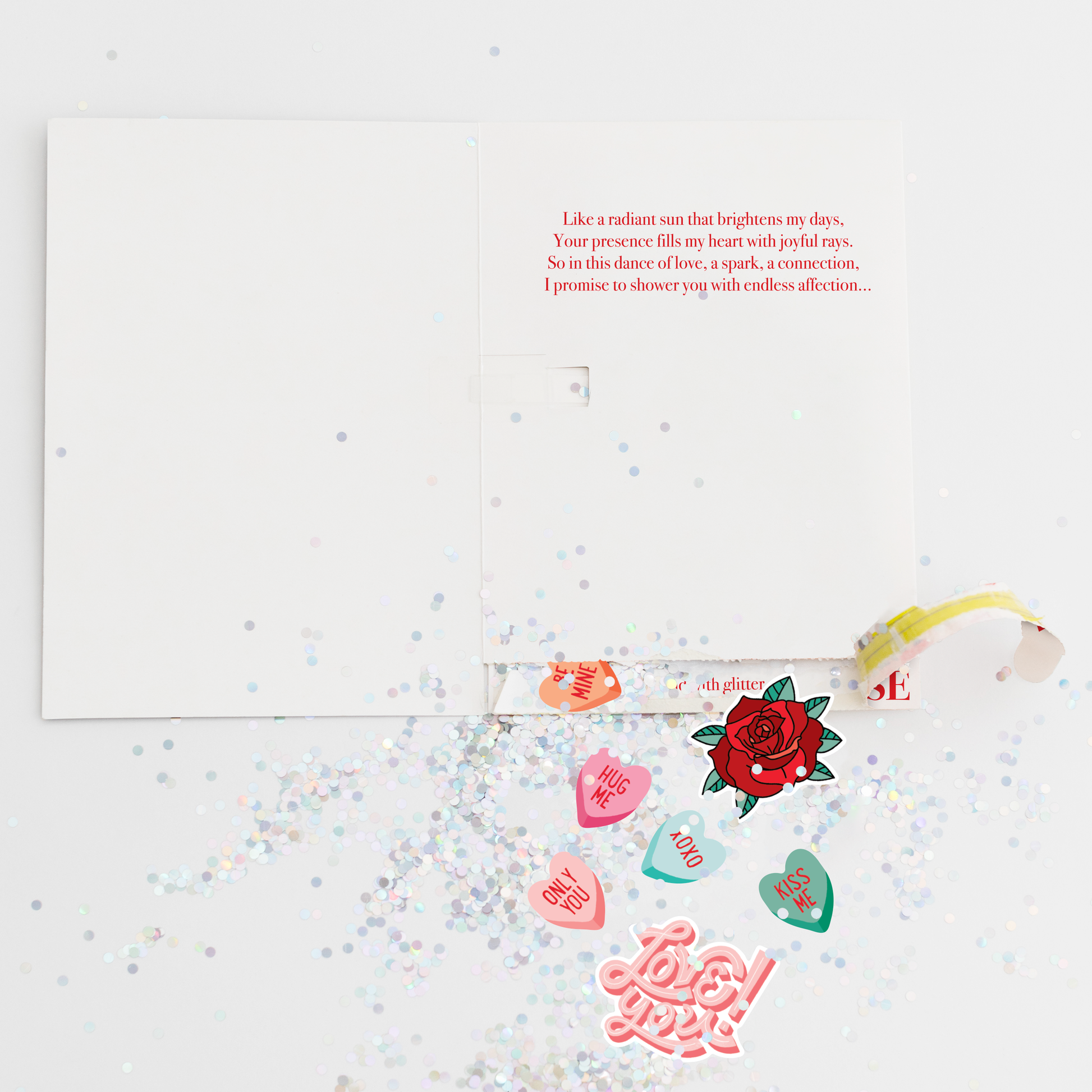 - Bonus Romance - Recipient can pull the special "Pull for Surprise" strip inside the card to reveal hidden large glitter and adorable romantic stickers